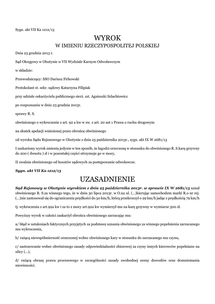 Sygn. akt VII Ka 1212/13 WYROK W IMIENIU RZECZYPOSPOLITEJ POLSKIEJ Dnia 23 grudnia 2013 r. Sąd Okręgowy w Olsztynie w VII Wydziale Karnym Odwoławczym w składzie: Przewodniczący: SSO Dariusz Firkowski Protokolant st. sekr. sądowy Katarzyna Filipiak przy udziale oskarżyciela publicznego sierż. szt. Agnieszki Szlachtowicz po rozpoznaniu w dniu 23 grudnia 2013r. sprawy R. S. obwinionego o wykroczenie z art. 92 a kw w zw. z art. 20 ust 1 Prawa o ruchu drogowym na skutek apelacji wniesionej przez obrońcę obwinionego od wyroku Sądu Rejonowego w Olsztynie z dnia 25 października 2013r., sygn. akt IX W 2681/13 I zaskarżony wyrok zmienia jedynie w ten sposób, że łagodzi orzeczoną w stosunku do obwinionego R. S.karę grzywny do 200 ( dwustu ) zł i w pozostałej części utrzymuje go w mocy, II zwalnia obwinionego od kosztów sądowych za postępowanie odwoławcze. Sygn. akt VII Ka 1212/13 UZASADNIENIE Sąd Rejonowy w Olsztynie wyrokiem z dnia 25 października 2013r. w sprawie IX W 2681/13 uznał obwinionego R. S.za winnego tego, że w dniu 30 lipca 2013r. w O.na ul. (...)kierując samochodem marki R.o nr rej. (...)nie zastosował się do ograniczenia prędkości do 50 km/h, którą przekroczył o 29 km/h jadąc z prędkością 79 km/h tj. wykroczenia z art.92a kw i za to z mocy art.92a kw wymierzył mu na karę grzywny w wymiarze 500 zł. Powyższy wyrok w całości zaskarżył obrońca obwinionego zarzucając mu: a/ błąd w ustaleniach faktycznych przyjętych za podstawę uznania obwinionego za winnego popełnienia zarzucanego mu wykroczenia, b/ rażącą niewspółmierność orzeczonej wobec obwinionego kary w stosunku do zarzucanego mu czynu, c/ zastosowanie wobec obwinionego zasady odpowiedzialności zbiorowej za czyny innych kierowców popełniane na ulicy (...), d/ rażącą obrazę prawa procesowego w szczególności zasady swobodnej oceny dowodów oraz domniemania niewinności. W oparciu o tak sformułowane zarzuty skarżący wniósł o zmianę wyroku i uniewinnienie obwinionego lub ewentualnie o uchylenie zaskarżonego wyroku i przekazanie sprawy do ponownego rozpoznania albo orzeczenie wobec obwinionego kary 100 zł grzywny. . Sąd Okręgowy zważył, co następuje. Apelację należy uznać za trafną jedynie w zakresie postulatu złagodzenia kary. Na wstępie zauważyć należy, że zgromadzone w sprawie dowody Sąd meriti poddał wszechstronnej analizie i ocenie, czemu dał wyraz w pisemnych motywach zaskarżonego wyroku. Przedstawiony w nich tok rozumowania jest zgodny z zasadami logiki i doświadczenia życiowego i w żadnym wypadku nie wykracza poza granice przyznanej Sądowi swobody. Stąd też odnosząc się do zarzutu obrazy przepisów art. 4 k.p.k. i art. 7 k.p.k. należy stwierdzić, że jest on chybiony. Takim samym jest zarzut dotyczący błędu w ustaleniach faktycznych. Zauważyć trzeba, że podnosząc tego rodzaju zarzuty skarżący jedynie polemizuje z ustaleniami faktycznymi Sądu I instancji w istocie nie wykazując jakich to uchybień w zakresie logicznego rozumowania, prowadzących do błędnych wniosków w zakresie stanu faktycznego dopuścił się Sąd I instancji przy ocenie materiału dowodowego. Z uzasadnienia zaskarżonego wyroku wynikają powody rozstrzygnięcia o winie oskarżonego a Sąd Okręgowy w pełni podziela przedstawioną tam argumentację. Apelacja w istocie nie wskazują na takie okoliczności, które nie byłyby przedmiotem uwagi Sądu Rejonowego i nie zawiera też takiej argumentacji, która wnioski tego Sądu mogłaby skutecznie podważyć. W tej sytuacji nie ma potrzeby ponownego przytaczania całości argumentacji zawartej w uzasadnieniu zaskarżonego wyroku, którą Sąd Okręgowy podziela i należy jedynie zaakcentować niektóre elementy, które przemawiają za odmową podzielania stanowiska skarżącego. Przede wszystkim apelacja nie może skutecznie zakwestionować zeznań funkcjonariusza Policji, który rzetelnie i spójnie przedstawił na czym polegało zachowanie obwinionego. Faktycznie argumenty zawarte w środku odwoławczym sprowadzają się do uogólnień i generalizacji. Tymczasem T. L. w logiczny sposób wskazał dlaczego chybione jest stwierdzenie, że pomiar dotyczył innego pojazdu niż tego, którym kierował obwiniony. Istotne jest przy tym wskazanie, że funkcjonariusz był umiejscowiony po prawej stronie drogi i tym samym pomiar pojazdu poruszającego się po łuku w lewo nie był ograniczony. Ponadto w ślad za Sądem I instancji wskazać należy, że pomiar prędkości został dokonany po zmianie przez obwinionego pasa ruchu. Wreszcie policjant był dla R. S. osobą obcą i nie miał powodu aby go bezpodstawnie obciążać. Zaobserwowane zdarzenie po jego zaistnieniu odzwierciedlił w notatce służbowej, która została sporządzona w dniu zdarzenia tj. 30 lipca 2013r. i wynika z niej między innymi rodzaj urządzenia mierzącego prędkość pojazdu obwinionego oraz wielkość tej ostatniej. W tej sytuacji brak było podstaw do uznania obwinionego za niewinnego odnośnie zarzucanego mu czynu. Nie sposób jednakże do końca zaakceptować stanowiska Sądu Rejonowego odnośnie orzeczenia o karze. Mając bowiem na uwadze okoliczności zdarzenia oraz wysokość proponowanego obwinionemu mandatu a także obecny stan zdrowia R. S. uznać należy, że także niższa kara grzywny pozwoli na osiągnięcie celów z art.33 i art34 kw. Sąd Okręgowy mając powyższe na uwadze zaskarżony wyrok w tym zakresie zmienił w ten sposób, że orzekł wobec obwinionego R. S.karę 200 zł grzywny i w pozostałej części jako prawidłowy utrzymał go w mocy- art.437§2 kpk i art.438pkt.2-4 kpk w zw. z art.109 kpw. O kosztach za postępowanie odwoławcze orzeczono na podstawie art.624§1kpk w zw. z art.119 kpw albowiem przemawia za tym sytuacja osobista i majątkowa obwinionego.