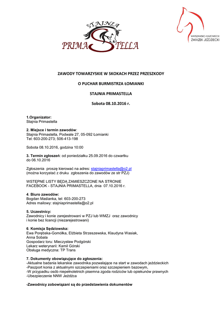 ZAWODY TOWARZYSKIE W SKOKACH PRZEZ PRZESZKODY O PUCHAR BURMISTRZA ŁOMIANKI STAJNIA PRIMASTELLA Sobota 08.10.2016 r. 1.Organizator: Stajnia Primastella 2. Miejsce i termin zawodów: Stajnia Primastella, Podwale 27, 05-092 Łomianki Tel: 603-200-273; 506-413-198 Sobota 08.10.2016, godzina 10:00 3. Termin zgłoszeń: od poniedziałku 25.09.2016 do czwartku do 06.10.2016 Zgłoszenia proszę kierować na adres: [email protected] (można korzystać z druku zgłoszenia do zawodów ze str PZJ) WSTĘPNE LISTY BĘDĄ ZAMIESZCZONE NA STRONIE FACEBOOK - STAJNIA PRIMASTELLA, dnia 07.10.2016 r. 4. Biuro zawodów: Bogdan Maślanka, tel: 603-200-273 Adres mailowy: [email protected] 5. Uczestnicy: Zawodnicy i konie zarejestrowani w PZJ lub WMZJ oraz zawodnicy i konie bez licencji (niezarejestrowani) 6. Komisja Sędziowska: Ewa Porębska-Gomółka, Elżbieta Strzeszewska, Klaudyna Wasiak, Anna Sobala Gospodarz toru: Mieczysław Podgórski Lekarz weterynarii: Kamil Górski Obsługa medyczna: TP Trans 7. Dokumenty obowiązujące do zgłoszenia: -Aktualne badania lekarskie zawodnika pozwalające na start w zawodach jeździeckich -Paszport konia z aktualnymi szczepieniami oraz szczepieniem bazowym, -W przypadku osób niepełnoletnich pisemna zgoda rodziców lub opiekunów prawnych -Ubezpieczenie NNW Jeźdźca -Zawodnicy zobowiązani są do przedstawienia dokumentów i wniesienia opłat, przed rozpoczęciem konkursu w którym biorą udział. 8. Opłaty - Wpisowe 100 zł/koń - Konkursy od 1-5 – 15 zł, a konkursy 6 i 7 – 20 zł - Zgodnie z Przepisami B PZJ zmiany na listach startowych powinny być wniesione do 30 minut przed rozpoczęciem konkursu. Po tym terminie, jak również w innych przypadkach obowiązuje opłata manipulacyjna w wysokości 30 zł - Rezerwacja boksu – 50 zł – ilość boksów ograniczona 9. Warunki techniczne: Parkur: podłoże piaskowe Rozprężalnia: podłoże piaskowe 10. Program zawodów: Konkurs nr 1, zwykły, wysokość 60 cm bez szeregów (art. 238.2.1) Konkurs nr 2, Debiuty, dokładności, wys. 70 cm (art. 238.1.1) Konkurs nr 3, 70 cm Konkurs przebierany, bez szeregów, dokładności (238.1.1) (klasyfikacja medalowa tylko osób przebranych), (art. 238.1.1) (przebranie nie zwalnia z obowiązku noszenia nakrycia głowy zgodnie z przepisami, butów jeździeckich) Główna nagroda - przebranie. Konkurs nr 4, Klasa LL z trafieniem w normę czasu, wysokość 80 cm (art.238.1.1) Konkurs nr 5 Klasa LL1, dokładności, wysokość 90 cm (art. 238.1.1) Konkurs nr 6, Klasa L, dwufazowy, zwykły, zwykły - wysokość 100 cm (art. 274.5.3) Konkurs nr 7 L1, z Jokerem (105 cm) (art. 269.5) Zachęcamy zawodników do zgłoszeń do przejazdów szkoleniowych w dowolnie wybranej klasie. Takie przejazdy będą dopuszczalne pod warunkiem, że w konkursach podstawowych nie będzie maksymalnej, dopuszczalnej ilości przejazdów. Zgłoszenie takie powinno nastąpić w terminie zgodnym z propozycjami zawodów, ze wskazaniem wybranego konkursu. Przejazd będzie traktowany jako trening, a jego wynik nie będzie zaliczany do oficjalnych wyników zawodów towarzyskich. 11. Zawody rozgrywane zgodnie z Przepisami i Regulaminem PZJ. Zawodników i konie obowiązuje dokumentacja wg regulaminów i przepisów PZJ. 12. Wszystkie konkursy są konkursami towarzyskimi i rozgrywane są zgodnie z Uchwałą PZJ z dnia 06.02.2013 r. oraz z równą dbałością o konie, zawodników i rywalizację sportową, Jak konkursy Zawodów Oficjalnych. 13. Zgodnie z Regulaminem B PZJ 2016: - w czasie zawodów ZTiR-B dozwolony jest dwukrotny start konia w ciągu jednego dnia zawodów (art. 4 pkt. 2 - tabela) - w tym samym konkursie, dwukrotny start konia - pod tym samym lub różnymi zawodnikami - jest dozwolony w konkursach do klasy L1 włącznie. Jeżeli na tym samym koniu, w tym samym konkursie startuje ten sam zawodnik, to w konkursach, w których o zwycięstwie decyduje czas przejazdu zalicza się tylko wynik pierwszego startu (art. 4 pkt. 3). 14. Nie przewiduje się odprawy technicznej. Zawodnicy zobowiązani są do przedstawienia dokumentów i wniesienia opłat na min. 1 godzinę przed rozpoczęciem konkursów. 15. Nagrody: - Flots dla każdego zawodnika - Puchary za trzy pierwsze miejsca - Nagrody rzeczowe dla min. pierwszych trzech miejsc 16. Inrofmacje ogólne: Dzieci do 13-go roku życia dodatkowo obowiązuje kamizelka ochronna na kręgosłup. 17. Wstęp na zawody bezpłatny. Katering – bar na terenie zawodów. 18. Organizator nie ponosi odpowiedzialności za kradzieże, wypadki i inne szkody mogące powstać w trakcie zawodów oraz w czasie transportu na i po zawodach. 19. Organizator zastrzega sobie prawo do korekt w programie i propozycjach zawodów. 20. Organizator zastrzega sobie prawo do odwołania zawodów bez podawania przyczyny w terminie 24 h przed planowaną datą zawodów. KODEKS POSTĘPOWANIA Z KONIEM I. Na wszystkich etapach treningu i przygotowań konia do startu w zawodach, dobrostan konia musi stać ponad wszelkimi innymi wymaganiami. Dotyczy to stałej opieki, metod treningu, starannego obrządku, kucia oraz transportu. II. Konie i jeźdźcy muszą być zdrowi, kompetentni i wytrenowani, zanim wezmą udział w zawodach. Dotyczy to także stosowanych leków, środków medycznych oraz zabiegów chirurgicznych zagrażających dobrostanowi konia lub ciąży klaczy, oraz przypadków nadużywania pomocy medycznej. III. Zawody nie mogą zagrażać dobrostanowi konia. Należy zwracać szczególną uwagę na teren zawodów, stan techniczny podłoża, warunki stajenne i atmosferyczne, kondycję koni i ich bezpieczeństwo, także podczas podroży powrotnej z zawodów. IV. Należy dołożyć wszelkich starań, aby zapewnić koniom staranną opiekę po zakończeniu zawodów, a także humanitarne traktowanie po zakończeniu kariery sportowej. Dotyczy to właściwej opieki weterynaryjnej, leczenia obrażeń odniesionych na zawodach, spokojnej starości, ewentualnie eutanazji. V. Polski Związek Jeździecki usilnie