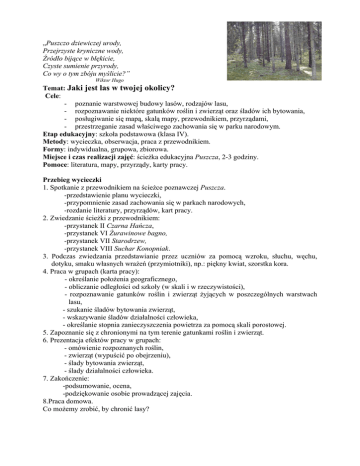 „Puszczo dziewiczej urody, Przejrzyste kryniczne wody, Źródło bijące w błękicie, Czyste sumienie przyrody, Co wy o tym zbóju myślicie?” Wiktor Hugo Temat: Jaki jest las w twojej okolicy? Cele: - poznanie warstwowej budowy lasów, rodzajów lasu, - rozpoznawanie niektóre gatunków roślin i zwierząt oraz śladów ich bytowania, - posługiwanie się mapą, skalą mapy, przewodnikiem, przyrządami, - przestrzeganie zasad właściwego zachowania się w parku narodowym. Etap edukacyjny: szkoła podstawowa (klasa IV). Metody: wycieczka, obserwacja, praca z przewodnikiem. Formy: indywidualna, grupowa, zbiorowa. Miejsce i czas realizacji zajęć: ścieżka edukacyjna Puszcza, 2-3 godziny. Pomoce: literatura, mapy, przyrządy, karty pracy. Przebieg wycieczki 1. Spotkanie z przewodnikiem na ścieżce poznawczej Puszcza. -przedstawienie planu wycieczki, -przypomnienie zasad zachowania się w parkach narodowych, -rozdanie literatury, przyrządów, kart pracy. 2. Zwiedzanie ścieżki z przewodnikiem: -przystanek II Czarna Hańcza, -przystanek VI Żurawinowe bagno, -przystanek VII Starodrzew, -przystanek VIII Suchar Konopniak. 3. Podczas zwiedzania przedstawianie przez uczniów za pomocą wzroku, słuchu, węchu, dotyku, smaku własnych wrażeń (przymiotniki), np.: piękny kwiat, szorstka kora. 4. Praca w grupach (karta pracy): - określanie położenia geograficznego, - obliczanie odległości od szkoły (w skali i w rzeczywistości), - rozpoznawanie gatunków roślin i zwierząt żyjących w poszczególnych warstwach lasu, - szukanie śladów bytowania zwierząt, - wskazywanie śladów działalności człowieka, - określanie stopnia zanieczyszczenia powietrza za pomocą skali porostowej. 5. Zapoznanie się z chronionymi na tym terenie gatunkami roślin i zwierząt. 6. Prezentacja efektów pracy w grupach: - omówienie rozpoznanych roślin, - zwierząt (wypuścić po obejrzeniu), - ślady bytowania zwierząt, - ślady działalności człowieka. 7. Zakończenie: -podsumowanie, ocena, -podziękowanie osobie prowadzącej zajęcia. 8.Praca domowa. Co możemy zrobić, by chronić lasy? Karta pracy ................................................................................................ Data i miejsce zajęć .................................................................................................. Imię i nazwisko ucznia – lidera grupy Jaki jest las na ścieżce Puszcza? 1. Określ gdzie się znajdujesz? - region..................................................................................................................... - rodzaj środowiska (typ lasu)................................................................................... - miejsce zwiedzania................................................................................................. 2. Wyznacz kierunki w terenie, zorientuj mapę, zaznacz miejsce przebywania, określ, w którym kierunku znajduje się szkoła. ....................................................................................................................................................... 3. Za pomocą mapy, oblicz odległości ze szkoły do miejsca zajęć. - skala mapy ......................................... - odległość w cm .................................. - odległość w km .................................. 4. Wpisz w tabeli odpowiednie organizmy. Piętro lasu Zwierzęta Ściółka Runo Podszyt Drzewa Rośliny Inne 5. Wskaż ślady: bytowania zwierząt .............................................................................. działalności człowieka ......................................................................... 6. Dowiedz się, czy na danym terenie występują chronione: rośliny (jakie?) .................................................................................... zwierzęta (jakie?) ................................................................................. 7.*Określ stopień zanieczyszczenia powietrza za pomocą skali porostowej: - odszukaj miejsce występowania porostów, - określ ich nazwy, wskaż gatunek najliczniejszy, - porównaj ze skalą porostową i określ stopień zanieczyszczenia powietrza: .......................................................................................................................................................