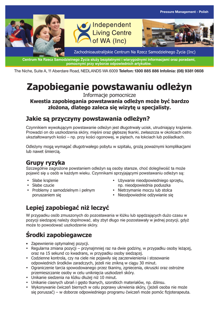 Pressure Management - Polish Zachodnioaustralijskie Centrum Na Rzecz Samodzielnego Życia (Inc) Centrum Na Rzecz Samodzielnego Życia służy bezpłatnymi i wiarygodnymi informacjami oraz poradami, pomocnymi przy wyborze odpowiednich artykułów. The Niche, Suite A, 11 Aberdare Road, NEDLANDS WA 6009 Telefon: 1300 885 886 Infolinia: (08) 9381 0608 Zapobieganie powstawaniu odleżyn Informacje pomocnicze Kwestia zapobiegania powstawania odleżyn może być bardzo złożona, dlatego zaleca się wizytę u specjalisty. Jakie są przyczyny powstawania odleżyn? Czynnikiem wywołującym powstawanie odleżyn jest długotrwały ucisk, utrudniający krążenie. Prowadzi on do uszkodzenia skóry, mięśni oraz głębszej tkanki, zwłaszcza w okolicach ostro ukształtowanych kości – np. przy kości ogonowej, w piętach, na łokciach lub pośladkach. Odleżyny mogą wymagać długotrwałego pobytu w szpitalu, grożą poważnymi komplikacjami lub nawet śmiercią. Grupy ryzyka Szczególnie zagrożone powstaniem odleżyn są osoby starsze, choć dolegliwość ta może pojawić się u osób w każdym wieku. Czynnikami sprzyjającymi powstawaniu odleżyn są: • Słabe krążenie • Słabe czucie • Problemy z samodzielnym i pełnym poruszaniem się • Używanie nieodpowiedniego sprzętu, np. nieodpowiednia poduszka • Nietrzymanie moczu lub stolca • Nieodpowiednie odżywianie się Lepiej zapobiegać niż leczyć W przypadku osób zmuszonych do pozostawania w łóżku lub spędzających dużo czasu w pozycji siedzącej należy dopilnować, aby zbyt długo nie pozostawały w jednej pozycji, gdyż może to powodować uszkodzenie skóry. Środki zapobiegawcze • Zapewnienie optymalnej pozycji. • Regularna zmiana pozycji – przynajmniej raz na dwie godziny, w przypadku osoby leżącej, oraz na 15 sekund co kwadrans, w przypadku osoby siedzącej. • Codzienne kontrola, czy na ciele nie pojawiły się zaczerwienienia i stosowanie odpowiednich środków zaradczych, jeżeli nie znikną w ciągu 30 minut. • Ograniczenie tarcia spowodowanego przez tkaniny, zgniecenia, okruszki oraz ostrożne przemieszczanie osoby w celu uniknięcia uszkodzeń skóry. • Unikanie siedzenia na łóżku dłużej niż 10 minut. • Unikanie ciasnych ubrań i gęsto tkanych, szorstkich materiałów, np. dżinsu. • Wykonywanie ćwiczeń biernych w celu poprawy ukrwienia skóry, (jeżeli osoba nie może się poruszać) – w doborze odpowiedniego programu ćwiczeń może pomóc fizjoterapeuta. Podejście kompleksowe Przyrządy przeznaczone do zapobiegania odleżynom będą skuteczne jedynie w połączeniu z: • Dietą zapewniającą odpowiednią dawkę białka oraz suplementacją witamin i minerałów (zasięgnij porady dietetyka). • Odpowiednim spożyciem płynów. • Właściwym postępowaniem w przypadku problemów z trzymaniem moczu lub stolca w celu zapobieżenia uszkodzeniu skóry. • Edukacją na temat dużej roli zmiany pozycji i kontrolowania zaczerwienionych części ciała w zapobieganiu odleżynom. Środki wspomagające Środki wspomagające, czyli różnego powierzchnie (np. materaców), przyczyniają się do poprawy komfortu życia i zapobiegają powstawaniu nowych odleżyn, nie zastąpią jednak konieczności zmiany pozycji ciała i dbałości o skórę. Wymienione poniżej powierzchnie zmniejszają ucisk: • gąbkowe • wodne • nadmuchiwane • „Alternating Air”, zapewniające ciągły przepływ powietrza wewnątrz • wypełnione włóknem • żelowe lub wypełnione płynną pianką • z owczej wełny Wybór najodpowiedniejszego materaca zależy od indywidualnych potrzeb użytkownika i uwarunkowań życiowych, a także od właściwości samej powierzchni: Czynniki indywidualne • Obecność czynników ryzyka. • Wymagany poziom stabilności i podparcia. • Potrzeby i możliwości opiekuna • Czynniki środowiskowe. Czynniki związane z właściwościami powierzchni • • • • Komfort użytkownika. • Cena Poziom stabilności i podparcia. • Waga Możliwość dostosowania do potrzeb użytkownika. • Wymogi konserwacyjne. Cechy obniżające ucisk oraz tarcie. Gardener Dr Kingston St Lake Sir Charles Gairdner Hosptial OM AS ILC HOSPITAL AVE ABERDARE RD Kings P ar k TH Rosalie Park W I N T H RO P AVE Derby Hilda Violet ST Dostępne są również broszury informacyjne na inne tematy Jak do nas trafić The Niche Suite A, 11 Aberdare Road NEDLANDS WA 6009 Recepcja: (08) 9381 0600 Połączenie zamiejscowe: 1300 885 886 Faks: (08) 9381 0611 Strona www: www.ilc.com.au © Copyright - Independent Living Centre