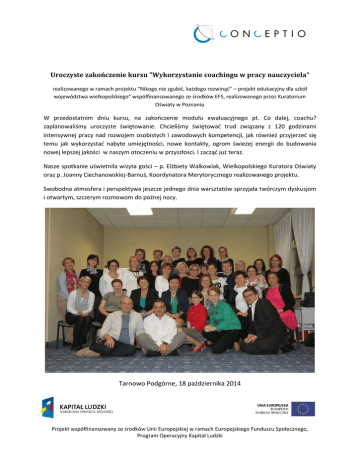 Uroczyste zakończenie kursu "Wykorzystanie coachingu w pracy nauczyciela” realizowanego w ramach projektu “Nikogo nie zgubić, każdego rozwinąć” – projekt edukacyjny dla szkół województwa wielkopolskiego” współfinansowanego ze środków EFS, realizowanego przez Kuratorium Oświaty w Poznaniu W przedostatnim dniu kursu, na zakończenie modułu ewaluacyjnego pt. Co dalej, coachu? zaplanowaliśmy uroczyste świętowanie. Chcieliśmy świętować trud związany z 120 godzinami intensywnej pracy nad rozwojem osobistych i zawodowych kompetencji, jak również przyjerzeć się temu jak wykorzystać nabyte umiejętności, nowe kontakty, ogrom świeżej energii do budowania nowej lepszej jakości w naszym otoczeniu w przyszłosci. I zacząć już teraz. Nasze spotkanie uświetniła wizyta gości – p. Elżbiety Walkowiak, Wielkopolskiego Kuratora Oświaty oraz p. Joanny Ciechanowskiej-Barnuś, Koordynatora Merytorycznego realizowanego projektu. Swobodna atmosfera i perspektywa jeszcze jednego dnia warsztatów sprzyjała twórczym dyskusjom i otwartym, szczerym rozmowom do poźnej nocy. Tarnowo Podgórne, 18 października 2014 Projekt współfinansowany ze środków Unii Europejskiej w ramach Europejskiego Funduszu Społecznego, Program Operacyjny Kapitał Ludzki