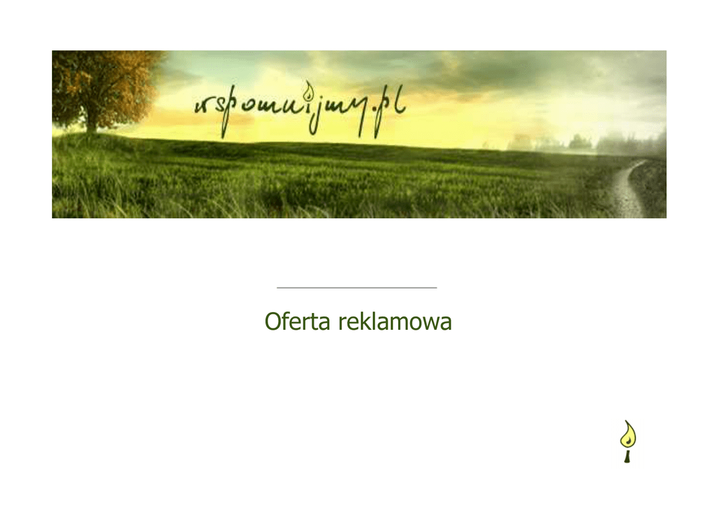 Oferta reklamowa 1 to pierwszy w Polsce portal społecznościowy, który łączy ludzi wokół wspólnych wspomnień o bliskich, którzy odeszli. odeszli Dzięki serwisowi uŜytkownicy mogą dodawać profile swoich zmarłych i prowadzić własny dziennik wspomnień o nich, dodawać zdjęcia czy palić świeczki pamięci. Dodany profil mogą równieŜ dzielić z innymi – rodziną, znajomymi, umoŜliwiając im w ten sposób zamieszczanie własnych wpisów i komentarzy, składanie kondolencji czy dodawanie zdjęć. Istota serwisu tkwi w łączeniu ludzi wokół wspólnych wspomnień. To szansa na odkrycie nowych, nieznanych historii z przeszłości zmarłego czy dowiedzenie się, jak pamiętają go inni. 2 Statystyka Wspomnijmy.pl to portal wspomnień tworzony dla uŜytkowników przez uŜytkowników. KAśDY dodany profil zmarłego: •Jest współdzielony blisko z 20 innymi osobami •Zawiera średnio 30 dodanych wspomnień •To przeciętnie 15 opublikowanych zdjęć •To około 5 zapalonych świeczek pamięci. Nasi uŜytkownicy to ludzie dorośli, w wieku 18-50 lat. Ich liczba z dnia na dzień wzrasta. Potencjalnie w pierwszym roku działalności z serwisu skorzysta ponad 250 000 uŜytkowników! 3 Podstawowe formy reklamowe na Stronie Głównej Billboard – reklama graficzna o wymiarach 750x100 umieszczana w górnej części strony. CięŜar do 30kB, w formacie jpg, gif ub swf. MoŜliwe rozmiary: - Mega billboard - rozmiar: 950x100, cięŜar: do 40kB - Double billboard – 750x200, do 40kB - Mega double billboard – 950x200, do 45kB Skyscraper – reklama graficzna o wymiarach 120x600 umieszczana w prawej/lewej części strony (przynajmniej część widoczna po otwarciu Witryny. CięŜar do 25kB, w formacie jpg, gif, swf. 4 Dodatkowe formy reklamowe na podstronach Witryny Przykład: Profil zmarłego Rectangle – reklama graficzna o wymiarach 300x250 umieszczana w środkowej części strony. CięŜar do 25kB, w formacie jpg, gif, swf. Lokalizacja reklamy: Profile zmarłych Profile uŜytkowników Formularze dodawania zmarłego Galerie zdjęć Rejestracja uŜytkownika 5 Dodatkowe formy reklamowe na podstronach Witryny Przykład: Profil uŜytkownika SurroundAd – jednoczesna ekspozycja billboardu i scycrapera dotycząca tego samego produktu. 6 Dodatkowe formy reklamowe na podstronach Witryny Przykład: Lista moich zmarłych Minibox – element reklamowy umieszczany w górnej części strony (max. 5, stosowany zamiennie do Billboardu). Rozmiar 125x125, cięŜar do 20kB, w formacie jpg, gif, swf. Button – statyczny lub animowany element graficzny umieszczany w środkowej części strony. Rozmiar 120x90, cięŜar do 15kB, w formacie jpg, gif, swf. 7 Formy reklamowe – Patronat Patronat – forma graficzna stanowiąca tło wybranej podstrony witryny (nie dotyczy Strony Głównej) wraz z logiem patrona umieszczonym w górnej części wybranych podstron. Jest to forma emisji stałej. W tym czasie reklama jest widoczna na odpowiedniej podstronie bez przerwy (przy kaŜdej odslonie). Zalety: Swoboda wyboru podstrony Stały kontakt uŜytkowników z kreacją Gwarancja, Ŝe nikt nie przeoczy reklamy. 8 Cennik form reklamowych w modelu CPM Produkt Lokalizacja Cena za 1000 odsłon Rate Card Strona Główna Podstrony Billboard 30 pln 25 pln Mega Billboard 35 pln 30 pln Double Billboard 40 pln 35 pln Mega Double Billboard 45 pln 40 pln 30 pln 25 pln SurroundAd (Billboard +Skycraper) 50 pln 40 pln Minibox 15 pln 15 pln Skyscraper Rectangle Button Strona Główna / Podstrony Podstrony witryny 20 pln 10 pln Podane ceny są cenami netto (bez podatku Vat). 9 Cennik form reklamowych – pakiet zasięgowy Produkt Lokalizacja Cena za pakiet (Rate Card) 50 000 odsłon 100 000 odsłon 200 000 odsłon Billboard 1000 pln 1800 pln 3000 pln Mega Billboard 1500 pln 2500 pln 4400 pln Double Billboard 1750 pln 3200 pln 6000 pln 2000 pln 3600 pln 6400 pln 1000 pln 1800 pln 3000 pln 1700 pln 3000 pln 5500 pln 600 pln 1000 pln 1600 pln 750 pln 1200 pln 2000 pln 400 pln 600 pln 1000 pln Mega Double Billboard Skyscraper Strona Główna + Podstrony SurroundAd (Billboard +Skycraper) Minibox Rectangle Button Podstrony Witryny Podane ceny są cenami netto (bez podatku Vat). 10 Cennik form reklamowych – w modelu FF Produkt Lokalizacja Cena za tydzień emisji Rate Card Strona Główna Podstrony Billboard 10000 pln 8000 pln. Mega Billboard 15000 pln 12000 pln Double Billboard 20000 pln 16000 pln 25000 pln 22000 pln 10000 pln 8000 pln SurroundAd (Billboard +Skycraper) 15000 pln 12000 pln Minibox 2000 pln 1600 pln Mega Double Billboard Skyscraper Strona Główna / Podstrony Rectangle 4000 pln Podstrony witryny Button Podane ceny są cenami netto (bez podatku Vat). 1000 pln 11 Cennik form reklamowych – Patronat - Patronat - Lokalizacja: reklama umieszczona na wybrane przez Klienta podstronie (nie dotyczy SG) + logo patrona na innych, wybranych podstronach. - Cena za tydzień emisji: 3000zł Podane ceny są cenami netto (bez podatku Vat). 12 Formy reklamowe – dodatkowe opcje - - Targetowanie - Regionalne - dotarcie do uŜytkowników z wybranego regionu (województwa, miasta) - Według systemu operacyjnego Emisja w określonych godzinach - - +10 proc. Wybór czasu emisji kreacji (godziny poranne, popołudniowe, wieczorne, mix) Capping - +10 proc. +20 proc. Ilość odsłon do UU w określonym czasie - Przekroczenie maksymalnej wagi materiału +30 proc. - Jesteśmy otwarci na wszelkie propozycję kreacji niestandardowych. 13 Kontakt Zapraszamy do współpracy! W celu realizacji wybranej przez Państwa kreacji prosimy o kontakt z Działem SprzedaŜy i Marketingu. Masz pytania? Wydawca portalu Wspomnijmy.pl Edyta Piekarska BrainSHARE s.c. Specjalista ds. kontaktów z Klientami Polna 34C, 32-080 Zabierzów Tel. +48 697-207-019 NIP 513 018 73 76 [email protected] REGON 120947761 Kontakt: [email protected] http://wspomnijmy.pl 14