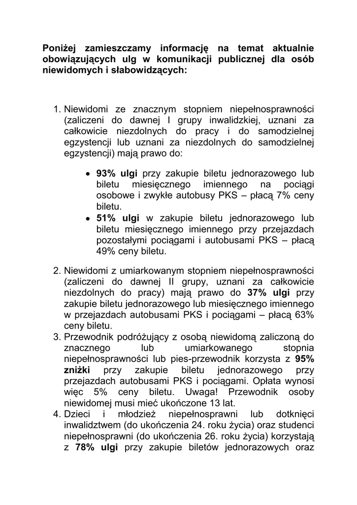 Poniżej zamieszczamy informację na temat aktualnie obowiązujących ulg w komunikacji publicznej dla osób niewidomych i słabowidzących: 1. Niewidomi ze znacznym stopniem niepełnosprawności (zaliczeni do dawnej I grupy inwalidzkiej, uznani za całkowicie niezdolnych do pracy i do samodzielnej egzystencji lub uznani za niezdolnych do samodzielnej egzystencji) mają prawo do: 93% ulgi przy zakupie biletu jednorazowego lub biletu miesięcznego imiennego na pociągi osobowe i zwykłe autobusy PKS – płacą 7% ceny biletu. 51% ulgi w zakupie biletu jednorazowego lub biletu miesięcznego imiennego przy przejazdach pozostałymi pociągami i autobusami PKS – płacą 49% ceny biletu. 2. Niewidomi z umiarkowanym stopniem niepełnosprawności (zaliczeni do dawnej II grupy, uznani za całkowicie niezdolnych do pracy) mają prawo do 37% ulgi przy zakupie biletu jednorazowego lub miesięcznego imiennego w przejazdach autobusami PKS i pociągami – płacą 63% ceny biletu. 3. Przewodnik podróżujący z osobą niewidomą zaliczoną do znacznego lub umiarkowanego stopnia niepełnosprawności lub pies-przewodnik korzysta z 95% zniżki przy zakupie biletu jednorazowego przy przejazdach autobusami PKS i pociągami. Opłata wynosi więc 5% ceny biletu. Uwaga! Przewodnik osoby niewidomej musi mieć ukończone 13 lat. 4. Dzieci i młodzież niepełnosprawni lub dotknięci inwalidztwem (do ukończenia 24. roku życia) oraz studenci niepełnosprawni (do ukończenia 26. roku życia) korzystają z 78% ulgi przy zakupie biletów jednorazowych oraz miesięcznych imiennych na wszystkie pociągi PKP i autobusy PKS. Ulga ta obowiązuje przy przejazdach z miejsca zamieszkania lub pobytu do przedszkola, szkoły, szkoły wyższej, placówki opiekuńczo-wychowawczej, placówki oświatowo-wychowawczej, specjalnego ośrodka wychowawczego, ośrodka umożliwiającego dzieciom i młodzieży spełnianie obowiązku szkolnego i obowiązku nauki, ośrodka rehabilitacyjno-wychowawczego, domu pomocy społecznej, ośrodka wsparcia, zakładu opieki zdrowotnej, poradni psychologiczno-pedagogicznej, w tym poradni specjalistycznej, a także na turnus rehabilitacyjny i z powrotem. 5. Ulga 78% przy zakupie biletu jednorazowego przysługuje również opiekunowi odwożącemu lub przywożącemu dziecko do lub z placówek (wymienionych w pkt 4) oraz w drodze po dziecko lub po jego odwiezieniu. 6. Dziecko do 4 lat korzysta z ulgi 100% przy przejazdach koleją oraz przy przejazdach środkami zbiorowej komunikacji autobusowej, jeśli nie zajmuje oddzielnego miejsca. Osoba uprawniona do ulgowego przejazdu w klasie 2. na podstawie biletów jednorazowych korzystająca z przejazdu w klasie 1. zobowiązana jest do uiszczenia dopłaty w wysokości stanowiącej różnicę między należnością za pełnopłatny przejazd w klasie 1. a należnością za pełnopłatny przejazd w klasie 2. Ulga nie obowiązuje na tzw. miejscówki i miejsca sypialne – należy je kupić dla siebie i przewodnika. Dokumenty, które poświadczają prawo do korzystania z ww. ulg pozostają bez zmian – w PKP i PKS wymagana jest legitymacja osoby niepełnosprawnej z zaznaczonym symbolem niepełnosprawności 04-o. W komunikacji miejskiej obowiązują – bezpłatne lub ulgowe przejazdy dla osoby niewidomej oraz jej przewodnika – w zależności od uchwał miejscowych organów samorządu terytorialnego.