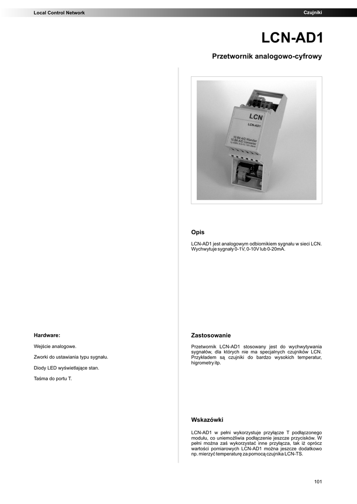 Czujniki Local Control Network LCN-AD1 Przetwornik analogowo-cyfrowy Opis LCN-AD1 jest analogowym odbiornikiem sygnału w sieci LCN. Wychwytuje sygnały 0-1V, 0-10V lub 0-20mA. Hardware: Zastosowanie Wejście analogowe. Przetwornik LCN-AD1 stosowany jest do wychwytywania sygnałów, dla których nie ma specjalnych czujników LCN. Przykładem są czujniki do bardzo wysokich temperatur, higrometry itp. Zworki do ustawiania typu sygnału. Diody LED wyświetlające stan. Taśma do portu T. Wskazówki LCN-AD1 w pełni wykorzystuje przyłącze T podłączonego modułu, co uniemożliwia podłączenie jeszcze przycisków. W pełni można zaś wykorzystać inne przyłącza, tak iż oprócz wartości pomiarowych LCN-AD1 można jeszcze dodatkowo np. mierzyć temperaturę za pomocą czujnika LCN-TS. 101 LCN-AD1 Przetwornik analogowo-cyfrowy Dane techniczne: Przyłącze Napięcie zasilające Zaciski Typ przewodu Wymiary: Wymiary (dł. x szer. x wys.): 113 x 38 x 66 mm 38 mm (5 TE) 61 mm 66 mm 113mm Wejścia Liczba Zakres pomiarowy Rozdzielczość Zaciski Typ przewodu Ogólne dane: Temperatura pracy Wilgotność powietrza Wysokość 66mm 61mm nad szyną Warunki otoczenia Ilość pól 2TE Stopień ochrony Montaż na szynie 35 mm (DIN 50022) lub mocowanie na śrubach 230V~ ±15%, 50Hz bezśrubowe drut lub linka max. 2,5mm2 lub z końcówką kablową max.1,5mm2 1 0V do 1V lub 0V do 10V lub 0mA do 20mA 10 Bit bezśrubowe drut lub linka max. (0,5mm2) lub z nasadką końcową (max.0,5mm2) -10oC do +40oC max. 80% wzgl. wilgotności, nie ulega obroszeniu do stosowania w stałej instalacji zgodnie z VDE 632, VDE 637 IP 20 Schemat połączeń L N D PE L N D PE N N L L LCN LCN-AD1 LCN Busmoduł 10 Bit A/D Wandler 10 Bit A/D Converter UN=230V, In:0-1V,-10V,-20mA 102 I P J1 J2 T -+ Wielkość pomiarowa