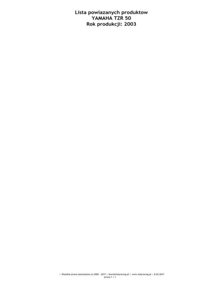 Lista powiazanych produktow YAMAHA TZR 50 Rok produkcji: 2003 :: Wszelkie prawa zastrzeżone (c) 2002 - 2017 :: [email protected] :: www.italyracing.pl :: 8.03.2017 strona 1 / 1