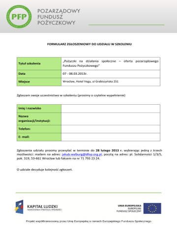 FORMULARZ ZGŁOSZENIOWY DO UDZIAŁU W SZKOLENIU Tytuł szkolenia „Pożyczki na działania społeczne – oferta pozarządowego Funduszu Pożyczkowego” Data 07 - 08.03.2013r. Miejsce Wrocław, Hotel Vega, ul Grabiszyńska 251 Zgłaszam swoje uczestnictwo w szkoleniu (prosimy o czytelne wypełnienie) Imię i nazwisko Nazwa organizacji/instytucji: Telefon: E- mail: Zgłoszenia udziału prosimy przesyłać w terminie do 28 lutego 2013 r. wybierając jedną z trzech możliwości: mailem na adres: [email protected], pocztą na adres: pl. Solidarności 1/3/5, pok. 319, 53-661 Wrocław lub faksem na nr 71 793 23 24. O udziale decyduje kolejność zgłoszeń.