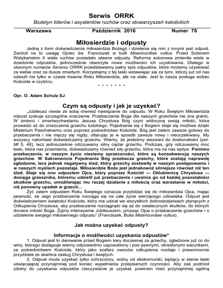 Serwis ORRK Biuletyn liderów i asystentów ruchów oraz stowarzyszeń katolickich Październik 2016 Warszawa Numer 78 Miłosierdzie i odpusty Jedną z form doświadczenia miłosierdzia Bożego i dzielenia się nim z innymi jest odpust. Zwrócił na to uwagę Ojciec św. Franciszek w bulli Misericordiae vultus. Przed Soborem Watykańskim II wiele ruchów posiadało własne odpusty. Reforma soborowa zmieniła wiele w dziedzinie odpustów, jednocześnie otworzyła nowe możliwości ich uzyskiwania. Dlatego w obecnym numerze Serwisu ORRK przedstawiamy pełny spis odpustów, które możemy uzyskiwać za siebie oraz za dusze zmarłych. Korzystajmy z tej łaski wstawiając się za tymi, którzy już od nas odeszli nie tylko w czasie trwania Roku Miłosierdzia, ale na stałe. Jest to nasza posługa wobec Kościoła w czyśćcu. * * * * * * * Opr. O. Adam Schulz SJ Czym są odpusty i jak je uzyskać? „Jubileusz niesie ze sobą również nawiązanie do odpustu. W Roku Świętym Miłosierdzia odpust zyskuje szczególne znaczenie. Przebaczenie Boga dla naszych grzechów nie zna granic. W śmierci i zmartwychwstaniu Jezusa Chrystusa Bóg czyni widoczną swoją miłość, która prowadzi aż do zniszczenia grzechu ludzkiego. Pojednanie się z Bogiem staje się możliwe dzięki Misterium Paschalnemu oraz poprzez pośrednictwo Kościoła. Bóg jest zatem zawsze gotowy do przebaczenia i nie męczy się nigdy, ofiarując je w sposób zawsze nowy i nieoczekiwany. My wszyscy natomiast doświadczamy grzechu. Wiemy, że jesteśmy wezwani do doskonałości (por. Mt 5, 48), lecz jednocześnie odczuwamy silny ciężar grzechu. Podczas, gdy odczuwamy moc łaski, która nas przemienia, doświadczamy również siły grzechu, która ma na nas wpływ. Pomimo przebaczenia, w naszym życiu niesiemy sprzeczności, które są konsekwencją naszych grzechów. W Sakramencie Pojednania Bóg przebacza grzechy, które zostają naprawdę zgładzone, lecz jednak negatywny ślad, który grzechy zostawiły w naszym postępowaniu i w naszych myślach pozostaje. Miłosierdzie Boże jest jednakowoż silniejsze również niż ten ślad. Staje się ono odpustem Ojca, który poprzez Kościół — Oblubienicę Chrystusa — dosięga grzesznika, któremu udzielił już przebaczenia i uwalnia go od każdej pozostałości skutków grzechu, umożliwiając mu raczej działanie z miłością oraz wzrastanie w miłości, niż ponowny upadek w grzech... Żyć zatem odpustem Roku Świętego oznacza przybliżać się do miłosierdzia Ojca, mając pewność, że Jego przebaczenie rozciąga się na całe życie wierzącego człowieka. Odpust jest doświadczeniem świętości Kościoła, który ma udział we wszystkich dobrodziejstwach płynących z Odkupienia Chrystusa, aby przebaczenie rozciągnęło się aż do ostatecznych skutków, do których dociera miłość Boga. Żyjmy intensywnie Jubileuszem, prosząc Ojca o przebaczenie grzechów i o udzielenie swojego miłosiernego odpustu” (Franciszek, Bulla Misericordiae vultus). Jak można uzyskać odpusty? Informacje o możliwości uzyskania odpustów* 1. Odpust jest to darowanie przed Bogiem kary doczesnej za grzechy, zgładzone już co do winy, którego dostępuje wierny odpowiednio usposobiony i pod pewnymi, określonymi warunkami, za pośrednictwem Kościoła, który jako szafarz owoców odkupienia rozdaje i prawomocnie przydziela ze skarbca zasług Chrystusa i świętych. 2. Odpust może uzyskać tylko ochrzczony, wolny od ekskomuniki, będący w stanie łaski uświęcającej przynajmniej pod koniec wypełniania przepisanych czynności. Aby zaś podmiot zdolny do uzyskania odpustów rzeczywiście je uzyskał, powinien mieć przynajmniej ogólną intencję zyskania odpustu oraz wypełnić w określonym czasie i we właściwy sposób nakazane czynności, zgodnie z brzmieniem udzielenia. 3. Do uzyskania odpustu zupełnego wymagane są: a) wykonanie czynu (dzieła) obdarzonego odpustem, b) spełnienie trzech warunków: Spowiedź sakramentalna, Komunia eucharystyczna, modlitwa w intencjach Ojca Świętego. Po jednej spowiedzi sakramentalnej można uzyskać wiele odpustów zupełnych. Natomiast po jednej Komunii eucharystycznej i po jednej modlitwie w intencjach Ojca Świętego zyskuje się tylko jeden odpust zupełny. Te trzy warunki można spełnić wiele dni przed lub po wypełnieniu czynu odpustowego. Wypada jednak, by Komunia eucharystyczna i modlitwa w intencjach Ojca Świętego spełnione były w dniu odpustu. Modlitwą w intencjach Ojca Świętego może być recytacja Ojcze nasz i Zdrowaś Maryjo. c) wykluczenie przywiązania do wszelkiego grzechu, nawet lekkiego. 4. Każdy wierny może zyskiwać odpusty czy to cząstkowe, czy zupełne albo dla siebie, albo ofiarowywać za zmarłych na sposób wstawiennictwa. 5. Odpust jest częściowy albo zupełny, zależnie od tego, czy uwalnia od kary doczesnej należnej za grzechy w części lub całości. 6. Odpust zupełny można uzyskać tylko jeden raz w ciągu dnia. Drugi raz można uzyskać odpust zupełny tego samego dnia w godzinę śmierci. 7. Ilekroć do zyskania odpustu przepisane jest nawiedzenie kościoła lub kaplicy, wówczas należy tam odmówić pobożnie modlitwę Ojcze nasz i Wierzę w Boga. 8. Osobom, które są prawnie przeszkodzone i dlatego nie są w stanie spełnić tego, co jest nakazane do uzyskania odpustu, spowiednicy mogą dokonać zamiany zarówno przepisanego czynu (dzieła) odpustowego, jak i warunków zwykłych. 9. Oprócz najwyższej władzy kościelnej, tylko ci mogą udzielać odpustów, którym tę władzę przyznaje prawo albo udziela jej Biskup Rzymski. Żadna władza, poza Biskupem Rzymskim, nie może przekazywać innym władzy udzielania odpustów, chyba że zostało to jej wyraźnie przyznane przez Stolicę Apostolską. * Opracowanie oparto o Enchiridion Indulgentiarum. Normae et Concessiones, quarta editio, Libreria Editrice Vaticana 1999. Ogólne formuły udzielania odpustów Ogólne formuły udzielania o