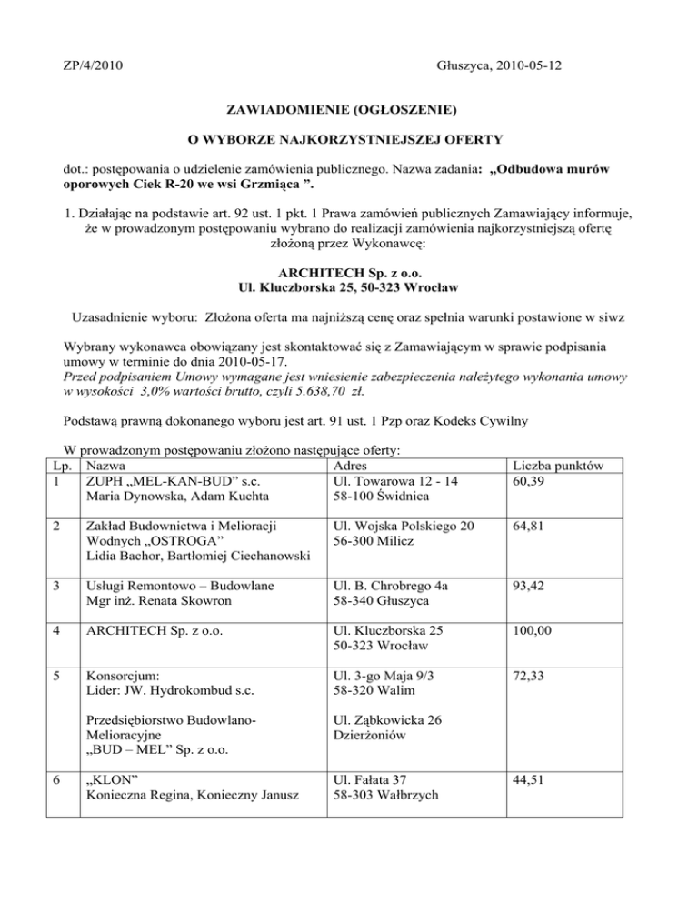 ZP/4/2010 Głuszyca, 2010-05-12 ZAWIADOMIENIE (OGŁOSZENIE) O WYBORZE NAJKORZYSTNIEJSZEJ OFERTY dot.: postępowania o udzielenie zamówienia publicznego. Nazwa zadania: „Odbudowa murów oporowych Ciek R-20 we wsi Grzmiąca ”. 1. Działając na podstawie art. 92 ust. 1 pkt. 1 Prawa zamówień publicznych Zamawiający informuje, że w prowadzonym postępowaniu wybrano do realizacji zamówienia najkorzystniejszą ofertę złożoną przez Wykonawcę: ARCHITECH Sp. z o.o. Ul. Kluczborska 25, 50-323 Wrocław Uzasadnienie wyboru: Złożona oferta ma najniższą cenę oraz spełnia warunki postawione w siwz Wybrany wykonawca obowiązany jest skontaktować się z Zamawiającym w sprawie podpisania umowy w terminie do dnia 2010-05-17. Przed podpisaniem Umowy wymagane jest wniesienie zabezpieczenia należytego wykonania umowy w wysokości 3,0% wartości brutto, czyli 5.638,70 zł. Podstawą prawną dokonanego wyboru jest art. 91 ust. 1 Pzp oraz Kodeks Cywilny W prowadzonym postępowaniu złożono następujące oferty: Lp. Nazwa Adres 1 ZUPH „MEL-KAN-BUD” s.c. Ul. Towarowa 12 - 14 Maria Dynowska, Adam Kuchta 58-100 Świdnica Liczba punktów 60,39 2 Zakład Budownictwa i Melioracji Wodnych „OSTROGA” Lidia Bachor, Bartłomiej Ciechanowski Ul. Wojska Polskiego 20 56-300 Milicz 64,81 3 Usługi Remontowo – Budowlane Mgr inż. Renata Skowron Ul. B. Chrobrego 4a 58-340 Głuszyca 93,42 4 ARCHITECH Sp. z o.o. Ul. Kluczborska 25 50-323 Wrocław 100,00 5 Konsorcjum: Lider: JW. Hydrokombud s.c. Ul. 3-go Maja 9/3 58-320 Walim 72,33 Przedsiębiorstwo BudowlanoMelioracyjne „BUD – MEL” Sp. z o.o. Ul. Ząbkowicka 26 Dzierżoniów „KLON” Konieczna Regina, Konieczny Janusz Ul. Fałata 37 58-303 Wałbrzych 6 44,51 7 Zakład Budownictwa i Melioracji EKO-MEL s.c. Ul. Piastowska 7 58-200 Dzierżoniów 78,59 8 Zakład Remontowo – Budowlany „RYNG-BUD” Jacek Ryngwelski PPHU „STA-POL” Stanisław Skrzyniarz Kamionka 22 58-350 Rybnica Leśna 64,07 Ul. Tkacka 2 58-350 Mieroszów 68,47 10 Wykonawstwo i Usługi WodnoInżynieryjne „WODNIK” Sp. z o.o Ul. Objazdowa 16 57-300 Kłodzko 57,78 11 Rejonowy Związek Spółek Wodnych w Wałbrzychu Ul. Orkana 84a 58-307 Wałbrzych 65,48 9 2. Działając na podstawie art. 92 ust. 1 pkt. 2 Prawa zamówień publicznych Zamawiający informuje, że w prowadzonym postępowaniu nie zostały odrzucone żadne oferty. 3. Działając na podstawie art. 92 ust. 1 pkt. 3 Prawa zamówień publicznych Zamawiający informuje, że w prowadzonym postępowaniu nie zostali wykluczeni żadni wykonawcy. Środki ochrony prawnej Informacje dotyczące środków ochrony prawnej znajdują się w Specyfikacji istotnych warunków zamówienia oraz w Dziale VI Prawa zamówień publicznych „Środki ochrony prawnej", art. od 179 do 198g (t. j. Dz. U. z 2007 r. Nr 223, poz. 1655 z p. zm.) Zastępca Burmistrza Tomasz Gromala
