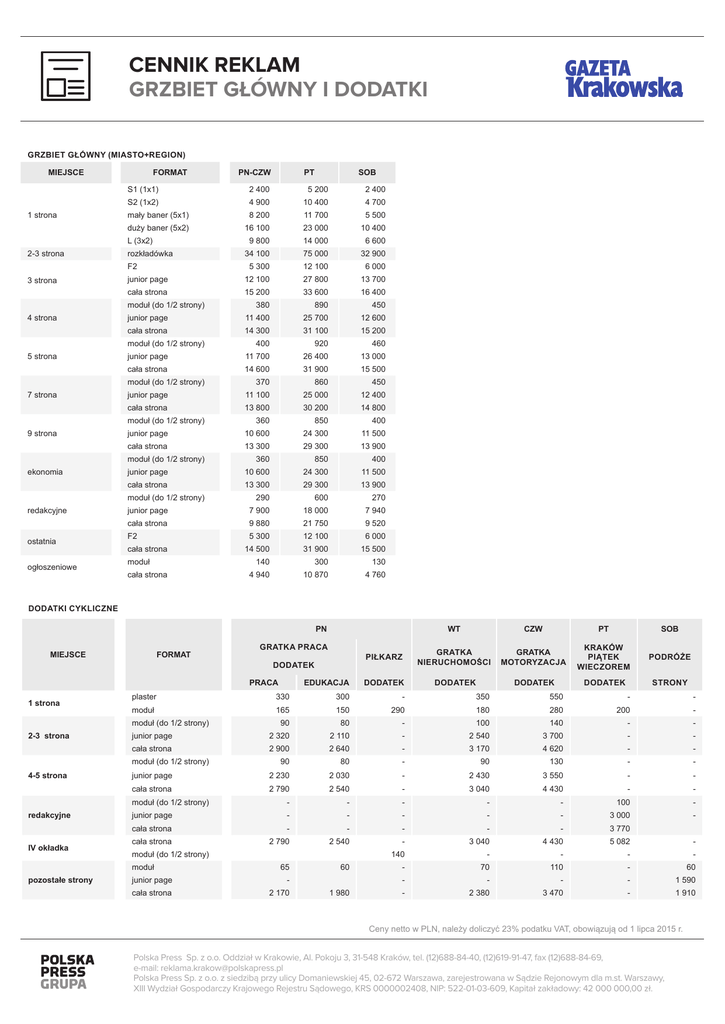 CENNIK REKLAM GRZBIET GŁÓWNY I DODATKI GRZBIET GŁÓWNY (MIASTO+REGION) MIEJSCE 1 strona FORMAT 2 400 S2 (1x2) 4 900 10 400 4 700 mały baner (5x1) 8 200 11 700 5 500 duży baner (5x2) 16 100 23 000 10 400 rozkładówka 6 000 27 800 13 700 cała strona 15 200 33 600 16 400 380 890 450 junior page 11 400 25 700 12 600 cała strona 14 300 31 100 15 200 400 920 460 junior page 11 700 26 400 13 000 cała strona 14 600 31 900 15 500 370 860 450 junior page 11 100 25 000 12 400 cała strona 13 800 30 200 14 800 360 850 400 junior page 10 600 24 300 11 500 cała strona 13 300 29 300 13 900 360 850 400 junior page 10 600 24 300 11 500 cała strona 13 300 29 300 13 900 290 600 270 junior page 7 900 18 000 7 940 cała strona 9 880 21 750 9 520 F2 5 300 12 100 6 000 14 500 31 900 15 500 moduł (do 1/2 strony) ekonomia moduł (do 1/2 strony) redakcyjne ostatnia ogłoszeniowe 32 900 12 100 moduł (do 1/2 strony) 9 strona 6 600 75 000 5 300 moduł (do 1/2 strony) 7 strona 14 000 12 100 moduł (do 1/2 strony) 5 strona 9 800 34 100 junior page moduł (do 1/2 strony) 4 strona SOB 5 200 F2 3 strona PT 2 400 L (3x2) 2-3 strona PN-CZW S1 (1x1) cała strona moduł cała strona 140 300 130 4 940 10 870 4 760 DODATKI CYKLICZNE PN MIEJSCE FORMAT GRATKA PRACA DODATEK PRACA 1 strona redakcyjne IV okładka SOB PIŁKARZ GRATKA NIERUCHOMOŚCI GRATKA MOTORYZACJA KRAKÓW PIĄTEK WIECZOREM PODRÓŻE DODATEK DODATEK DODATEK STRONY EDUKACJA DODATEK 300 - 350 550 - - moduł 165 150 290 180 280 200 - 90 80 - 100 140 - - junior page 2 320 2 110 - 2 540 3 700 - - cała strona 2 900 2 640 - 3 170 4 620 - - 90 80 - 90 130 - - junior page 2 230 2 030 - 2 430 3 550 - - cała strona 2 790 2 540 - 3 040 4 430 - - moduł (do 1/2 strony) - - - - - 100 - junior page - - - - - 3 000 - cała strona - - - - - 3 770 cała strona 2 790 2 540 moduł (do 1/2 strony) moduł pozostałe strony PT 330 moduł (do 1/2 strony) 4-5 strona CZW plaster moduł (do 1/2 strony) 2-3 strona WT 65 junior page - cała strona 2 170 60 1 980 - 3 040 4 430 5 082 - 140 - - - - - 70 110 - 60 - - - - 1 590 - 2 380 3 470 - 1 910 Ceny netto w PLN, należy doliczyć 23% podatku VAT, obowiązują od 1 lipca 2015 r. Polska Press Sp. z o.o. Oddział w Krakowie, Al. Pokoju 3, 31-548 Kraków, tel. (12)688-84-40, (12)619-91-47, fax (12)688-84-69, e-mail: [email protected] Polska Press Sp. z o.o. z siedzibą przy ulicy Domaniewskiej 45, 02-672 Warszawa, zarejestrowana w Sądzie Rejonowym dla m.st. Warszawy, XIII Wydział Gospodarczy Krajowego Rejestru Sądowego, KRS 0000002408, NIP: 522-01-03-609, Kapitał zakładowy: 42 000 000,00 zł. CENNIK REKLAM GRZBIET GŁÓWNY I DODATKI GRZBIET GŁÓWNY (MIASTO/REGION) MIEJSCE 1 strona FORMAT 3 strona 970 3 900 S2 (1x2) 1 900 mały baner (5x1) 3 300 duży baner (5x2) 5 800 mały baner (5x1) 6 600 duży baner (5x2) 12 700 rozkładówka ekonomia 4 300 9 700 cała strona 12 100 ostatnia 9 100 cała strona 11 400 9 300 cała strona 11 600 ogłoszeniowe 8 900 cała strona 11 000 8 500 cała strona 10 700 4 strona 5 strona 8 500 cała strona 10 700 6 320 cała strona F2 4 800 cała strona 6 100 9 strona 4 500 cała strona 5 700 4 700 cała strona 5 800 150 junior page 4 400 cała strona 5 500 140 junior page 4 200 cała strona 5 300 140 junior page 4 200 cała strona 5 300 moduł (do 1/2 strony) redakcyjne 160 junior page moduł (do 1/2 strony) ekonomia 150 junior page moduł (do 1/2 strony) 240 junior page 2 100 junior page moduł (do 1/2 strony) 7 strona 3 900 13 600 F2 moduł (do 1/2 strony) 290 junior page rozkładówka moduł (do 1/2 strony) 290 junior page cała strona 3 strona 300 junior page moduł 2-3 strona 320 junior page cała strona L (3x2) 310 junior page moduł (do 1/2 strony) redakcyjne 27 300 junior page moduł (do 1/2 strony) 1 strona 7 800 F2 moduł (do 1/2 strony) 9 strona PN-CZW S2 (1x2) moduł (do 1/2 strony) 7 strona FORMAT S1 (1x1) moduł (do 1/2 strony) 5 strona MIEJSCE 1 900 moduł (do 1/2 strony) 4 strona PN-CZW S1 (1x1) L (3x2) 2-3 strona MUTACJA REGIONALNA* 116 junior page 3 160 7 910 cała strona 3 952 4 300 F2 2 100 cała strona 5 800 11 600 120 3 960 Cena obejmuje publikację reklamy tylko w mieście albo tylko w regionie ostatnia ogłoszeniowe moduł cała strona 56 1 976 *Cena obejmuje JEDNĄ mutację regionalną – np. Nowy Sącz lub Tarnów lub Małopolska Zachodnia lub Podhale Ceny netto w PLN, należy doliczyć 23% podatku VAT, obowiązują od 1 lipca 2015 r. Polska Press Sp. z o.o. Oddział w Krakowie, Al. Pokoju 3, 31-548 Kraków, tel. (12)688-84-40, (12)619-91-47, fax (12)688-84-69, e-mail: [email protected] Polska Press Sp. z o.o. z siedzibą przy ulicy Domaniewskiej 45, 02-672 Warszawa, zarejestrowana w Sądzie Rejonowym dla m.st. Warszawy, XIII Wydział Gospodarczy Krajowego Rejestru Sądowego, KRS 0000002408, NIP: 522-01-03-609, Kapitał zakładowy: 42 000 000,00 zł. CENNIK REKLAM GRZBIET GŁÓWNY I DODATKI DOPŁATY Dopłata za wybór miejsca Reklama konsekutywna Artykuł sponsorowany Niestandardowy format Dopłata za płatność po emisji Dopłata za każdego kolejnego reklamodawcę 15% 15% 10% 10% 10% 15% ZNIŻKI Za wielokrotność emisji 3-7 emisji 8-15 emisji 16-23 emisje więcej niż 24 emisje 5% 7% 10% 20% Rabaty przysługują za wielokrotność emisji w tym samym dniu wydawniczym oraz w tym samym produkcie wydawnictwa. Wartość cennikowa poszczególnych emisji musi być identyczna. TERMINARZ Grzbiet główny: Termin nadsyłania zleceń: najpóźniej 3 dni robocze przed datą emisji Termin nadsyłania materiałów: najpóźniej 2 dni robocze przed datą emisji Dodatki cykliczne: Termin nadsyłania zleceń: najpóźniej 4 dni robocze przed datą emisji Termin nadsyłania materiałów: najpóźniej 2 dni robocze przed datą emisji INSERTOWANIE: Koszt wkładkowania standardowego do 1 sztuki nakładu w wybranym dniu wydawniczym oraz produkcie wydawnictwa wynosi 0,11 PLN. Maksymalny format insertu w grzbiecie głównym A3, Maksymalny format insertu w kolorowych dodatkach A4, Maksymalna wa