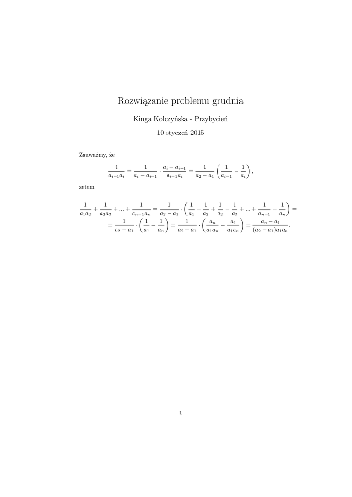 Rozwiązanie problemu grudnia Kinga Kolczyńska - Przybycień 10 styczeń 2015 Zauważmy, że 1 ai − ai−1 1 = · = ai−1 ai ai − ai−1 ai−1 ai a2 − a1 1 1 ai−1 1 − ai , zatem 1 1 1 1 1 1 1 1 1 1 + + ... + = · − + − + ... + − = a1 a2 a2 a3 an−1 an a2 − a1 a1 a2 a2 a3 an−1 an 1 1 1 an a1 an − a1 1 · − = · − = . = a2 − a1 a1 an a2 − a1 a1 an a1 an (a2 − a1 )a1 an 1