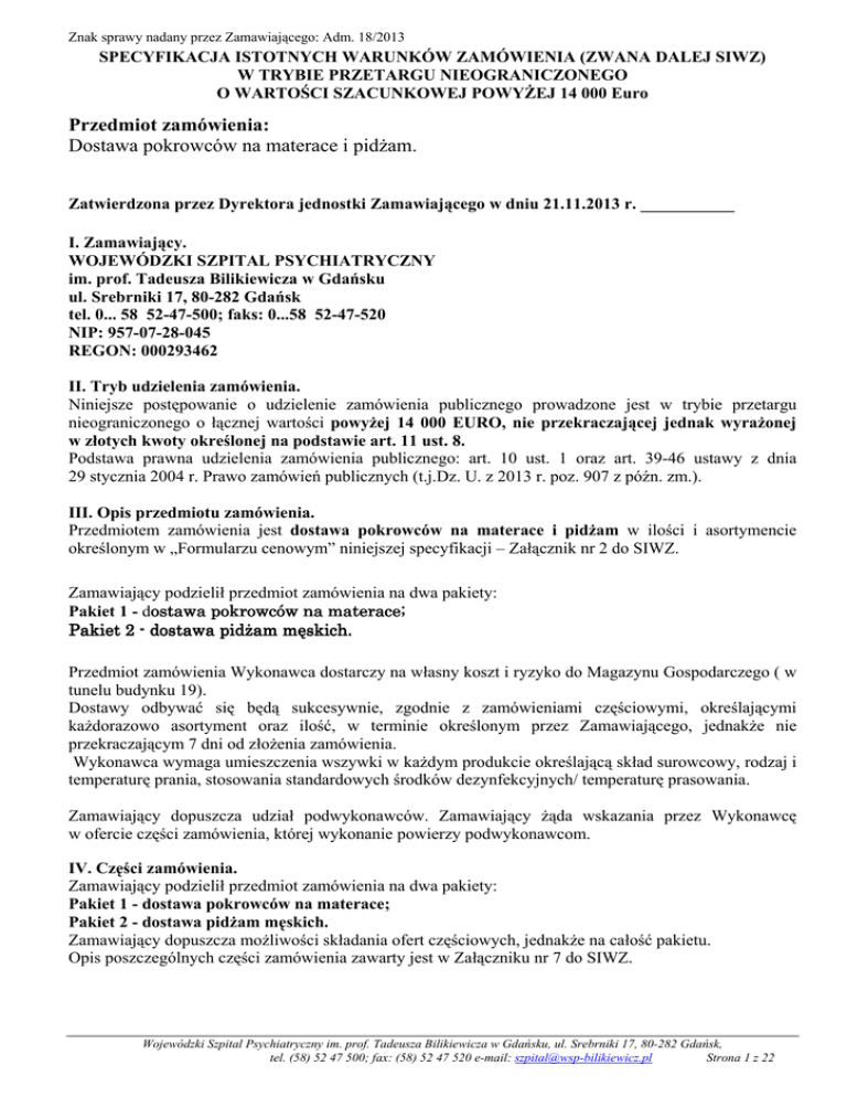 Znak sprawy nadany przez Zamawiającego: Adm. 18/2013 SPECYFIKACJA ISTOTNYCH WARUNKÓW ZAMÓWIENIA (ZWANA DALEJ SIWZ) W TRYBIE PRZETARGU NIEOGRANICZONEGO O WARTOŚCI SZACUNKOWEJ POWYśEJ 14 000 Euro Przedmiot zamówienia: Dostawa pokrowców na materace i pidŜam. Zatwierdzona przez Dyrektora jednostki Zamawiającego w dniu 21.11.2013 r. ___________ I. Zamawiający. WOJEWÓDZKI SZPITAL PSYCHIATRYCZNY im. prof. Tadeusza Bilikiewicza w Gdańsku ul. Srebrniki 17, 80-282 Gdańsk tel. 0... 58 52-47-500; faks: 0...58 52-47-520 NIP: 957-07-28-045 REGON: 000293462 II. Tryb udzielenia zamówienia. Niniejsze postępowanie o udzielenie zamówienia publicznego prowadzone jest w trybie przetargu nieograniczonego o łącznej wartości powyŜej 14 000 EURO, nie przekraczającej jednak wyraŜonej w złotych kwoty określonej na podstawie art. 11 ust. 8. Podstawa prawna udzielenia zamówienia publicznego: art. 10 ust. 1 oraz art. 39-46 ustawy z dnia 29 stycznia 2004 r. Prawo zamówień publicznych (t.j.Dz. U. z 2013 r. poz. 907 z późn. zm.). III. Opis przedmiotu zamówienia. Przedmiotem zamówienia jest dostawa pokrowców na materace i pidŜam w ilości i asortymencie określonym w „Formularzu cenowym” niniejszej specyfikacji – Załącznik nr 2 do SIWZ. Zamawiający podzielił przedmiot zamówienia na dwa pakiety: Pakiet 1 - dostawa ostawa pokrowców na materace materace; ace; Pakiet 2 - dostawa dostawa pidŜam męskich. męskich. Przedmiot zamówienia Wykonawca dostarczy na własny koszt i ryzyko do Magazynu Gospodarczego ( w tunelu budynku 19). Dostawy odbywać się będą sukcesywnie, zgodnie z zamówieniami częściowymi, określającymi kaŜdorazowo asortyment oraz ilość, w terminie określonym przez Zamawiającego, jednakŜe nie przekraczającym 7 dni od złoŜenia zamówienia. Wykonawca wymaga umieszczenia wszywki w kaŜdym produkcie określającą skład surowcowy, rodzaj i temperaturę prania, stosowania standardowych środków dezynfekcyjnych/ temperaturę prasowania. Zamawiający dopuszcza udział podwykonawców. Zamawiający Ŝąda wskazania przez Wykonawcę w ofercie części zamówienia, której wykonanie powierzy podwykonawcom. IV. Części zamówienia. Zamawiający podzielił przedmiot zamówienia na dwa pakiety: Pakiet 1 - dostawa pokrowców na materace; Pakiet 2 - dostawa pidŜam męskich. Zamawiający dopuszcza moŜliwości składania ofert częściowych, jednakŜe na całość pakietu. Opis poszczególnych części zamówienia zawarty jest w Załączniku nr 7 do SIWZ. Wojewódzki Szpital Psychiatryczny im. prof. Tadeusza Bilikiewicza w Gdańsku, ul. Srebrniki 17, 80-282 Gdańsk, tel. (58) 52 47 500; fax: (58) 52 47 520 e-mail: [email protected] Strona 1 z 22 Znak sprawy nadany przez Zamawiającego: Adm. 18/2013 V. Zamówienia uzupełniające. Zamawiający nie przewiduje udzielenia zamówień uzupełniających. VI. Oferty wariantowe, aukcja elektroniczna, umowa ramowa, dynamiczny system zakupów Zamawiający nie dopuszcza składania ofert wariantowych. Zamawiający nie przewiduje wyboru najkorzystniejszej oferty z zastosowaniem aukcji elektronicznej. Zamawiający nie przewiduje zawarcia umowy ramowej. Zamawiający nie przewiduje ustanowienia dynamicznego systemu zakupu. VII. Termin wykonania zamówienia. Zamawiający wymaga wykonania zamówienia w terminie od dnia podpisania umowy do 28.02.2014r. VIII. Warunki udziału w postępowaniu oraz opis sposobu dokonywania oceny spełniania tych warunków. 1. O udzielenie zamówienia mogą ubiegać się Wykonawcy, którzy spełniają warunki określone w art. 22 ust. 1 ustawy Prawo zamówień publicznych tj. dotyczące: 1) posiadania uprawnień do wykonywania określonej działalności lub czynności, jeŜeli przepisy prawa nakładają obowiązek ich posiadania – Zamawiający nie ustala szczegółowych warunków w powyŜszym zakresie, Zamawiający uzna warunek za spełniony na podstawie oświadczenia złoŜonego przez Wykonawcę w oparciu o wzór stanowiący Załącznik nr 3 do SIWZ; 2) posiadania wiedzy i doświadczenia – Zamawiający nie ustala szczegółowych warunków w powyŜszym zakresie, Zamawiający uzna warunek za spełniony na podstawie oświadczenia złoŜonego przez Wykonawcę w oparciu o wzór stanowiący Załącznik nr 3 do SIWZ; 3) dysponowania odpowiednim potencjałem technicznym – Zamawiający nie ustala szczegółowych warunków w powyŜszym zakresie, Zamawiający uzna warunek za spełniony na podstawie oświadczenia złoŜonego przez Wykonawcę w oparciu o wzór stanowiący Załącznik nr 3 do SIWZ; 4) dysponowania osobami zdolnymi do wykonania zamówienia – Zamawiający nie ustala szczegółowych warunków w powyŜszym zakresie, Zamawiający uzna warunek za spełniony na podstawie oświadczenia złoŜonego przez Wykonawcę w oparciu o wzór stanowiący Załącznik nr 3 do SIWZ; 5) sytuacji ekonomicznej i finansowej – Zamawiający nie ustala szczegółowych warunków w powyŜszym zakresie, Zamawiający uzna warunek za spełniony na podstawie oświadczenia złoŜonego przez Wykonawcę w oparciu o wzór stanowiący Załącznik nr 3 do SIWZ. 2. Zgodnie z art. 26 ust. 2b ustawy Pzp Wykonawca moŜe polegać na wiedzy i doświadczeniu, potencjale technicznym, osobach zdolnych do wykonania zamówienia lub zdolnościach finansowych innych podmiotów, niezaleŜnie od charakteru prawnego łączących go z nimi stosunków. Wykonawca w takiej sytuacji zobowiązany jest udowodnić Zamawiającemu, iŜ będzie dysponował zasobami niezbędnymi do realizacji zamówienia, w szczególności przedstawiając w tym celu pisemne zobowiązanie tych podmiotów do oddania mu do dyspozycji niezbędnych zasobów na okres korzystania z nich przy wykonaniu zamówienia ewentualnie do wykorzystania wzór stanowiący Załącznik nr 3A. 3. Zamawiający oceni spełnienie warunków udziału w postępowaniu na podstawie oświadczeń i dokumentów Wykonawcy załączonych do oferty według zasady spełnia / nie spełnia. IX. Wykaz oświadczeń 