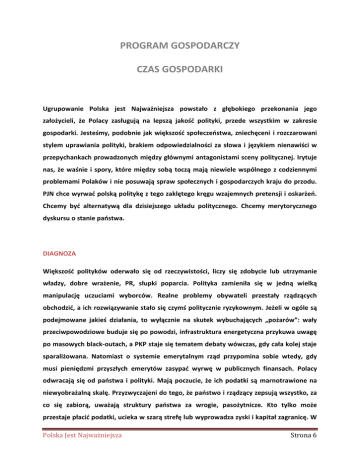 PROGRAM GOSPODARCZY CZAS GOSPODARKI Ugrupowanie Polska jest Najważniejsza powstało z głębokiego przekonania jego założycieli, że Polacy zasługują na lepszą jakośd polityki, przede wszystkim w zakresie gospodarki. Jesteśmy, podobnie jak większośd społeczeostwa, zniechęceni i rozczarowani stylem uprawiania polityki, brakiem odpowiedzialności za słowa i językiem nienawiści w przepychankach prowadzonych między głównymi antagonistami sceny politycznej. Irytuje nas, że waśnie i spory, które między sobą toczą mają niewiele wspólnego z codziennymi problemami Polaków i nie posuwają spraw społecznych i gospodarczych kraju do przodu. PJN chce wyrwad polską politykę z tego zaklętego kręgu wzajemnych pretensji i oskarżeo. Chcemy byd alternatywą dla dzisiejszego układu politycznego. Chcemy merytorycznego dyskursu o stanie paostwa. DIAGNOZA Większośd polityków oderwało się od rzeczywistości, liczy się zdobycie lub utrzymanie władzy, dobre wrażenie, PR, słupki poparcia. Polityka zamieniła się w jedną wielką manipulację uczuciami wyborców. Realne problemy obywateli przestały rządzących obchodzid, a ich rozwiązywanie stało się czymś politycznie ryzykownym. Jeżeli w ogóle są podejmowane jakieś działania, to wyłącznie na skutek wybuchających „pożarów”: wały przeciwpowodziowe buduje się po powodzi, infrastruktura energetyczna przykuwa uwagę po masowych black-outach, a PKP staje się tematem debaty wówczas, gdy cała kolej staje sparaliżowana. Natomiast o systemie emerytalnym rząd przypomina sobie wtedy, gdy musi pieniędzmi przyszłych emerytów zasypad wyrwę w publicznych finansach. Polacy odwracają się od paostwa i polityki. Mają poczucie, że ich podatki są marnotrawione na niewyobrażalną skalę. Przyzwyczajeni do tego, że paostwo i rządzący zepsują wszystko, za co się zabiorą, uważają struktury paostwa za wrogie, pasożytnicze. Kto tylko może przestaje płacid podatki, ucieka w szarą strefę lub wyprowadza zyski i kapitał zagranicę. W Polska Jest Najważniejsza Strona 6 ten sposób obywatele wycofują się z poczucia współodpowiedzialności za paostwo, z poczucia uczestnictwa i wpływu na życie publiczne. Wyłączają się z przynależności do wspólnoty społeczeostwa i paostwa. Rządzący, wyczuwając powszechne zniechęcenie Polaków wobec polityków i polityki, nie próbują tego trendu zmieniad, nie wyciągają wniosków. Zamiast tego udają, że sami nie mają nic wspólnego z polityką. Rzeczywistośd jednak istnieje. Istnieją realne problemy i wyzwania, z którymi Polacy mierzą się dziś i którym będą musieli stawid czoła w bliższej lub dalszej przyszłości. Tych problemów nie da się rozwiązad chowając głowę w piasek, udając, że ich nie ma. Tę rzeczywistośd opisują fatalne miejsca Polski w rankingach międzynarodowych organizacji i think-tanków. W 2006 roku Polska była na 54. miejscu w rankingu Banku Światowego krajów o regulacjach najbardziej sprzyjających prowadzeniu firmy. W 2010 roku spadliśmy na 70. miejsce. Tę rzeczywistośd opisują również liczby, pokazujące fatalny i szybko pogarszający się stan finansów publicznych. Ponad 2/3 naszych podatków jest przeznaczane na wydatki sztywne, z których znaczna częśd jest po prostu wyrzucana w błoto. Dziesiątki różnego rodzaju środowisk lobbujących i szantażujących polityków doprowadziło do tego, że co roku dziesiątki miliardów złotych są marnowane, rozdawane ludziom, którzy pomocy paostwa wcale nie potrzebują. Podatki ludzi, którzy często z trudem wiążą koniec z koocem wydawane są na „pomoc” dla tych, którzy żyją w dostatku. Rząd przez ostatnie trzy lata dramatycznie zadłużał paostwo głównie po to, aby w dalszym ciągu finansowad najczęściej niepotrzebne przywileje. Będą za to płacid następne pokolenia - już dziś każde dziecko w Polsce ma do spłacenia dług przekraczający 20 tysięcy złotych! Polacy w ciągu ostatnich 20 lat odczuli niewyobrażalny wzrost jakości życia związany ze wzrostem gospodarczym. Ten wzrost zawdzięczają głównie sobie, własnej przedsiębiorczości, kreatywności, zaradności. Za wzrostem zamożności Polaków nie poszła jednak poprawa stanu usług publicznych. Publiczna służba zdrowia, publiczna edukacja i szkoły wyższe są w tragicznym stanie i nic nie wskazuje na to, żeby ta sytuacja mogła się w najbliższym czasie zmienid. Poziom marnotrawstwa publicznych pieniędzy przeznaczanych na utrzymanie strukturalnie niewydolnej służby zdrowia i edukacji jest niewyobrażalny. Polska Jest Najważniejsza Strona 7 Pozostawiony samemu sobie aparat urzędniczy przez ostatnie 20 lat powoli lecz konsekwentnie umacniał swoją pozycję. W urzędach zatrudnionych jest dziś blisko pół miliona osób – trzykrotnie więcej niż dwadzieścia lat temu. Pozycja biurokracji jest tym mocniejsza, że projekty aktów prawnych są zazwyczaj tworzone przez urzędników i dla urzędników. W większości nowych czy zmienianych aktów prawnych brany jest pod uwagę interes biurokracji, interesy i potrzeby obywateli i przedsiębiorców są powszechnie ignorowane. To dlatego załatwienie każdej sprawy urzędowej staje się biurokratycznym koszmarem, a sfrustrowany obywatel upewnia się w przekonaniu, że paostwo jest mu strukturą fundamentalnie wrogą. Chaotyczne próby doprowadzenia do pozytywnej zmiany podejmowane przez polityków kooczą się spektakularnymi porażkami - tak stało się ze słynnym „jednym okienkiem" przy zakładaniu działalności gospodarczej. Po wejściu w życie tego „usprawnienia" czas konieczny na przejście urzędniczej procedury wydłużył się kilkukrotnie. PLAN DZIAŁAO Szkód wyrządzonych przez dziesięciolecia nie da się naprawid z dnia na dzieo. Tym bardziej trzeba zacząd jak najszybciej. Jesteśmy przekonani, że Polacy są narodem mądrym i chcą aby ich traktowad uczciwie i sprawiedliwie. Polacy oczeku