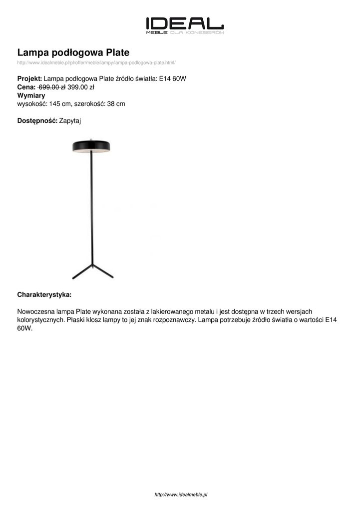 Lampa podłogowa Plate http://www.idealmeble.pl/pl/offer/meble/lampy/lampa-podlogowa-plate.html/ Projekt: Lampa podłogowa Plate źródło światła: E14 60W Cena: 699.00 zł 399.00 zł Wymiary wysokość: 145 cm, szerokość: 38 cm Dostępność: Zapytaj Charakterystyka: Nowoczesna lampa Plate wykonana została z lakierowanego metalu i jest dostępna w trzech wersjach kolorystycznych. Płaski klosz lampy to jej znak rozpoznawczy. Lampa potrzebuje źródło światła o wartości E14 60W. http://www.idealmeble.pl Dostępne wersje produktu: nazwa produktu Lampa podłogowa Plate Lampa podłogowa Plate Lampa podłogowa Plate Lampa podłogowa Plate warianty kolor czarny cena 699.00zł 399.00zł dostępne Zapytaj kolor czerwony 699.00zł 399.00zł Zapytaj kolor żółty 699.00zł 399.00zł Zapytaj kolor biały 699.00zł 399.00zł Zapytaj http://www.idealmeble.pl Zdjęcia produktu: http://www.idealmeble.pl Powered by TCPDF (www.tcpdf.org)