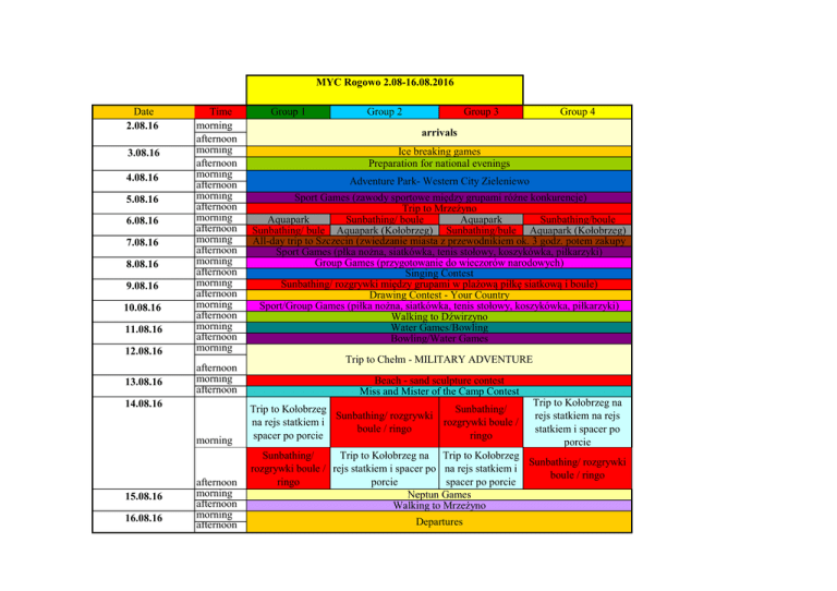 MYC Rogowo 2.08-16.08.2016 Date 2.08.16 3.08.16 4.08.16 5.08.16 6.08.16 7.08.16 8.08.16 9.08.16 10.08.16 11.08.16 12.08.16 13.08.16 Time morning afternoon morning afternoon morning afternoon morning afternoon morning afternoon morning afternoon morning afternoon morning afternoon morning afternoon morning afternoon morning afternoon morning afternoon 14.08.16 morning 15.08.16 16.08.16 afternoon morning afternoon morning afternoon Group 1 Group 2 Group 3 Group 4 arrivals Ice breaking games Preparation for national evenings Adventure Park- Western City Zieleniewo Sport Games (zawody sportowe między grupami różne konkurencje) Trip to Mrzeżyno Aquapark Sunbathing/ boule Aquapark Sunbathing/boule Sunbathing/ bule Aquapark (Kołobrzeg) Sunbathing/bule Aquapark (Kołobrzeg) All-day trip to Szczecin (zwiedzanie miasta z przewodnikiem ok. 3 godz. potem zakupy Sport Games (płka nożna, siatkówka, tenis stołowy, koszykówka, piłkarzyki) Group Games (przygotowanie do wieczorów narodowych) Singing Contest Sunbathing/ rozgrywki między grupami w plażową piłkę siatkową i boule) Drawing Contest - Your Country Sport/Group Games (piłka nożna, siatkówka, tenis stołowy, koszykówka, piłkarzyki) Walking to Dźwirzyno Water Games/Bowling Bowling/Water Games Trip to Chełm - MILITARY ADVENTURE Beach - sand sculpture contest Miss and Mister of the Camp Contest Trip to Kołobrzeg Sunbathing/ Sunbathing/ rozgrywki na rejs statkiem i rozgrywki boule / boule / ringo spacer po porcie ringo Trip to Kołobrzeg na rejs statkiem na rejs statkiem i spacer po porcie Sunbathing/ Trip to Kołobrzeg na Trip to Kołobrzeg Sunbathing/ rozgrywki rozgrywki boule / rejs statkiem i spacer po na rejs statkiem i boule / ringo ringo porcie spacer po porcie Neptun Games Walking to Mrzeżyno Departures