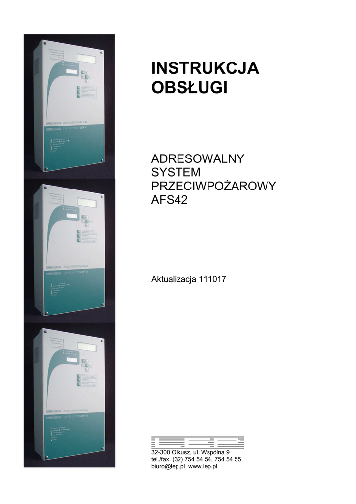 INSTRUKCJA OBSŁUGI ADRESOWALNY SYSTEM PRZECIWPOŻAROWY AFS42 Aktualizacja 111017 32-300 Olkusz, ul. Wspólna 9 tel./fax. (32) 754 54 54, 754 54 55 [email protected] www.lep.pl IO - Instrukcja Obsługi: ADRESOWALNY SYSTEM PRZECIWPOŻAROWY AFS42 111017 Strona 2 z 14 Spis treści: 1. Wstęp..........................................................................................................................................3 2. Wymagania wobec obsługi dyżurującej przy centrali..................................................................3 3. Postępowanie w przypadku alarmu ............................................................................................4 3.1.1. Potwierdzenie alarmu.......................................................................................................................................4 3.1.2. Sprawdzenie przyczyny alarmu .......................................................................................................................4 3.1.3. Kasowanie alarmu 2-go stopnia.......................................................................................................................4 4. Interfejs użytkownika...................................................................................................................5 4.1. Obsługa menu – klawiatura i wyświetlacz ...............................................................................................................6 4.2. Zawartość głównego menu......................................................................................................................................8 4.3. Listy adresów, stref, urządzeń wykonawczych, zasilaczy .......................................................................................9 4.4. Kontrolki i sygnalizacja akustyczna .......................................................................................................................10 4.5. Poziomy dostępu ...................................................................................................................................................11 5. Czynności wykonywane przez obsługę.....................................................................................12 5.1. Postępowanie w przypadku awarii ........................................................................................................................12 5.2. Blokada części systemu ........................................................................................................................................13 5.3. Ustawianie czasu...................................................................................................................................................13 5.4. Personel.................................................................................................................................................................14 5.5. Sterowanie ręczne urządzeniami wykonawczymi .................................................................................................14 5.6. Test kontrolek i sygnału dźwiękowego ..................................................................................................................14 LEP - ul. Wspólna 9, 32-300 Olkusz, tel/fax (32) 754 54 54, 754 54 55 [email protected], www.lep.pl IO - Instrukcja Obsługi: ADRESOWALNY SYSTEM PRZECIWPOŻAROWY AFS42 111017 Strona 3 z 14 1. Wstęp. Instrukcja obsługi centrali adresowalnego systemu przeciwpożarowego AFS42 zawiera informacje w zakresie niezbędnym dla personelu nadzorującego jej pracę. Od personelu wymaga się w szczególności reakcji na alarmy i awarie zgłaszane przez centralę. Centrala adresowalnego systemu pożarowego AFS42 przeznaczona jest do wczesnego wykrywania pożaru. Wykrycie pożaru sygnalizowane jest kontrolkami i sygnałem dźwiękowym. Na wyświetlaczu wymienione zostają miejsca, w których centrala wykryła pożar. Istnieje możliwość załączenia dodatkowych urządzeń wykonawczych – np. syreny, zraszacze, klapy dymowe itp. Wykrycie awarii sygnalizowane jest kontrolką, sygnałem dźwiękowym i ewentualnie dodatkowymi urządzeniami wykonawczymi. Adres jest to element sygnalizujący pożar: ROP lub czujka z modułem MAR42, linia konwencjonalna podłączona do modułu MAR42. W celu ułatwienia obsługi i poprawienia ochrony przeciwpożarowej centrala umożliwia łączenie adresów w strefy. Dla osoby obsługującej centralę oznacza to, że informowana będzie o alarmie strefy. Reakcja na alarm także dotyczyć będzie całej strefy. System AFS42 składa się z: - centrali z zasilaczem ZBP41 - linii zawierającej do 100 adresów lub 500 dla pracy sieciowej 2. Wymagania wobec obsługi dyżurującej przy centrali Wymagania obejmują: - znajomość instrukcji obsługi i stosowanie się do niej - przebywanie w miejscu umożliwiającym nadzór centrali - orientacja w chronionym obiekcie, wyjściach ewakuacyjnych i wyposażeniu w sprzęt przeciwpożarowy - znajomość rozmieszczenia adresów, urządzeń wykonawczych, organizacji adresów w strefy – pomocą są nazwy nadawane tym elementom i wyświetlane na ekranie - znajomość haseł dostępu, numerów telefonu straży pożarnej i serwisu - podjęcie prawidłowych czynności w przypadku zagrożenia – ewakuacja ludzi, ochrona mienia Ważne numery telefonów: Straż pożarna – ............................. Serwis – ......................................... Czas TP - na potwierdzenie ALARMU 1 STOPNIA przyciskiem STOP ......................... Czas TS - na sprawdzenie ALARMU 1 STOPNIA .......................... LEP - ul. Wspólna 9, 32-300 Olkusz, tel/fax (32) 754 54 54, 754 54 55 [email protected], www.lep.pl IO - Instrukcja Obsługi: ADRESOWALNY SYSTEM PRZECIWPOŻAROWY AFS42 111017 Strona 4 z 14 3. Postępowanie w przypadku alarmu Postępowanie obsługi w przypadku alarmu obejmuje: - potwierdzenie alarmu - sprawdzenie przyczyny alarmu – podjęcie decyzji: alarm prawd