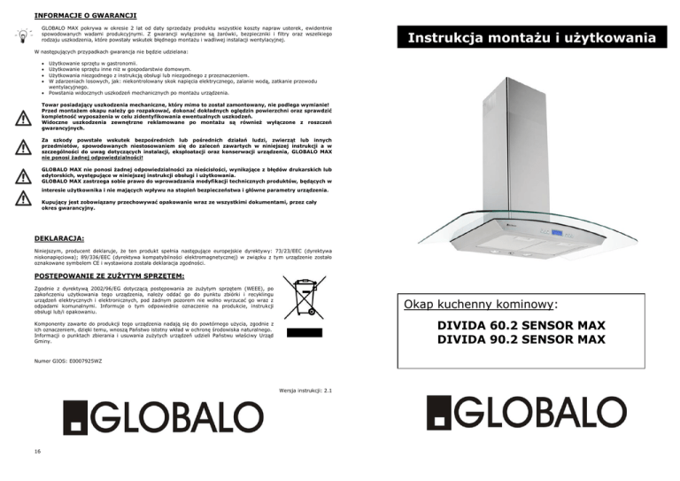 INFORMACJE O GWARANCJI GLOBALO MAX pokrywa w okresie 2 lat od daty sprzedaży produktu wszystkie koszty napraw usterek, ewidentnie spowodowanych wadami produkcyjnymi. Z gwarancji wyłączone są żarówki, bezpieczniki i filtry oraz wszelkiego rodzaju uszkodzenia, które powstały wskutek błędnego montażu i wadliwej instalacji wentylacyjnej. Instrukcja montażu i użytkowania W następujących przypadkach gwarancja nie będzie udzielana: Użytkowanie sprzętu w gastronomii. Użytkowanie sprzętu inne niż w gospodarstwie domowym. Użytkowania niezgodnego z instrukcją obsługi lub niezgodnego z przeznaczeniem. W zdarzeniach losowych, jak: niekontrolowany skok napięcia elektrycznego, zalanie wodą, zatkanie przewodu wentylacyjnego. Powstania widocznych uszkodzeń mechanicznych po montażu urządzenia. Towar posiadający uszkodzenia mechaniczne, który mimo to został zamontowany, nie podlega wymianie! Przed montażem okapu należy go rozpakować, dokonać dokładnych oględzin powierzchni oraz sprawdzić kompletność wyposażenia w celu zidentyfikowania ewentualnych uszkodzeń. Widoczne uszkodzenia zewnętrzne reklamowane po montażu są również wyłączone z roszczeń gwarancyjnych. Za szkody powstałe wskutek bezpośrednich lub pośrednich działań ludzi, zwierząt lub innych przedmiotów, spowodowanych niestosowaniem się do zaleceń zawartych w niniejszej instrukcji a w szczególności do uwag dotyczących instalacji, eksploatacji oraz konserwacji urządzenia, GLOBALO MAX nie ponosi żadnej odpowiedzialności! GLOBALO MAX nie ponosi żadnej odpowiedzialności za nieścisłości, wynikające z błędów drukarskich lub edytorskich, występujące w niniejszej instrukcji obsługi i użytkowania. GLOBALO MAX zastrzega sobie prawo do wprowadzania modyfikacji technicznych produktów, będących w interesie użytkownika i nie mających wpływu na stopień bezpieczeństwa i główne parametry urządzenia. Kupujący jest zobowiązany przechowywać opakowanie wraz ze wszystkimi dokumentami, przez cały okres gwarancyjny. DEKLARACJA: Niniejszym, producent deklaruje, że ten produkt spełnia następujące europejskie dyrektywy: 73/23/EEC (dyrektywa niskonapięciowa); 89/336/EEC (dyrektywa kompatybilności elektromagnetycznej) w związku z tym urządzenie zostało oznakowane symbolem CE i wystawiona została deklaracja zgodności. POSTĘPOWANIE ZE ZUŻYTYM SPRZĘTEM: Zgodnie z dyrektywą 2002/96/EG dotyczącą postępowania ze zużytym sprzętem (WEEE), po zakończeniu użytkowania tego urządzenia, należy oddać go do punktu zbiórki i recyklingu urządzeń elektrycznych i elektronicznych, pod żadnym pozorem nie wolno wyrzucać go wraz z odpadami komunalnymi. Informuje o tym odpowiednie oznaczenie na produkcie, instrukcji obsługi lub/i opakowaniu. Okap kuchenny kominowy: DIVIDA 60.2 SENSOR MAX DIVIDA 90.2 SENSOR MAX Komponenty zawarte do produkcji tego urządzenia nadają się do powtórnego użycia, zgodnie z ich oznaczeniem, dzięki temu, wnoszą Państwo istotny wkład w ochronę środowiska naturalnego. Informacji o punktach zbierania i usuwania zużytych urządzeń udzieli Państwu właściwy Urząd Gminy. Numer GIOS: E0007925WZ Wersja instrukcji: 2.1 16 Spis treści Wymiary i dane techniczne: 4 Napięcie: 220 – 240V Ilustracja urządzenia Wskazania bezpieczeństwa przy użytkowaniu Wskazania bezpieczeństwa przy konserwacji i czyszczeniu 5 5 5 Częstotliwość: 50 Hz Moc silnika: 200 W Obsługa okapu Panel obsługi Sterowanie elektroniczne Włączanie i wyłączanie silnika okapu Regulacja prędkości Automatyka wyłączania okapu (TIMER) Funkcja AUTO Włączanie i wyłączanie oświetlenia Funkcja regulacji natężenia oświetlenia 6 6 6 6 6 6 6 6 6 Ilość stopni prędkości 4 Konserwacja i czyszczenie Okresy międzykonserwacyjne Czyszczenie okapu Czyszczenie metalowego filtra tłuszczowego 7 7 7 7 Komunikat „FILTER” na wyświetlaczu LCD Wymiana filtra z węglem aktywnym Wymiana lampy halogenowej 8 8 8 Jak radzić sobie z problemami w eksploatacji ? Okap w ogóle nie funkcjonuje Wydajność jest niewystarczająca / Podwyższony szum eksploatacyjny Lampa halogenowa nie działa Wszystkie lampy halogenowe nie działają 9 9 Tryb pracy z wyciągiem lub z wewnętrznym obiegiem powietrza Rysunek wymiarowy urządzenia 10 10 Wskazówki dla poprawnej instalacji okapu Przyłącze elektryczne 11 11 Zestawienie dostarczonych części 12 Montaż okapu Wykonanie wewnętrznych połączeń elektrycznych Montaż ścienny 13 13 13 Montaż przewodu odprowadzającego Wykonanie przyłącza sieciowego Montaż maskownicy Uruchomienie 14 14 14 14 Wymiary i dane techniczne 15 Informacje o gwarancji Deklaracja Postępowanie ze zużytym sprzętem 16 16 16 Serwis 2 Oświetlenie: 2 x 35 W (Żarówka halogenowa 230V/35W/GU 10 ew. GZ 10) Moc maksymalna: 270 W Klasa bezpieczeństwa: I Wydajność: 820 m3/h* Średnica wylotu: Ø 150 mm + redukcja Ø 120 mm 9 9 9 *Błędne podłączenie przewodu wentylacyjnego powoduje spadek wydajności urządzenia, każde załamanie rury o 90 stopni powoduje spadek wydajności o około 10%. Każdy dodatkowy metr rury lub płaskiego kanału powoduje spadek wydajności o kolejne 5%. Zredukowanie średnicy przewodu poprzez redukcję pola przekroju poprzecznego - powoduje spadek wydajności urządzenia. Aby zachować fabryczne parametry urządzenia, należy tak planować montaż aby nie zmniejszać pola powierzchni wylotu turbiny okapu. Zamontowanie filtra węglowego w okapie obniża jego wydajność o około 25-30%. Każde stłumienie pracy silnika, spowoduje jego przyśpieszenie oraz zwiększenie głośności pracy! W ekstremalnych przypadkach, przy długotrwałej pracy na najwyższym stopniu prędkości i przy znacznie stłumionym ciągu, może doprowadzić nawet do spalenia silnika elektrycznego okapu. 15 Montaż przewodu odprowadzającego (tylko w wyciągowym trybie pracy) Szanowni Klienci, Do połączenia z otworem wentylacyjnym w ścianie, należy zastosować rurę z