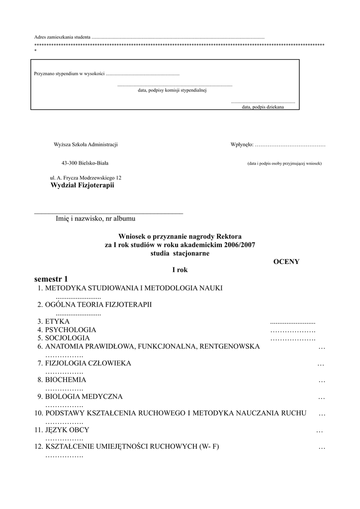 Adres zamieszkania studenta ............................................................................................................................................... ************************************************************************************************************************ * Przyznano stypendium w wysokości ............................................................. ............................................................................................... data, podpisy komisji stypendialnej ..................................................... data, podpis dziekana Wyższa Szkoła Administracji Wpłynęło: ………………………………… 43-300 Bielsko-Biała (data i podpis osoby przyjmującej wniosek) ul. A. Frycza Modrzewskiego 12 Wydział Fizjoterapii _________________________________________ Imię i nazwisko, nr albumu Wniosek o przyznanie nagrody Rektora za I rok studiów w roku akademickim 2006/2007 studia stacjonarne OCENY I rok semestr 1 1. METODYKA STUDIOWANIA I METODOLOGIA NAUKI ......................... 2. OGÓLNA TEORIA FIZJOTERAPII ......................... 3. ETYKA ......................... 4. PSYCHOLOGIA ………………. 5. SOCJOLOGIA ………………. 6. ANATOMIA PRAWIDŁOWA, FUNKCJONALNA, RENTGENOWSKA … ……………. 7. FIZJOLOGIA CZŁOWIEKA … ……………. 8. BIOCHEMIA … ……………. 9. BIOLOGIA MEDYCZNA … ……………. 10. PODSTAWY KSZTAŁCENIA RUCHOWEGO I METODYKA NAUCZANIA RUCHU … ……………. 11. JĘZYK OBCY … ……………. 12. KSZTAŁCENIE UMIEJĘTNOŚCI RUCHOWYCH (W- F) … ……………. semestr 2 1. JĘZYK OBCY ......................... 2. KSZTAŁCENIE UMIEJĘTNOŚCI RUCHOWYCH (W- F) … ……………. 3. ANATOMIA PRAWIDŁOWA, FUNKCJONALNA, RENTGENOWSKA … ……………. 4. FIZJOLOGIA CZŁOWIEKA … ……………. 5. BIOFIZYKA … ……………. 6. PATOLOGIA OGÓLNA ………… ……. 7. KWALIFIKOWANA PIERWSZA POMOC MEDYCZNA … ……………. 8. PODSTAWY KSZTAŁCENIA RUCHOWEGO I METODYKA NAUCZANIA RUCHU ..… …………… 9. KINEZYTERAPIA … …………….. 10. FIZYKOTERAPIA … …………….. 11. OGÓLNE PODSTAWY FIZJOTERAPII ……… ……….. ŚREDNIA OCEN: ............. : = …………...… ___________________________________ data i podpis studenta __________________________________ potwierdzenie przez dziekanat Wyższa Szkoła Administracji 43-300 Bielsko-Biała ul. A. Frycza Modrzewskiego 12 Wpłynęło: ………………………………… (data i podpis osoby przyjmującej wniosek) Wydział Fizjoterapii _________________________________________ Imię i nazwisko, nr albumu Wniosek o przyznanie nagrody Rektora za I rok studiów w roku akademickim 2006/2007 studia niestacjonarne OCENY I rok semestr 1 1. METODYKA STUDIOWANIA I METODOLOGIA NAUKI ......................... 2. OGÓLNA TEORIA FIZJOTERAPII ......................... 3. ETYKA ......................... 4. PSYCHOLOGIA ………………. 5. SOCJOLOGIA ………………. 6. ANATOMIA PRAWIDŁOWA, FUNKCJONALNA, RENTGENOWSKA … ……………. 7. FIZJOLOGIA CZŁOWIEKA … ……………. 8. BIOCHEMIA … ……………. 9. BIOLOGIA MEDYCZNA … ……………. 10. PODSTAWY KSZTAŁCENIA RUCHOWEGO I METODYKA NAUCZANIA RUCHU … ……………. 11. JĘZYK OBCY … ……………. 12. KSZTAŁCENIE UMIEJĘTNOŚCI RUCHOWYCH (W- F) … ……………. semestr 2 1. JĘZYK OBCY ......................... 2. KSZTAŁCENIE UMIEJĘTNOŚCI RUCHOWYCH (W- F) … ……………. 3. ANATOMIA PRAWIDŁOWA, FUNKCJONALNA, RENTGENOWSKA … ……………. 4. FIZJOLOGIA CZŁOWIEKA … ……………. 5. BIOFIZYKA … ……………. 6. PATOLOGIA OGÓLNA ………… ……. 7. KWALIFIKOWANA PIERWSZA POMOC MEDYCZNA … ……………. 8. PODSTAWY KSZTAŁCENIA RUCHOWEGO I METODYKA NAUCZANIA RUCHU ..… …………… 9. KINEZYTERAPIA … …………….. 10. FIZYKOTERAPIA …………….. 11. OGÓLNE PODSTAWY FIZJOTERAPII ……….. … ……… ŚREDNIA OCEN: ............. : = …………...… ___________________________________ data i podpis studenta __________________________________ potwierdzenie przez dziekanat Wyższa Szkoła Administracji Wpłynęło: ………………………………… 43-300 Bielsko-Biała (data i podpis osoby przyjmującej wniosek) ul. A. Frycza Modrzewskiego 12 Wydział Fizjoterapii _________________________________________ Imię i nazwisko, nr albumu Wniosek o przyznanie nagrody Rektora za II rok studiów w roku akademickim 2006/2007 studia stacjonarne OCENY II rok semestr 3 1. NEUROFIZJOLOGIA ……………. 2. KINEZJOLOGIA I BIOMECHANIKA KLINICZNA ……………. 3. PODSTAWY KSZTAŁCENIA RUCHOWEGO I METODYKA NAUCZANIA RUCHU …………. … … …… 4. MASAŻ LECZNICZY ……………. 5. KLINICZNE PODSTAWY FIZJOTERAPII ……………. 6. FIZYKOTERAPIA ……………. 7. KINEZYTERAPIA ……………. 8. JĘZYK ANGIELSKI ……………. … … … … … semestr 4 1. JĘZYK ANGIELSKI ……………. 2. TERAPIA MANUALNA ……………. 3. KLINICZNE PODSTAWY FIZJOTERAPII W WIEKU ROZWOJOWYM ……………. 4. KLINICZNE PODSTAWY FIZJOTERAPII W KARDIOLOGII ……………. 5. KLINICZNE PODSTAWY FIZJOTERAPII W PULMONOLOGII ……………. FIZJOTERAPIA KLINICZNA W DYSFUNKCJACH NARZĄDU RUCHU ……………. 6. FIZJOTERAPIA W ORTOPEDII I TRAUMATOLOGII ……………. 7. FIZJOTERAPIA W WIEKU ROZWOJOWYM ……………. FIZJOTERAPIA KLINICZNA W CHOROBACH NARZĄDÓW WEWNĘTRZNYCH ……………. 8. FIZJOTERAPIA W KARDIOLOGII I PULMONOLOGII ……………. 9. PRAKTYKI ………………. ŚREDNIA OCEN: ............. : = …………...… ___________________________________ data i podpis studenta __________________________________ potwierdzenie przez dziekanat … … … … … … … … … … Wyższa Szkoła Administracji Wpłynęło: ………………………………… 43-300 Bielsko-Biała (data i podpis osoby przyjmującej wniosek) ul. A. Frycza Modrzew