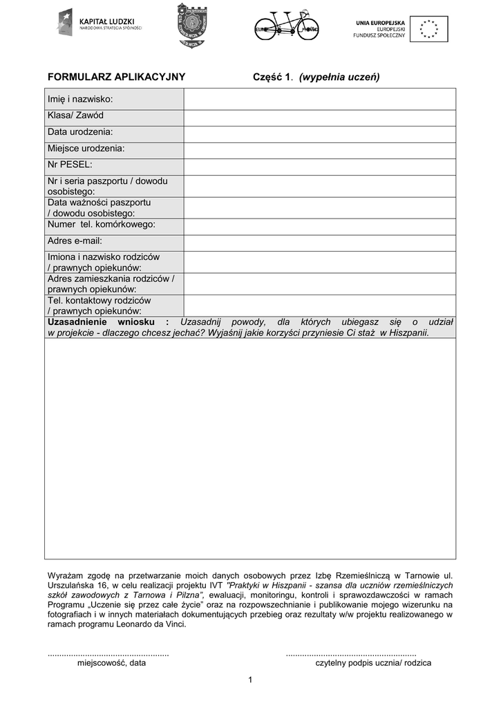 FORMULARZ APLIKACYJNY Część 1. (wypełnia uczeń) Imię i nazwisko: Klasa/ Zawód Data urodzenia: Miejsce urodzenia: Nr PESEL: Nr i seria paszportu / dowodu osobistego: Data ważności paszportu / dowodu osobistego: Numer tel. komórkowego: Adres e-mail: Imiona i nazwisko rodziców / prawnych opiekunów: Adres zamieszkania rodziców / prawnych opiekunów: Tel. kontaktowy rodziców / prawnych opiekunów: Uzasadnienie wniosku : Uzasadnij powody, dla których ubiegasz się o udział w projekcie - dlaczego chcesz jechać? Wyjaśnij jakie korzyści przyniesie Ci staż w Hiszpanii. Wyrażam zgodę na przetwarzanie moich danych osobowych przez Izbę Rzemieślniczą w Tarnowie ul. Urszulańska 16, w celu realizacji projektu IVT "Praktyki w Hiszpanii - szansa dla uczniów rzemieślniczych szkół zawodowych z Tarnowa i Pilzna”, ewaluacji, monitoringu, kontroli i sprawozdawczości w ramach Programu „Uczenie się przez całe życie” oraz na rozpowszechnianie i publikowanie mojego wizerunku na fotografiach i w innych materiałach dokumentujących przebieg oraz rezultaty w/w projektu realizowanego w ramach programu Leonardo da Vinci. .................................................... miejscowość, data ........................................................ czytelny podpis ucznia/ rodzica 1 Część 2. (wypełnia rodzic / opiekun prawny) Wyrażam zgodę na uczestnictwo mojej córki / mojego syna ………………………………………… uczennicy / ucznia klasy ……………………. w projekcie "Praktyki w Hiszpanii - szansa dla uczniów rzemieślniczych szkół zawodowych z Tarnowa i Pilzna". realizowanym przez Izbę Rzemieślniczą w Tarnowie, który obejmuje cykl zajęć pozalekcyjnych w ramach przygotowania pedagogiczno – kulturowo – językowego przed wyjazdem. Wyrażam zgodę na wyjazd na 4-tygodniowy staż zawodowy do Hiszpanii oraz działania upowszechniające rezultaty stażu po powrocie do Polski. Dodatkowe informacje o uczniu i sytuacji rodzinnej: ........................................................................... ............................................................................................................................................................. .................................................... ...................................................................... miejscowość, data czytelny podpis rodzica / prawnego opiekuna Część 3. (wypełnia wychowawca klasy) Proszę podać dane o uczniu za poprzedni semestr/ końcowe z klasy drugiej: Ocena z zachowania: Średnia ocen ogólna: Średnia ocen z przedmiotów zawodowych: Ocena z języka angielskiego: Wykaz przedmiotów zawodowych z uwzględnieniem ocen: Szczególne osiągnięcia ucznia: Opinia wychowawcy o uczniu (z uwzględnieniem środowiska rodzinnego): ..................................................... ........................................................ miejscowość, data czytelny podpis wychowawcy klasy 2
