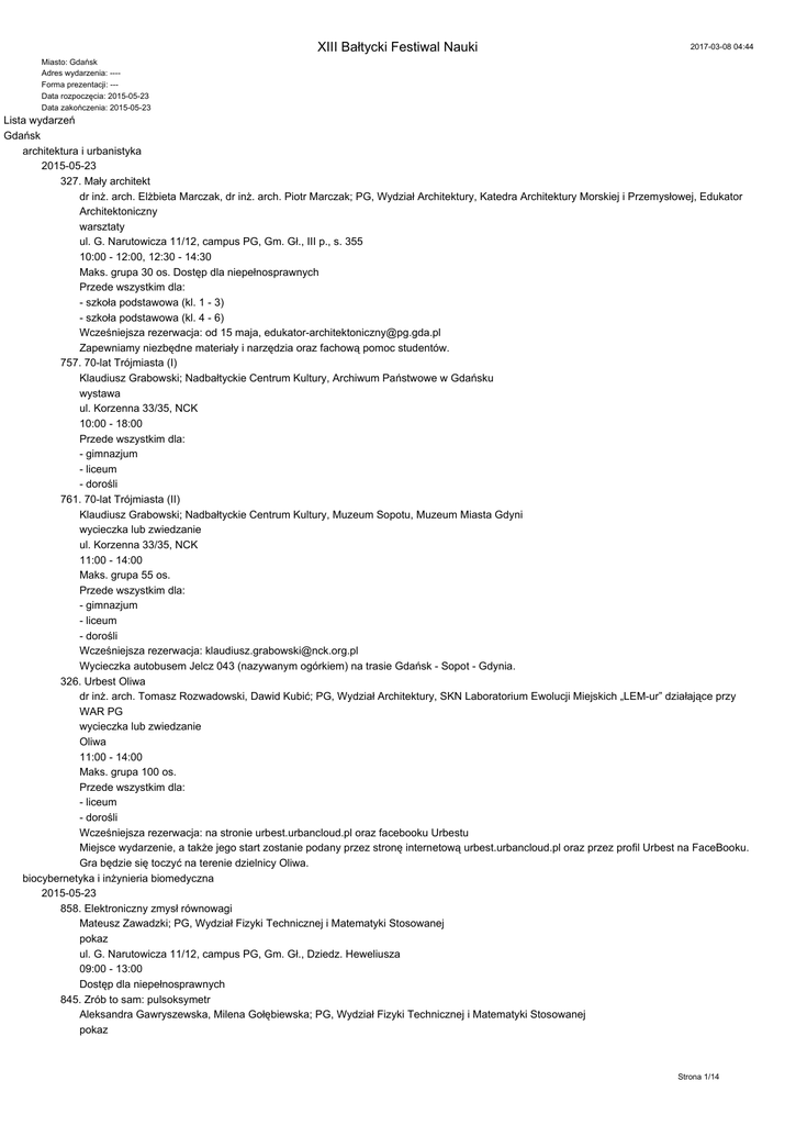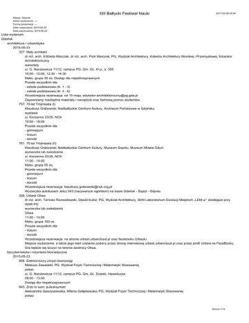 XIII Bałtycki Festiwal Nauki 2017-03-08 04:44 Miasto: Gdańsk Adres wydarzenia: ---Forma prezentacji: --Data rozpoczęcia: 2015-05-23 Data zakończenia: 2015-05-23 Lista wydarzeń Gdańsk architektura i urbanistyka 2015-05-23 327. Mały architekt dr inż. arch. Elżbieta Marczak, dr inż. arch. Piotr Marczak; PG, Wydział Architektury, Katedra Architektury Morskiej i Przemysłowej, Edukator Architektoniczny warsztaty ul. G. Narutowicza 11/12, campus PG, Gm. Gł., III p., s. 355 10:00 - 12:00, 12:30 - 14:30 Maks. grupa 30 os. Dostęp dla niepełnosprawnych Przede wszystkim dla: - szkoła podstawowa (kl. 1 - 3) - szkoła podstawowa (kl. 4 - 6) Wcześniejsza rezerwacja: od 15 maja, [email protected] Zapewniamy niezbędne materiały i narzędzia oraz fachową pomoc studentów. 757. 70-lat Trójmiasta (I) Klaudiusz Grabowski; Nadbałtyckie Centrum Kultury, Archiwum Państwowe w Gdańsku wystawa ul. Korzenna 33/35, NCK 10:00 - 18:00 Przede wszystkim dla: - gimnazjum - liceum - dorośli 761. 70-lat Trójmiasta (II) Klaudiusz Grabowski; Nadbałtyckie Centrum Kultury, Muzeum Sopotu, Muzeum Miasta Gdyni wycieczka lub zwiedzanie ul. Korzenna 33/35, NCK 11:00 - 14:00 Maks. grupa 55 os. Przede wszystkim dla: - gimnazjum - liceum - dorośli Wcześniejsza rezerwacja: [email protected] Wycieczka autobusem Jelcz 043 (nazywanym ogórkiem) na trasie Gdańsk - Sopot - Gdynia. 326. Urbest Oliwa dr inż. arch. Tomasz Rozwadowski, Dawid Kubić; PG, Wydział Architektury, SKN Laboratorium Ewolucji Miejskich „LEM-ur” działające przy WAR PG wycieczka lub zwiedzanie Oliwa 11:00 - 14:00 Maks. grupa 100 os. Przede wszystkim dla: - liceum - dorośli Wcześniejsza rezerwacja: na stronie urbest.urbancloud.pl oraz facebooku Urbestu Miejsce wydarzenie, a także jego start zostanie podany przez stronę internetową urbest.urbancloud.pl oraz przez profil Urbest na FaceBooku. Gra będzie się toczyć na terenie dzielnicy Oliwa. biocybernetyka i inżynieria biomedyczna 2015-05-23 858. Elektroniczny zmysł równowagi Mateusz Zawadzki; PG, Wydział Fizyki Technicznej i Matematyki Stosowanej pokaz ul. G. Narutowicza 11/12, campus PG, Gm. Gł., Dziedz. Heweliusza 09:00 - 13:00 Dostęp dla niepełnosprawnych 845. Zrób to sam: pulsoksymetr Aleksandra Gawryszewska, Milena Gołębiewska; PG, Wydział Fizyki Technicznej i Matematyki Stosowanej pokaz Strona 1/14 XIII Bałtycki Festiwal Nauki 2017-03-08 04:44 ul. G. Narutowicza 11/12, campus PG, Gm. Gł., Dziedz. Heweliusza 09:00 - 13:00 Dostęp dla niepełnosprawnych biologia 2015-05-23 113. Pomiędzy czernią a bielą. Dzieci z Sanfilippo dr Ewa Piotrowska, mgr Patrycja Juchniewicz, mgr Wioletta Kobiela, Karolina Portalska; UG, Wydział Biologii, Katedra Biologii Molekularnej wystawa ul. Wita Stwosza 59, UG WB, hol gł. 08:00 - 20:00 Dostęp dla niepełnosprawnych 41. Z punktu widzenia kormorana: kolonia i reszta świata dr Michał Goc; UG, Wydział Biologii wykład i wycieczka ul. Wita Stwosza 59, UG WB, wykład - aula (8:30), wycieczka - Kąty Rybackie (zbiórka przed bud.) 08:30 - 16:00 Maks. grupa 50 os. Dostęp dla niepełnosprawnych Przede wszystkim dla: - gimnazjum - liceum - dorośli Wcześniejsza rezerwacja: do 11 maja, [email protected] Sponsorzy i patroni: WFOŚiGW w Gdańsku W przypadku zgłaszania grup szkolnych proszę ograniczyć ich wielkość do 20 osób z jednej placówki, żeby dać szansę innym. 324. Ujście Wisły. Ścieżki Natury (II) mgr inż. Jowita Kurach; Grupa Badawcza Ptaków Wodnych KULING wycieczka lub zwiedzanie Wyspa Sobieszewska, Świbno, rezerwat przyrody Mewia Łacha 09:25 - 13:15 Maks. grupa 25 os. Przede wszystkim dla: - dorośli Wcześniejsza rezerwacja: [email protected] Sponsorzy i patroni: LOTOS Dla osób indywidualnych, rodzin. Zbiórka - przystanek autobusu 112 'Przystań' w Świbnie (dojazd autobusem 112 z Gdańska we własnym zakresie). 638. Bioróżnorodność - poznaj by zachować III mgr inż. Jowita Kurach, mgr sztuki Joanna Lepczak-Michalska, mgr Kamila Kozieł, mgr Katarzyna Sulewska; Centrum Informacji i Edukacji Ekologicznej w Gdańsku, Pomorski Zespół Parków Krajobrazowych gra terenowa Park Nadmorski im. Ronalda Reagana 10:00 - 14:00 Sponsorzy i patroni: WFOŚiGW w Gdańsku, EOG, Gdynia, GIWK, Marszałek Województwa Pomorskiego, Prezydenci Gdańska, Gdyni, Radio Gdańsk, Trójmiasto.pl 228. Spotkajmy się w Zaułku Pasteura… mgr Grzegorz M. Cech, dr Anna Kloska, mgr Joanna Karczewska-Golec; UG, Wydział Biologii, Katedra Biologii Molekularnej wystawa ul. Wita Stwosza 59, UG WB, skrz. A, I p., Zaułek Pasteura 10:00 - 20:00 Dostęp dla niepełnosprawnych Sponsorzy i patroni: American Society for Microbiology 635. Bioróżnorodność - poznaj by zachować II mgr inż. Jowita Kurach, mgr sztuki Joanna Lepczak-Michalska, mgr Kamila Kozieł, mgr Katarzyna Sulewska; Centrum Informacji i Edukacji Ekologicznej w Gdańsku, Pomorski Zespół Parków Krajobrazowych piknik naukowy Park Nadmorski im. Ronalda Reagana 11:00 - 18:00 Dostęp dla niepełnosprawnych Sponsorzy i patroni: WFOŚiGW w Gdańsku, EOG,Gdynia, Marszałek Województwa Pomorskiego, Prezydenci Gdańska, Gdyni, Radio Gdańsk, Trójmiasto.pl budowa i eksploatacja maszyn 2015-05-23 107. Pokaz ekologicznego pojazdu skonstruowanego przez studentów Wydziału Mechanicznego Piotr Andrzejewski; PG, Wydział Mechaniczny, KN Konstruktorów Pojazdów pokaz Strona 2/14 XIII Bałtycki Festiwal Nauki 2017-03-08 04:44 ul. G. Narutowicza 11/12, campus PG, Gm. Gł. 10:00 - 16:00 Sponsorzy i patroni: WFOŚiGW w Gdańsku budownictwo 2015-05-23 483. Most światłem malowany - wystawa pokonkursowa mgr inż. Anna Banaś, inż. Magdalena Ozimek; PG, Wydział Inżynierii Lądowej i Środowiska, KN Młodych Mostowców MOST WANTED wystawa ul. G. Narutowicza 11/12, campus PG, bud. 1 (Gm. Gł.), hol przed Biblioteką Główną 08:00 - 21:00 Dostęp dla niepełnosprawnych Sponsorzy i patroni: Dziekan Wydziału Inżynierii Lądowej i Środowiska, Gdańskie Towarzystwo Fotograficzne Do zdję