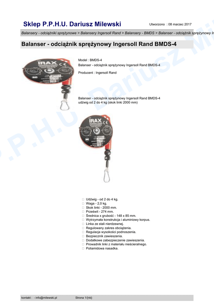 Sklep P.P.H.U. Dariusz Milewski Utworzono : 08 marzec 2017 i M Balansery - odciążniki sprężynowe > Balansery Ingersoll Rand > Balansery - BMDS > Balanser - odciążnik sprężynowy In Balanser - odciążnik sprężynowy Ingersoll Rand BMDS-4 z s u i r a D . Model : BMDS-4 Balanser - odciążnik sprężynowy Ingersoll Rand BMDS-4 Producent : Ingersoll Rand Balanser - odciążnik sprężynowy Ingersoll Rand BMDS-4 udźwig od 2 do 4 kg (skok linki 2000 mm) U . H . P . P � Udźwig - od 2 do 4 kg. � Waga - 2,0 kg. � Skok linki - 2000 mm. � Prześwit - 274 mm. � Średnica x grubość - 148 x 85 mm. � Wytrzymała konstrukcja i aluminiowy korpus. � Linka ze stali nierdzewnej. � Regulowany zakres obciążenia. � Regulacja wysokości podnoszenia. � Bezpiecznik zawieszenia. � Dodatkowe zabezpieczenie zawieszenia. � Prowadnik linki z materiału nieścieralnego. � Poliamidowa nasadka. kontakt : - [email protected] Strona 1/{nb} Sklep P.P.H.U. Dariusz Milewski Utworzono : 08 marzec 2017 i M Balansery - odciążniki sprężynowe > Balansery Ingersoll Rand > Balansery - BMDS > Balanser - odciążnik sprężynowy In Balanser - odciążnik sprężynowy Ingersoll Rand BMDS-4 z s U . H . P u i r a D . . P kontakt : - [email protected] Strona 2/{nb} Sklep P.P.H.U. Dariusz Milewski Utworzono : 08 marzec 2017 i M Balansery - odciążniki sprężynowe > Balansery Ingersoll Rand > Balansery - BMDS > Balanser - odciążnik sprężynowy In Balanser - odciążnik sprężynowy Ingersoll Rand BMDS-4 z s U . H . P u i r a D . Balansery-odciążniki sprężynowe BIDS, BHD, BSD,BSDL standartowo wyposażone w zabezpieczenie przed opadnięciem ładunku przy pęknięciu sprężyny, mają także obrotowy hak górny. Balansery-odciążniki sprężynowe BHD,BSD,BSDL wyposażone są w ręczną blokadę linki. Jako wyposażenie dodatkowe możliwe sterowanie z poziomu operatora. Czerwone odciążniki produkcji Ingersoll Rand składają się z pięciu różnych serii odciążników, aby wypełnić zapotrzebowanie na cały zakres obciążeń. Balansery-odciążniki sprężynowe małe, średnie, wzmocnione, duże i bardzo duże zapewniają zrównoważenie ciężarów od 0,4 do 180 kg. Obudowy odciążników są wykonane z odlewanego aluminium. Bezpiecznik zamontowany w odciążnikach wzmocnionych dużych i bardzo dużych uniemożliwia upadek ciężaru w przypadku awarii sprężyny. Odciążniki umożliwiają łatwą i dokładną kontrolę napięcia sprężyny. Z ponad 60 modeli można wybrać odpowiedni zakres udźwigu i zakres podnoszenia od 1300 do 3000 mm. Odciążniki wypełniają wymagania łącząc je z jakością z Ingersoll Rand. Balansery BMDLLN-4, BMDLLN-6, BMDLLN-8, BMDLLN-1O posiadają mechanizm blokujący zwijanie linki, który umożliwia pracę bez naprężeń linki, np. we wnętrzu samochodu. Blokada jest uruchamiana przez wolne wsuwanie krótkiego odcinka linki do obudowy. Blokowanie zwijania jest anulowane przez pociągnięcie linki w dół. . P Krótki opis: Balansery-odciążniki sprężynowe służą do podwieszania różnych urządzeń i mają za zadanie równoważenie ciężaru podwieszanych narzędzi, przejmują ciężar podwieszonego urządzenia. Praca osoby obsługującej urządzenie jest mniej męcząca i dużo kontakt : - [email protected] Strona 3/{nb} Sklep P.P.H.U. Dariusz Milewski Utworzono : 08 marzec 2017 i M Balansery - odciążniki sprężynowe > Balansery Ingersoll Rand > Balansery - BMDS > Balanser - odciążnik sprężynowy In Balanser - odciążnik sprężynowy Ingersoll Rand BMDS-4 z s lżejsza. Balansery-obciążniki sprężynowe mają także zastosowanie w wielu gałęziach przemysłu, gdzie potrzebne jest podwieszenie narzędzi. Mają szerokie zastosowanie np. w przemyśle mięsnym-do podwieszania różnych urządzeń na linii ubojowej między innymi do klasyfikacji zwierząt, pił do rozbioru mięsa i przepoławiania tusz. u i r a D . O firmie: Historia Ingersoll Rand sięga 1871 roku, gdy Simon Ingersoll opatentował zasilaną parą wodną wiertarkę udarową do wiercenia w skale. Dało to podwaliny dla utworzenia firmy Ingersoll Rock Drill. W roku 1872 Albert Rand założył firmę Rand & Waring Drill and Compressor, która siedem lat później zmieniła nazwę na Rand Drill. W 1905 roku obie firmy połączyły się tworząc firmę Ingersoll Rand. U . H . P . P Ingersoll Rand dzisiaj: Ingersoll Rand jest globalną firmą dostarczającą produkty, usługi oraz zintegrowane rozwiązania dla transportu, produkcji, budownictwa i rolnictwa. Ingersoll Rand to 100 letnia tradycja innowacji i usprawnień, które pomagają firmom stać się bardziej wydajnymi, efektywnymi i nowocześniejszymi. Przykładami mogą być : kriogeniczne zamrażanie, stosowane przy przechowywaniu produktów rolnych na całym świecie, biometryczne systemy dostępu dla zapewnienia bezpieczeństwa na lotniskach, w budynkach przemysłowych i biurowych, skuteczne ujarzmienie powietrza i wykorzystanie go do zasilania narzędzi pneumatycznych oraz w innych procesach przemysłowych, wszechstronnego użytku pojazdy do transportu osób i towarów. W każdej gałęzi gospodarki Ingersoll Rand umożliwia przedsiębiorstwom i ich klientom szybszy rozwój. Różnorodne produkty Ingersoll Rand obejmują rozpoznawalne marki handlowe: Schlage, CISA, Interflex - zamki i systemy kontroli dostępu. Thermo King - technologie chłodnicze w transporcie. Hussmann, Koxka - urządzenia chłodnicze w punktach sprzedaży detalicznej i hurtowej. Bobcat - uniwersalne pojazdy. Club Car - akumulatorowe wózki golfowe i przemysłowe. ABG - maszyny do budowy dróg. Ingersoll Rand - sprzęt przemysłowy i budowlany. Materiały informacyjne: Cena : 809,34 zł Brutto ( 658,00 zł Netto) kontakt : - [email protected] Strona 4/{nb} Sklep P.P.H.U. Dariusz Milewski Utworzono : 08 marzec 2017 i M Balansery - odciążniki sprężynowe > Balansery Ingersoll Rand > Balansery - BMDS > Balanser - odciążnik sprężynowy In Balanser 