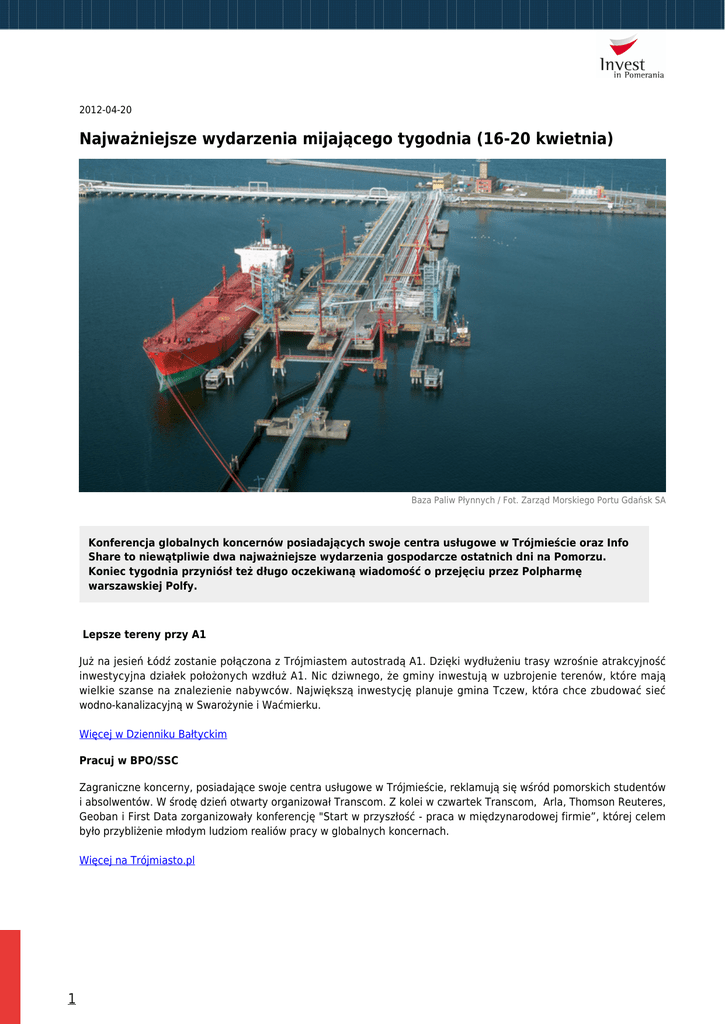 2012-04-20 Najważniejsze wydarzenia mijającego tygodnia (16-20 kwietnia) Baza Paliw Płynnych / Fot. Zarząd Morskiego Portu Gdańsk SA Konferencja globalnych koncernów posiadających swoje centra usługowe w Trójmieście oraz Info Share to niewątpliwie dwa najważniejsze wydarzenia gospodarcze ostatnich dni na Pomorzu. Koniec tygodnia przyniósł też długo oczekiwaną wiadomość o przejęciu przez Polpharmę warszawskiej Polfy. Lepsze tereny przy A1 Już na jesień Łódź zostanie połączona z Trójmiastem autostradą A1. Dzięki wydłużeniu trasy wzrośnie atrakcyjność inwestycyjna działek położonych wzdłuż A1. Nic dziwnego, że gminy inwestują w uzbrojenie terenów, które mają wielkie szanse na znalezienie nabywców. Największą inwestycję planuje gmina Tczew, która chce zbudować sieć wodno-kanalizacyjną w Swarożynie i Waćmierku. Więcej w Dzienniku Bałtyckim Pracuj w BPO/SSC Zagraniczne koncerny, posiadające swoje centra usługowe w Trójmieście, reklamują się wśród pomorskich studentów i absolwentów. W środę dzień otwarty organizował Transcom. Z kolei w czwartek Transcom, Arla, Thomson Reuteres, Geoban i First Data zorganizowały konferencję "Start w przyszłość - praca w międzynarodowej firmie”, której celem było przybliżenie młodym ludziom realiów pracy w globalnych koncernach. Więcej na Trójmiasto.pl 1 Info Share W czwartek na Politechnice Gdańskiej rozpoczęło się Info Share – jedna z najważniejszych imprez gospodarczych na Pomorzu. Pierwotnie było to spotkanie specjalistów z branży IT. Obecnie formuła została poszerzona i na Info Share poruszane są także tematy związane z prowadzeniem biznesu, marketingiem i mediami. Więcej na Gazeta.Trójmiasto.pl „Syn Antares” pozostaje turystyczną atrakcją Trwa sądowy spór o statek „Syn Antares”, który stoi na pochyli gdańskiej stoczni od 2009 roku. Budowę statku zlecił armator z Włoch, który ogłosił później upadłość. Proces upadłościowy trwa, a widok na olbrzymi okręt pozostaje atrakcją dla turystów i mieszkańców Gdańska. Więcej na Trójmiasto.pl Inwestycje w Naftoporcie W związku z budową w Gdańsku bazy paliw płynnych przez PERN, Naftoport inwestuje w niezbędną infrastrukturę, która umożliwi obsługę tejże bazy. Powstanie, m.in.: drugie ramie przeładunkowe przy stanowisku „O” oraz stworzone zostaną dwa zupełnie nowe stanowiska. Więcej na Trójmiasto.pl Chińczycy wejdą w pomorską energetykę? Trwa przetarg na budowę elektrowni w Rajkowach. Wśród 7 oferentów znajduje się również podmiot z Chin. Elektrownia Północ będzie elektrownią węglową o mocy 2 tys. MW. Inwestycja wyceniana jest na 10-12 mld zł. Więcej w Dzienniku Bałtyckim Polpharma kupuje Polfę Polfarma kupiła 85,14% akcji Polfy Warszawa będącej dotąd w posiadaniu Polskiego Holdingu Farmaceutycznego i Skarbu Państwa. Polfa to jeden z najważniejszych graczy w polskiej branży farmaceutycznej. Dzięki włączeniu do Grupy Polpharma, Polfa zyskuje dostęp do rynków w naszej części Europy, w Azji Centralnej i na Kaukazie. Więcej na Gazeta.Trójmiasto.pl Stocznia Gdańsk wyposaży wietnamską policję Gdańska stocznia prowadzi rozmowy z Wietnam Police Marine. Chodzi o budowę czterech lub nawet pięciu statków patrolowo-ratowniczych. Obecnie ustalane są szczegóły techniczne i terminy. Kontrakt powinien zostać podpisany w czerwcu. Więcej w Dzienniku Bałtyckim Zielone światło dla elektrowni wiatrowych Rząd wydał pozwolenia na budowę farm wiatrowych spółkom z grupy PGE. Na rozpatrzenie czekają kolejne wnioski. Energetyka wiatrowa to jeden z najbardziej perspektywicznych sektorów pomorskiej gospodarki. Więcej w Dzienniku Bałtyckim 2