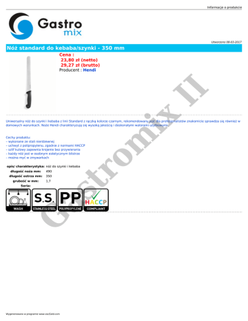 Informacje o produkcie Utworzono 08-03-2017 Nóż standard do kebaba/szynki - 350 mm Cena : 23,80 zł (netto) 29,27 zł (brutto) ix II Producent : Hendi tr o Cechy produktu: – wykonane ze stali nierdzewnej – uchwyt z polipropylenu, zgodnie z normami HACCP – szlif kulowy zapewnia krojenie bez przywierania – każdy nóż jest w osobnym estetycznym blistrze – można myć w zmywarkach opis/ charakterystyka: nóż do szynki i kebaba długość noża mm: 490 długość ostrza mm: 350 grubość w mm: 1,7 G as Seria: Wygenerowano w programie www.oscGold.com m Uniwersalny nóż do szynki i kebaba z linii Standard z rączką kolorze czarnym, rekomendowany jest dla profesjonalistów znakomicie sprawdza się również w domowych warunkach. Noże Hendi charakteryzują się wysoką jakością i doskonałymi walorami użytkowymi.