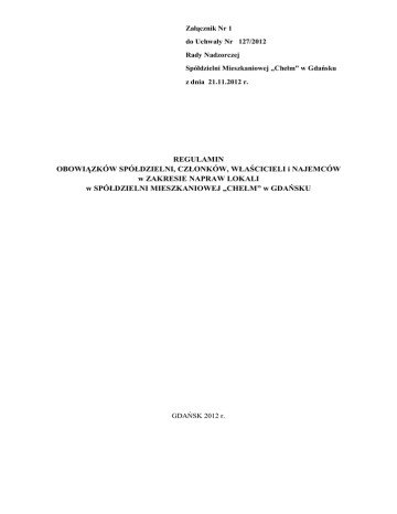Załącznik Nr 1 do Uchwały Nr 127/2012 Rady Nadzorczej Spółdzielni Mieszkaniowej „Chełm” w Gdańsku z dnia 21.11.2012 r. REGULAMIN OBOWIĄZKÓW SPÓŁDZIELNI, CZŁONKÓW, WŁAŚCICIELI i NAJEMCÓW w ZAKRESIE NAPRAW LOKALI w SPÓŁDZIELNI MIESZKANIOWEJ „CHEŁM” w GDAŃSKU GDAŃSK 2012 r. REGULAMIN OBOWIĄZKÓW SPÓŁDZIELNI, CZŁONKÓW, WŁAŚCICIELI i NAJEMCÓW w ZAKRESIE NAPRAW LOKALI w SPÓŁDZIELNI MIESZKANIOWEJ „CHEŁM" w GDAŃSKU Podstawa prawna 1. 2. 3. 4. 5. 6. 7. § 1. Ustawa „Prawo spółdzielcze” z dnia 16 września 1982 r. - tekst jednolity - ( Dz. U. z 2003 r. nr 188/2003 poz. 1848 z późn. zm.). Ustawa „o spółdzielniach mieszkaniowych” z dnia 15 grudnia 2000 r. (Dz. U. z 2003r. nr 119 poz. 1116 z późn. zm.). Ustawa z dnia 24 czerwca 1994 o własności lokali ( Dz. U. z 2000r. Nr 80, poz. 903 z późn. zm) Ustawa z dnia 7 lipca 1994r. Prawo Budowlane (Dz. U. z 2010r., Nr 243, poz. 1623 z późn. zm.). Rozporządzenie Ministra Infrastruktury z dnia 12 kwietnia 2002r. w sprawie warunków technicznych jakim powinny odpowiadać budynki i ich usytuowanie ( Dz. U. Nr 75, poz. 690 z późn. zm.). Rozporządzenie MSWiA z dnia 7 czerwca 2010 roku o ochronie przeciwpożarowej budynków, innych obiektów budowlanych i terenów ( Dz. U. Nr 109, poz. 719). Statut SM „CHEŁM” w Gdańsku. Postanowienia ogólne. § 2. Na podstawie § 38 ust. 1. pkt 24) Statutu Spółdzielni, w związku z art. 46 § 2 ustawy „Prawo spółdzielcze”, niniejszym Regulaminem określa się zasady napraw wewnątrz lokali obowiązujące w zasobach Spółdzielni Mieszkaniowej „CHEŁM” w Gdańsku. § 3. Użyte w regulaminie określenia oznaczają: 1. Właściciel lokalu – to osoba fizyczna, osoba prawna lub jednostka nie mająca osobowości prawnej posiadająca prawo odrębnej własności lokalu. 2. Użytkownik lokalu - to osoba fizyczna, osoba prawna lub jednostka nie mając osobowości prawnej posiadająca Spółdzielcze własnościowe prawo do lokalu. 3. Najemca lokalu - to osoba fizyczna, osoba prawna lub jednostka nie mająca osobowości prawnej posiadająca tytuł prawny do lokalu inny niż „właściciel lokalu” lub „użytkownik lokalu” albo zajmująca lokal bez tytułu prawnego. 4. Części wspólne - części budynku, urządzeń oraz instalacji, które nie służą wyłącznie właścicielom i użytkownikom lokali (klatki schodowe, pomieszczenia wspólnego użytku suszarnie, korytarze piwniczne, pomieszczenia techniczne, instalacje: wodnokanalizacyjne, gazowe, centralnego ogrzewania, elektryczne). 5. Pomieszczenie przynależne – komórka piwniczna i inne dodatkowe pomieszczenia indywidualnie przyznane przez Spółdzielnię do użytkowania. § 4. 1. Naprawy wewnątrz lokali nie zaliczone do obowiązków Spółdzielni obciążają właścicieli lokali, użytkowników lokali oraz najemców lokali. 2. Naprawy wewnątrz lokali zaliczone do obowiązków Spółdzielni finansowane są na zasadach określonych w odrębnych regulaminach. § 5. Przestrzeganie postanowień niniejszego Regulaminu jest obowiązkiem organów Spółdzielni oraz właścicieli lokali i pozostałych użytkowników. Obowiązki Spółdzielni wobec właścicieli, użytkowników i najemców lokali. § 6. 1. Spółdzielnia zobowiązana jest usunąć awarię oraz dokonać napraw lub wymiany: a) przewodów instalacji wodociągowej - wody zimnej i ciepłej do pierwszego zaworu odcinającego w lokalu łącznie z zaworem, a w przypadku wymiany wodomierzy na zlecenie Spółdzielni z wodomierzem - bez urządzeń odbierających. b) głównego pionu kanalizacyjnego wraz z trójnikiem - bez podłączeń urządzeń odbierających do pionu, c) instalacji gazowej do pierwszego zaworu przy odbiorniku łącznie z zaworem - bez urządzeń odbierających i licznika, którego wymiana jest obowiązkiem dostawcy gazu, d) pionów instalacji elektrycznej do licznika, e) całej instalacji centralnego ogrzewania łącznie z wymianą grzejników, zaworów grzejnikowych i głowic termostatycznych, f) instalacji cyrkulacji ciepłej wody użytkowej, g) wymiana lub naprawa instalacji domofonowej w budynku i lokalu, h) anteny zbiorczej (AZART) lub instalacji osiedlowej telewizji kablowej, jeżeli była standardowym wyposażeniem, bez osprzętu, w mieszkaniu, i) instalacji odgromowej w całości. 2. Spółdzielnia zobowiązana jest również do udrażniania kanalizacji sanitarnej w przypadku zatkania pionu. 3. Spółdzielnia zobowiązana jest nadto do naprawy polegającej na usunięciu zniszczeń powstałych wewnątrz lokalu wskutek zacieków z dachu, przemarzania ścian czy awarii centralnego ogrzewania, instalacji wodnych i kanalizacyjnych - z wyłączeniem szkód, za które użytkownik otrzymał odszkodowanie od ubezpieczyciela. § 7. Dokonanie przez właściciela, użytkownika lub najemcę lokalu przeróbek instalacji, o jakich mowa w § 6 ust.1 ppkt. b, c, d, e, jak również wszystkie uszkodzenia wewnątrz lokalu powstałe z winy właściciela, użytkownika lub najemcy lokalu zwalniają Spółdzielnię z obowiązku nieodpłatnego wykonania napraw tych instalacji. Obowiązki użytkowników i najemców lokali § 8. 1. Obowiązkiem właścicieli, użytkowników i najemców lokali jest systematyczne odnawianie lokalu, poprzez: a) malowanie ścian i sufitów wewnątrz lokalu po usunięciu drobnych uszkodzeń tynku, b) konserwację stolarki okiennej i drzwiowej, c) malowanie olejne (w miarę potrzeb) grzejników żeliwnych, d) malowanie ścian logii i balkonów po usunięciu drobnych uszkodzeń tynku z zachowaniem dotychczasowej kolorystyki, e) malowanie olejne balustrad balkonowych z zachowaniem dotychczasowej kolorystyki, f) odnawianie pomieszczeń przynależnych do lokalu (komórka piwniczna). 2. Użytkownicy i najemcy lokali są zobowiązani również do dokonywania wszelkich napraw wewnątrz lokalu, a w szczególności: a) wymiany lub naprawy pokrycia podłóg wraz z listwami przypodłogowymi, b) wymiany lub naprawy stolarki