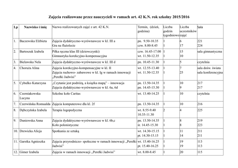Zajęcia realizowane przez nauczycieli w ramach art. 42 K.N. rok