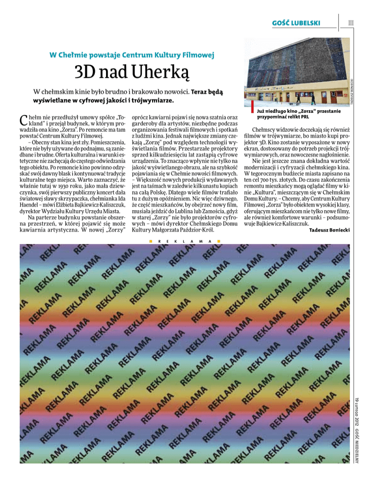 gość lubelski III W Chełmie powstaje Centrum Kultury Filmowej Tadeusz Boniecki 3D nad Uherką W chełmskim kinie było brudno i brakowało nowości. Teraz będą wyświetlane w cyfrowej jakości i trójwymiarze. C hełm nie przedłużył umowy spółce „Tokland” i przejął budynek, w którym prowadziła ona kino „Zorza”. Po remoncie ma tam powstać Centrum Kultury Filmowej. – Obecny stan kina jest zły. Pomieszczenia, które nie były używane do podnajmu, są zaniedbane i brudne. Oferta kulturalna i warunki estetyczne nie zachęcają do częstego odwiedzania tego obiektu. Po remoncie kino powinno odzyskać swój dawny blask i kontynuować tradycje kulturalne tego miejsca. Warto zaznaczyć, że właśnie tutaj w 1930 roku, jako mała dziewczynka, swój pierwszy publiczny koncert dała światowej sławy skrzypaczka, chełmianka Ida Haendel – mówi Elżbieta Bajkiewicz-Kaliszczuk, dyrektor Wydziału Kultury Urzędu Miasta. Na parterze budynku powstanie obszerna przestrzeń, w której pojawić się może kawiarnia artystyczna. W nowej „Zorzy” oprócz kawiarni pojawi się nowa szatnia oraz garderoby dla artystów, niezbędne podczas organizowania festiwali filmowych i spotkań z ludźmi kina. Jednak największe zmiany czekają „Zorzę” pod względem technologii wyświetlania filmów. Przestarzałe projektory sprzed kilkudziesięciu lat zastąpią cyfrowe urządzenia. To znacząco wpłynie nie tylko na jakość wyświetlanego obrazu, ale na szybkość pojawiania się w Chełmie nowości filmowych. – Większość nowych produkcji wydawanych jest na taśmach w zaledwie kilkunastu kopiach na całą Polskę. Dlatego wiele filmów trafiało tu z dużym opóźnieniem. Nic więc dziwnego, że część mieszkańców, by obejrzeć nowy film, musiała jeździć do Lublina lub Zamościa, gdyż w starej „Zorzy” nie było projektorów cyfrowych – mówi dyrektor Chełmskiego Domu Kultury Małgorzata Paździor-Król. ■ r e k l a m a Już niedługo kino „Zorza” przestanie przypominać relikt PRL Chełmscy widzowie doczekają się również filmów w trójwymiarze, bo miasto kupi projektor 3D. Kino zostanie wyposażone w nowy ekran, dostosowany do potrzeb projekcji trójwymiarowych, oraz nowoczesne nagłośnienie. Nie jest jeszcze znana dokładna wartość modernizacji i cyfryzacji chełmskiego kina. W tegorocznym budżecie miasta zapisano na ten cel 700 tys. złotych. Do czasu zakończenia remontu mieszkańcy mogą oglądać filmy w kinie „Kultura”, mieszczącym się w Chełmskim Domu Kultury. – Chcemy, aby Centrum Kultury Filmowej „Zorza” było obiektem wysokiej klasy, oferującym mieszkańcom nie tylko nowe filmy, ale również komfortowe warunki – podsumowuje Bajkiewicz-Kaliszczuk. Tadeusz Boniecki ■ 19 lutego 2012 Gość Niedzielny VI gość lubelski Warsztaty dla rodziców i wychowawców Zobacz to okiem syna Alicja Wiśniewska O szkole dla rodziców i o tym jak można się tam nauczyć konstruktywnie rozwiązywać konflikty z dziećmi, z dr Małgorzatą Wyżlic, pracownikiem INOR KUL, dyrektorem Niepublicznej Szkoły Podstawowej „Skrzydła” i realizatorem Szkoły dla Rodziców i Wychowawców rozmawia Justyna Jarosińska. Justyna Jarosińska: 5 marca rusza kolejna edycja Szkoły dla Rodziców i Wychowawców. Kto do takiej szkoły „chodzi” i w jakim celu? Małgorzatka Wyżlic: Na zajęcia Szkoły przychodzą rodzice i nauczyciele. Obie grupy z różną motywacją. Czasem dana osoba ma poczucie, że nie radzi sobie w kontakcie z dzieckiem, że używa metod wychowawczych, które nie są skuteczne, albo których obiecywała sobie nigdy nie używać (krzyk, bicie itp.). Czasem uczestnicy czują, że sobie radzą w kontakcie z dziećmi, natomiast pragną głębszej relacji z nimi. Małgorzata Wyżlic – od kilku lat regularnie prowadzi warsztaty dla rodziców Gość Niedzielny 19 lutego 2012 ■ r e Czego można się spodziewać na zajęciach w „szkole”? k l a m a ■ Szkoła dla Rodziców i Wychowawców to dziesięć cotygodniowych spotkań, każde po ok. 3 godziny. Zajęcia prowadzone są metodą warsztatową, która pozwala uczestnikom na odczucie wielu sytuacji z perspektywy dziecka. Pomaga to zrozumieć, że wiele z tego co rodzice robią, jak postępują, jest nieskuteczne, a ponadto wzbudza złość i niechęć dzieci. Dzięki temu doświadczeniu rodzice zyskują motywację do użycia nowych metod wychowawczych. Czego uczą się „uczniowie” w Szkole dla Rodziców i Wychowawców? Zajęcia obejmują min. pracę nad akceptowaniem uczuć, dawaniem prawa sobie i dziecku do przeżywania uczuć nieprzyjemnych, trudnych w taki sposób, aby nie ranić siebie i innych. Uczestnicy pracują też nad tym w jaki sposób stawiać dziecku granice, bo jak się okazuje wielu rodziców nie potrafi mówić „nie” w taki sposób, by dziecko miało przekonanie, że dane zachowanie jest nieakceptowane. Pochylamy się też nad tym, czy karać dzieci czy nie, jak zachęcać do współpracy, czyli co zrobić, aby dzieci same z siebie chciały wykonać to czego rodzice oczekują. Ważne jest to, że prowadzący ani nikt z uczestników nie udziela innym rad jak postępować ze swoimi dziećmi. Chodzi o to, aby każdy sam, na postawie zdobytej wiedzy wypracował własne sposoby zachowań wobec dziecka. Program Szkoły podzielono na trzy części: „Jak mówić, żeby dzieci słuchały, jak słuchać, żeby dzieci mówiły” – to część podstawowa, trzeba koniecznie ją przejść aby skorzystać z następnych propozycji. „Rodzeństwo bez rywalizacji” oraz „Jak mówić do nastolatków, aby chciały słuchać”. Czy nie wystarczy przeczytać książki o wychowaniu dzieci, żeby to wszystko wiedzieć? Wielu rodziców, uczestniczących w Szkole, ma za sobą lekturę książki „Jak mówić, żeby dzieci słuchały, jak słuchać żeby dzieci mówiły”, na podstawie której powstał ten program. Stwierdzają, że dopiero praca na zajęciach Szkoły po