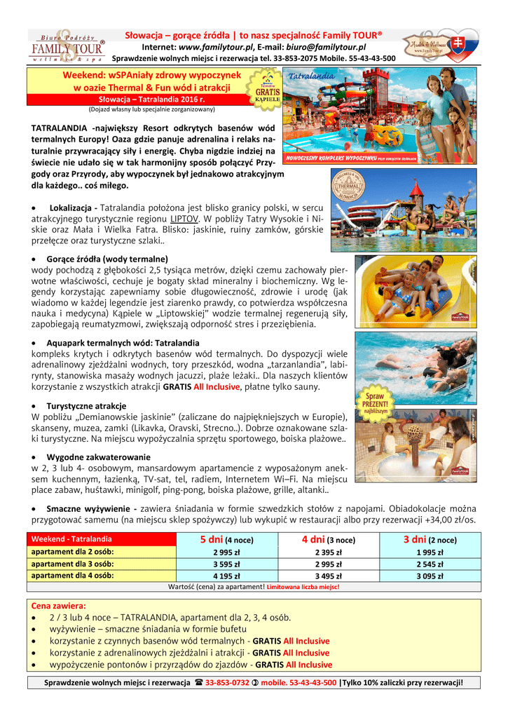 Słowacja – gorące źródła | to nasz specjalność Family TOUR® Internet: www.familytour.pl, E-mail: [email protected] Sprawdzenie wolnych miejsc i rezerwacja tel. 33-853-2075 Mobile. 55-43-43-500 Weekend: wSPAniały zdrowy wypoczynek w oazie Thermal & Fun wód i atrakcji Słowacja – Tatralandia 2016 r. (Dojazd własny lub specjalnie zorganizowany) TATRALANDIA -największy Resort odkrytych basenów wód termalnych Europy! Oaza gdzie panuje adrenalina i relaks naturalnie przywracający siły i energię. Chyba nigdzie indziej na świecie nie udało się w tak harmonijny sposób połączyć Przygody oraz Przyrody, aby wypoczynek był jednakowo atrakcyjnym dla każdego.. coś miłego. Lokalizacja - Tatralandia położona jest blisko granicy polski, w sercu atrakcyjnego turystycznie regionu LIPTOV. W pobliży Tatry Wysokie i Niskie oraz Mała i Wielka Fatra. Blisko: jaskinie, ruiny zamków, górskie przełęcze oraz turystyczne szlaki.. Gorące źródła (wody termalne) wody pochodzą z głębokości 2,5 tysiąca metrów, dzięki czemu zachowały pierwotne właściwości, cechuje je bogaty skład mineralny i biochemiczny. Wg legendy korzystając zapewniamy sobie długowieczność, zdrowie i urodę (jak wiadomo w każdej legendzie jest ziarenko prawdy, co potwierdza współczesna nauka i medycyna) Kąpiele w „Liptowskiej” wodzie termalnej regenerują siły, zapobiegają reumatyzmowi, zwiększają odporność stres i przeziębienia. Aquapark termalnych wód: Tatralandia kompleks krytych i odkrytych basenów wód termalnych. Do dyspozycji wiele adrenalinowy zjeżdżalni wodnych, tory przeszkód, wodna „tarzanlandia”, labirynty, stanowiska masaży wodnych jacuzzi, plaże leżaki.. Dla naszych klientów korzystanie z wszystkich atrakcji GRATIS All Inclusive, płatne tylko sauny. Turystyczne atrakcje W pobliżu „Demianowskie jaskinie” (zaliczane do najpiękniejszych w Europie), skanseny, muzea, zamki (Likavka, Oravski, Strecno..). Dobrze oznakowane szlaki turystyczne. Na miejscu wypożyczalnia sprzętu sportowego, boiska plażowe.. Wygodne zakwaterowanie w 2, 3 lub 4- osobowym, mansardowym apartamencie z wyposażonym aneksem kuchennym, łazienką, TV-sat, tel, radiem, Internetem Wi–Fi. Na miejscu place zabaw, huśtawki, minigolf, ping-pong, boiska plażowe, grille, altanki.. Smaczne wyżywienie - zawiera śniadania w formie szwedzkich stołów z napojami. Obiadokolacje można przygotować samemu (na miejscu sklep spożywczy) lub wykupić w restauracji albo przy rezerwacji +34,00 zł/os. Weekend - Tatralandia 5 dni (4 noce) 4 dni (3 noce) 3 dni (2 noce) apartament dla 2 osób: apartament dla 3 osób: apartament dla 4 osób: 2 995 zł 3 595 zł 4 195 zł 2 395 zł 2 995 zł 3 495 zł 1 995 zł 2 545 zł 3 095 zł Wartość (cena) za apartament! Limitowana liczba miejsc! Cena zawiera: 2 / 3 lub 4 noce – TATRALANDIA, apartament dla 2, 3, 4 osób. wyżywienie – smaczne śniadania w formie bufetu korzystanie z czynnych basenów wód termalnych - GRATIS All Inclusive korzystanie z adrenalinowych zjeżdżalni i atrakcji - GRATIS All Inclusive wypożyczenie pontonów i przyrządów do zjazdów - GRATIS All Inclusive Sprawdzenie wolnych miejsc i rezerwacja 33-853-0732 mobile. 53-43-43-500 |Tylko 10% zaliczki przy rezerwacji! 2 | S t r o n a wSPAniały, adrenalinowy wypoczynek w oazie wód termalnych.. TATRALANDIA długi weekend infrastruktura (leżaki, place zabaw, masaże wodne) - GRATIS All Inclusive możliwość uczestnictwa w animacjach i konkursach - GRATIS All Inclusive Internet WI-Fi w głównym budynku, recepcji oraz restauracji faktura VAT (polski rachunek) pozwalający skorzystać z funduszu socjalnego i odliczeń pakiety ubezpieczeń: standardowy turystyczny KL i NNW Signal Iduna oraz specjalny KL i NNW chorób przewlekłych do 10 000 € parkowanie samochodu – przy apartamencie (dozorowane) karty rabatowe: tatrzańska „GOPASS” oraz regionalny „LIPTOV” przed wypoczynkiem pomocne materiały informacyjno – turystyczne mapa trasy dojazdu i atrakcji turystycznych Cena nie obejmuje: opłaty klimatycznej płatnej na miejscu 1 Euro/dzień/os (powyżej 10 lat), kaucji 450 zł lub 100 euro płatnej na miejscu - oddawana przy wykwaterowaniu. Zniżki: dzieci: do lat 3 – gratis, do lat 12 na dostawce -50%. Klub Family Tour® -100 zł/apartament. Wczesna rezerwacja (>35 dni) -2%. Sprawdzenie wolnych miejsc i rezerwacja +48/ 33-853-2075 53-43-43-500 | Tylko 10% zaliczki by zarezerwować!