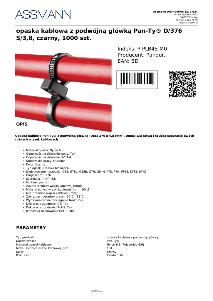 Assmann Distribution Sp. z o.o. ul. Szczecińska 17-21 54-517 Wrocław tel: 071 / 326 71 40 http://assmann.pl opaska kablowa z podwójną główką Pan-Ty® D/376 S/3,8, czarny, 1000 szt. Indeks: P-PLB4S-M0 Producent: Panduit EAN: BD B D OPIS Opaska kablowa Pan-Ty® z podwójną główką (DxS) 376 x 4,8 [mm]. Umożliwia łatwą i szybka separację dwóch różnych wiązek kablowych. Materiał opaski: Nylon 6.6 Odporność na działanie wody: Tak Odporność na działanie UV: Tak Środowisko pracy: Outdoor Kolor: Czarny Typ opaski: Opaska blokująca Dedytkowane narzędzia: GTS, GTSL, GS2B, GTH, GS4H, PTS, PTH, PPTS, STS2, STH2 Długość [m]: 376 Szerokość [mm]: 4,8 Grubość [mm]: Zakres średnicy wiązki kablowej [mm]: Maks. średnica wiązki kablowej [mm]: 104,1 Min. średnica wiązki kablowej [mm]: Zakres temperatury pracy: -60°C - 85°C Wytrzymałość na rozciąganie N/m²: 222 Deklaracja zgodności CE: Tak Deklaracja zgodności RoHS: Tak Jednostka opakowania [szt.]: 1000 PARAMETRY Typ produktu: Nazwa własna: Materiał opaski kablowej: Maks. średnica wiązki kablowej [mm]: Kolor: Producent: opaska kablowa z podwójną główką Pan-Ty® Nylon 6.6 (Polyamide 6.6) 104 czarny Panduit Ltd. Strona 1/1 Powered by TCPDF (www.tcpdf.org)