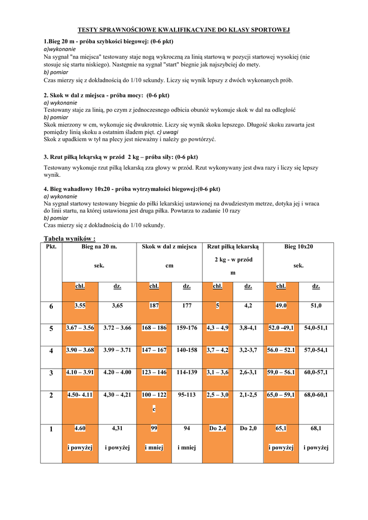 TESTY SPRAWNOŚCIOWE KWALIFIKACYJNE DO KLASY SPORTOWEJ 1.Bieg 20 m - próba szybkości biegowej: (0-6 pkt) a)wykonanie Na sygnał "na miejsca" testowany staje nogą wykroczną za linią startową w pozycji startowej wysokiej (nie stosuje się startu niskiego). Następnie na sygnał "start" biegnie jak najszybciej do mety. b) pomiar Czas mierzy się z dokładnością do 1/10 sekundy. Liczy się wynik lepszy z dwóch wykonanych prób. 2. Skok w dal z miejsca - próba mocy: (0-6 pkt) a) wykonanie Testowany staje za linią, po czym z jednoczesnego odbicia obunóż wykonuje skok w dal na odległość b) pomiar Skok mierzony w cm, wykonuje się dwukrotnie. Liczy się wynik skoku lepszego. Długość skoku zawarta jest pomiędzy linią skoku a ostatnim śladem pięt. c) uwagi Skok z upadkiem w tył na plecy jest nieważny i należy go powtórzyć. 3. Rzut piłką lekąrską w przód 2 kg – próba siły: (0-6 pkt) Testowany wykonuje rzut pilką lekarską zza głowy w przód. Rzut wykonywany jest dwa razy i liczy się lepszy wynik. 4. Bieg wahadłowy 10x20 - próba wytrzymałości biegowej:(0-6 pkt) a) wykonanie Na sygnał startowy testowany biegnie do piłki lekarskiej ustawionej na dwudziestym metrze, dotyka jej i wraca do linii startu, na której ustawiona jest druga piłka. Powtarza to zadanie 10 razy b) pomiar Czas mierzy się z dokładnością do 1/10 sekundy. Tabela wyników : Pkt. Bieg na 20 m. Skok w dal z miejsca sek. cm Rzut piłką lekarską Bieg 10x20 2 kg - w przód sek. m chł. dz. chł. dz. chł. dz. chł. dz. 6 3.55 3,65 187 177 5 4,2 49.0 51,0 5 3.67 – 3.56 3.72 – 3.66 168 – 186 159-176 4,3 – 4,9 3,8-4,1 52.0 -49,1 54,0-51,1 4 3.90 – 3.68 3.99 – 3.71 147 – 167 140-158 3,7 – 4,2 3,2-3,7 56.0 – 52.1 57,0-54,1 3 4.10 – 3.91 4.20 – 4.00 123 – 146 114-139 3,1 – 3,6 2,6-3,1 59,0 – 56.1 60,0-57,1 2 4.50- 4.11 4,30 – 4,21 100 – 122 95-113 2,5 – 3,0 2,1-2,5 65,0 – 59,1 68,0-60,1 Do 2,4 Do 2,0 65,1 68,1 i powyżej i powyżej c 1 4.60 4,31 99 94 i powyżej i powyżej i mniej i mniej