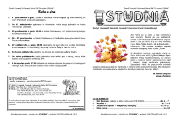 Zespół Promocji i Informacji Hufca ZHP Chrzanów „ŻURAW” Zespół Promocji i Informacji Hufca ZHP Chrzanów „ŻURAW” Echa z dna 1. 6 października o godz. 17.00 w Harcówce Hufca odbędzie się seans filmowy, na który Wszystkich serdecznie zapraszamy. 2. Do 17 października zg łaszamy w Komendzie Hufca swoje jednostki na Wartę Honorową 1 Listopada. 3. Zuchy! Harcerze! Harcerki! Harcerki i Harcerze Starsi! Instruktorzy! 19 października o godz. 19.00 w Szkole Podstawowej nr 5 rozpoczyna się kolejny Kurs Przewodnikowski. 4. 26 – 27 października w Szkole Podstawowej nr 5odbędzie się drugi weekend Kursu Przewodnikowskiego. 5. 27 października o godz. 10.00 spotykamy się pod głównym wejście Cmentarza Komunalnego od ul. Wodzińskiej, aby wziąć udział w Święcie Patrona Hufca. 6. Do końca października czekamy na artykuły do kolejnego wydania Studni. 7. Do końca października każda jednostka musi oddać spis z natury, rzeczy które posiada oraz uzupełnić ewidencję ZHP. 8. 8 listopada o godz. 17.00 odbędzie się kolejna odprawa drużynowych i funkcyjnych naszego Hufca oraz zostanie wydany nowy numer naszej gazetki. Zlot Hufca już za nami, a więc wrześniowa aura również. Zawitał do nas październik a wraz z nim deszczowa i pochmurna pogoda. Wielu z nas po cichu liczy na miłą odmianę i tzw. Złotą Polską Jesień. Jak jednak będzie – zobaczymy… Na poprawę zepsutych pogodą humorów oddajemy nowy numer „Studni”. W aktualnym numerze znajdziecie relacje ze Zlotu Hufca oraz XVII Ogólnopolskiego Rajdu Szlakiem Wieży Spadochronowej, na którym jeden z naszych patroli wędrowniczych zajął I miejsce, czego serdecznie gratulujemy. Zapraszamy także do przeczytania wywiadu przeprowadzonego przez dh. Agnieszkę w ramach próby przewodnikowskiej. Dla młodszych czytelników przygotowaliśmy krzyżówki o tematyce jesiennej. Owocnej lektury! W imieniu zespołu zakupo holiczka - gazetka programowo – metodyczna hufca ZHP Chrzanów ___________________________________________________________ WYDAWCA: Zespół Promocji i Informacji Hufca ZHP Chrzanów. Re daktor Naczelna: phm. Natalia Rzepka HO Re dakcja: hm. Michał Rzepka HR, hm. Elżbieta Michalak, pwd. Natalia Rzepka HO, pwd. Anna Gondek HO, sam. Beata Zygmunt, sam. Ewa Pająk, pwd. Aleksandra Nowak, ćwik Kamil Koniuch, phm. Piotr Słowik Za treść ogłoszeń redakcja nie odpowiada. W przypadku publikacji listów do redakcji, zastrzegamy sobie prawo do ich skracania, redagowania i nadawania własnych tytułów. Materiałów niezamówionych nie zwracamy. Nakład kontrolowany 50 egzemplarzy Gazetka programowo – metodyczna „STUDNIA” – wydanie 7/12 (37) październik 2012 CO W NUMERZE: Oko Żurawia –relacje ze Zlotu Hufca oraz XVII ORSWS………………………… str. 2 – 7 Wywiad z… ……………………………………………………………………………………… str. 7 – 8 Jesienna rozrywka – krzyżówki, labirynty ……………………………………… str. 9 -11 Echa z dna……………………………………………………………………………………………… str. 12 Gazetka programowo – metodyczna „STUDNIA” – wydanie 7/12 (37) październik 2012 Zespół Promocji i Informacji Hufca ZHP Chrzanów „ŻURAW” XVII Ogólnopolski Rajd Szlakiem Wieży Spadochronowej Zespół Promocji i Informacji Hufca ZHP Chrzanów „ŻURAW” LABIRYNT Pomóż mężczyźnie złapać kurę. W ty m ce lu musisz odna leźć drogę ukrytą w klonowy m liściu. „Chcę powiedzieć Wam o tamtej złej jesieni, Z której przyszedł ten harcerski leśny grób. Mieli myśli rozczochrane jak my dzisiaj, I mundury te dzisiejsze mieli też, Lecz stanęli w pogotowiu, gdy padł wystrzał I bronili tej najwyższej z wszystkich Wież…” Wędrownicy z 4 DW „Żywioły” po raz kolejny upamiętnili katowicki wrzesień ’39, biorąc udział w XVII Ogólnopolskim Rajdzie „Szlakiem Wieży Spadochronowej”. W tym roku w imprezie wzięły udział aż 3 patrole: 1) Żywioły „Dżu” – w składzie: hm. Michał Rzepka HR, phm. Natalia Rzepka HO, pwd. Mateusz Kubacki, odkr. Paweł Walesic. 2) Żywioły „Man” – w składzie: pwd. Michał Kowalski, pwd. Aleksandra Nowak, ćw. Kamil Koniuch, dh Daniel Orszulak. 3) Żywioły „Dżi” – w składzie: pwd. Dominik Orszulak HO, pwd. Sławomir Lament, dh. Dorota Honisz, dh Łukasz Binięda. Nazwy patroli związane były z fabułą tegorocznego rajdu– filmem i grą „Dżumandżi”. Do miasteczka zlotowego dotarliśmy przed 16:00. Po rozbiciu namiotów i zakwaterowaniu odbył się apel inauguracyjny u stóp Wieży Spadochronowej. Następnie wzięliśmy udział w zajęciach integracyjnych. Ich celem było wzajemne zapoznanie się z wędrownikami z innych hufców. Podzieleni na 8 grup wzięliśmy udział w zajęc iach sportowych, z czego największym uznan iem cieszyła się „baloniada”. Po kolacji odbyło się ognisko rajdowe, na którym wspólnie bawiliśmy się i śpiewaliśmy. Sobota rozpoczęła się dla naszych w ędrowników alarmem o godzinie 3:00... Zostaliśmy poinformowani, że Van Pelt rozpoczął polowanie, aby uciec przed nim należy podążać za światłem. Szybko wyskoczyliśmy ze śpiworów i biegiem udaliśmy się do Parku Kościuszki, gdzie zaprowadziły nas kolorowe św ietliki. Tam na każdy patrol czekała podpisana koperta, a w niej… plansza do gry, instrukcja, koperty alarmowe… Po powrocie do namiotu szybko zapadliśmy w sen, gdyż wiadomo, że trasa rajdowa jest długa i ciężka. Parę minut po 7:00 wstaliśmy i zaczęliśmy przygotowania do wymarszu – zapakowaliśmy niezbędny ekwipunek: prowiant, mapę Katowic, kompas, linijkę i kątomierz, ołówek, pieniądze, apteczkę, przebrania zwierzęce, aparat i znalezioną w nocy kopertę. Punktualnie o 8:00 ruszyliśmy na trasę, a o jej przebiegu decydował rzut kostką. - STRONA 2 – Gazetka programowo – metodyczna 