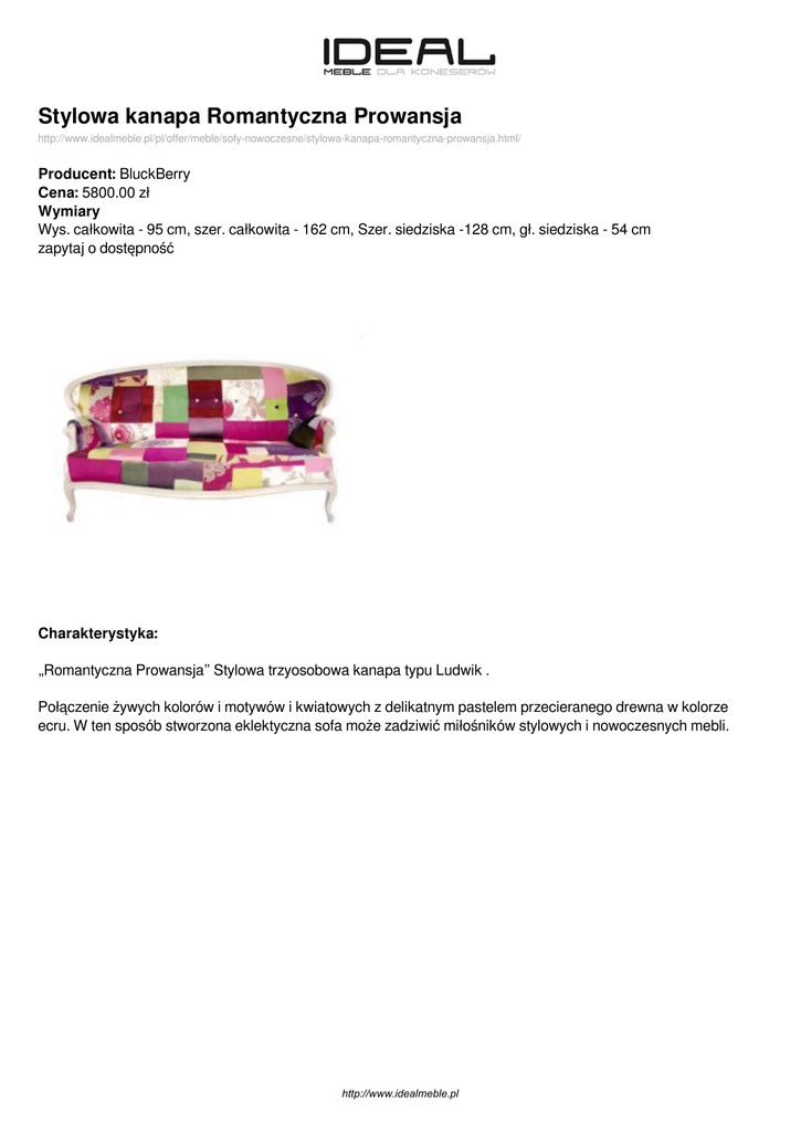 Stylowa kanapa Romantyczna Prowansja http://www.idealmeble.pl/pl/offer/meble/sofy-nowoczesne/stylowa-kanapa-romantyczna-prowansja.html/ Producent: BluckBerry Cena: 5800.00 zł Wymiary Wys. całkowita - 95 cm, szer. całkowita - 162 cm, Szer. siedziska -128 cm, gł. siedziska - 54 cm zapytaj o dostępność Charakterystyka: „Romantyczna Prowansja” Stylowa trzyosobowa kanapa typu Ludwik . Połączenie żywych kolorów i motywów i kwiatowych z delikatnym pastelem przecieranego drewna w kolorze ecru. W ten sposób stworzona eklektyczna sofa może zadziwić miłośników stylowych i nowoczesnych mebli. http://www.idealmeble.pl http://www.idealmeble.pl Zdjęcia produktu: http://www.idealmeble.pl Powered by TCPDF (www.tcpdf.org)