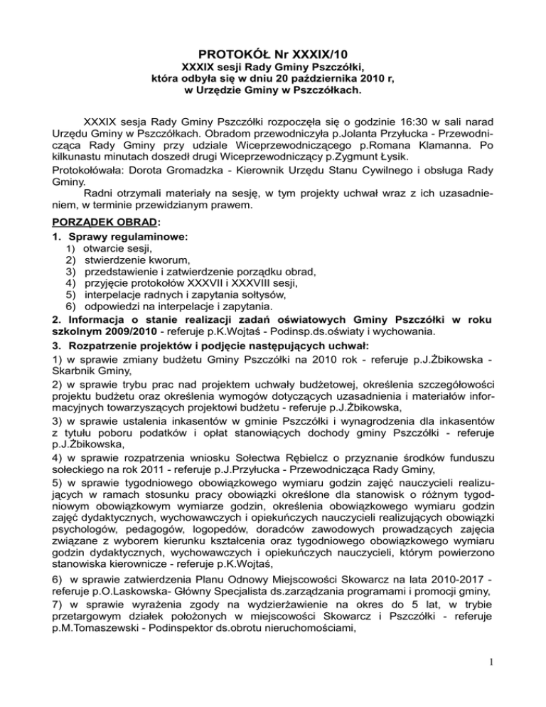 PROTOKÓŁ Nr XXXIX/10 XXXIX sesji Rady Gminy Pszczółki, która odbyła się w dniu 20 października 2010 r, w Urzędzie Gminy w Pszczółkach. XXXIX sesja Rady Gminy Pszczółki rozpoczęła się o godzinie 16:30 w sali narad Urzędu Gminy w Pszczółkach. Obradom przewodniczyła p.Jolanta Przyłucka - Przewodnicząca Rady Gminy przy udziale Wiceprzewodniczącego p.Romana Klamanna. Po kilkunastu minutach doszedł drugi Wiceprzewodniczący p.Zygmunt Łysik. Protokołówała: Dorota Gromadzka - Kierownik Urzędu Stanu Cywilnego i obsługa Rady Gminy. Radni otrzymali materiały na sesję, w tym projekty uchwał wraz z ich uzasadnieniem, w terminie przewidzianym prawem. PORZĄDEK OBRAD: 1. Sprawy regulaminowe: 1) otwarcie sesji, 2) stwierdzenie kworum, 3) przedstawienie i zatwierdzenie porządku obrad, 4) przyjęcie protokołów XXXVII i XXXVIII sesji, 5) interpelacje radnych i zapytania sołtysów, 6) odpowiedzi na interpelacje i zapytania. 2. Informacja o stanie realizacji zadań oświatowych Gminy Pszczółki w roku szkolnym 2009/2010 - referuje p.K.Wojtaś - Podinsp.ds.oświaty i wychowania. 3. Rozpatrzenie projektów i podjęcie następujących uchwał: 1) w sprawie zmiany budżetu Gminy Pszczółki na 2010 rok - referuje p.J.Żbikowska Skarbnik Gminy, 2) w sprawie trybu prac nad projektem uchwały budżetowej, określenia szczegółowości projektu budżetu oraz określenia wymogów dotyczących uzasadnienia i materiałów informacyjnych towarzyszących projektowi budżetu - referuje p.J.Żbikowska, 3) w sprawie ustalenia inkasentów w gminie Pszczółki i wynagrodzenia dla inkasentów z tytułu poboru podatków i opłat stanowiących dochody gminy Pszczółki - referuje p.J.Żbikowska, 4) w sprawie rozpatrzenia wniosku Sołectwa Rębielcz o przyznanie środków funduszu sołeckiego na rok 2011 - referuje p.J.Przyłucka - Przewodnicząca Rady Gminy, 5) w sprawie tygodniowego obowiązkowego wymiaru godzin zajęć nauczycieli realizujących w ramach stosunku pracy obowiązki określone dla stanowisk o różnym tygodniowym obowiązkowym wymiarze godzin, określenia obowiązkowego wymiaru godzin zajęć dydaktycznych, wychowawczych i opiekuńczych nauczycieli realizujących obowiązki psychologów, pedagogów, logopedów, doradców zawodowych prowadzących zajęcia związane z wyborem kierunku kształcenia oraz tygodniowego obowiązkowego wymiaru godzin dydaktycznych, wychowawczych i opiekuńczych nauczycieli, którym powierzono stanowiska kierownicze - referuje p.K.Wojtaś, 6) w sprawie zatwierdzenia Planu Odnowy Miejscowości Skowarcz na lata 2010-2017 referuje p.O.Laskowska- Główny Specjalista ds.zarządzania programami i promocji gminy, 7) w sprawie wyrażenia zgody na wydzierżawienie na okres do 5 lat, w trybie przetargowym działek położonych w miejscowości Skowarcz i Pszczółki - referuje p.M.Tomaszewski - Podinspektor ds.obrotu nieruchomościami, 1 8) w sprawie sprzedaży w formie bezprzetargowej części niezabudowanej działki nr 76/2, położonej w miejscowości Pszczółki, z przeznaczeniem na poprawienie warunków zagospodarowania nieruchomości przyległej - referuje p.M.Tomaszewski, 9) w sprawie sprzedaży w formie przetargowej części niezabudowanej działki nr 76/2, położonej w miejscowości Pszczółki - referuje M.Tomaszewski, 10) w sprawie nadania nazw ulicom w miejscowości Skowarcz (drogi prywatne stanowiące działki nr 238/8 i nr 151/16) - referuje p.B.Drzewiecka - Inspektor ds.geodezji, 11) w sprawie nadania nazw ulicom w miejscowości Pszczółki (drogi prywatne stanowiące działki nr 318/13 i nr 280/8) - referuje p.B.Drzewiecka. 4. Informacja Wójta Gminy o jego pracach w okresie między sesjami. 5. Informacja Przewodniczącej Rady Gminy o działaniach podejmowanych w okresie między sesjami oraz o korespondencji wpływającej do Kancelarii Rady Gminy. 6. Wolne wnioski i informacje. 7. Zamknięcie obrad sesji Rady Gminy. Ad 1. Sprawy regulaminowe: 1) otwarcie sesji XXXIX sesję Rady Gminy Pszczółki otworzyła Przewodnicząca Rady słowami: „Otwieram XXXIX sesję Rady Gminy Pszczółki”. Powitała radnych, Wójta Gminy, Skarbnika, sołtysów oraz pracowników Urzędu Gminy. 2) stwierdzenie kworum Na podstawie listy obecności Przewodnicząca Rady Gminy stwierdziła obecność 13 radnych (dwóch nieobecnych), tym samym sesja jest prawomocna i zdolna do podejmowania uchwał. Lista obecności w załączeniu. W sesji uczestniczyło także 7 sołtysów - lista obecności w załączeniu. 3) przedstawienie i zatwierdzenie porządku obrad Przewodnicząca Rady Gminy J.Przyłucka powiedziała, że porządek obrad znajduje się w materiałach na sesję, które otrzymali wszyscy radni. Zgłosiła poprawki polegające na tym, że w pkt. 3. „Rozpatrzenie projektów i podjęcie następujących uchwał” zmieniają się tytuły uchwał poz. nr 10 i 11, otrzymując brzmienie: 10) w sprawie nadania nazw ulicom w miejscowości Skowarcz (drogi prywatne w osiedlu mieszkaniowym przy ul.Kwiatowej), 11) w sprawie nadania nazw ulicom w miejscowości Pszczółki (drogi prywatne stanowiące działki nr 318/13 i nr 280/8). Punkt 6. otrzymuje brzmienie: 6. Informacja o analizie oświadczeń majątkowych złożonych za 2009 r. - przedstawiają p.Hanna Brejwo - Wójt Gminy i p.J.Przyłucka - Przewodnicząca Rady Gminy. Dotychczasowe punkty 6 i 7 przyjmują odpowiednio numerację 7 i 8. Przewodnicząca zapytała, czy do zaproponowanego porządku obrad radni wnoszą jakieś uwagi? Ponieważ żadnych nie zgłoszono, Przewodnicząca Rady zarządziła głosowanie. Za jego przyjęciem - 13 radnych, przeciw i wstrzymujących się nie było. Porządek obrad został przyjęty jednogłośnie. 4) przyjęcie protokołów XXXVII i XXXVIII sesji Przewodnicząca Rady Gminy J.Przyłucka powiedziała, że protokoły XXXVII i XXXVIII sesji Rady Gminy były wyłożone do wglądu i radni nie wnieśli do nich żadnych poprawek. W związku z tym protokoły nr XXXVII/10 i XXXVIII/10 zostały za