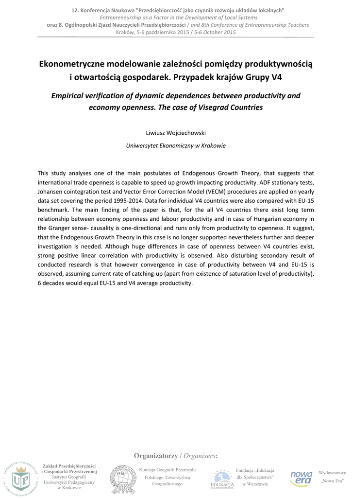12. Konferencja Naukowa "Przedsiębiorczość jako czynnik rozwoju układów lokalnych" Entrepreneurship as a Factor in the Development of Local Systems oraz 8. Ogólnopolski Zjazd Nauczycieli Przedsiębiorczości / and 8th Conference of Entrepreneurship Teachers Kraków, 5-6 października 2015 / 5-6 October 2015 Ekonometryczne modelowanie zależności pomiędzy produktywnością i otwartością gospodarek. Przypadek krajów Grupy V4 Empirical verification of dynamic dependences between productivity and economy openness. The case of Visegrad Countries Liwiusz Wojciechowski Uniwersytet Ekonomiczny w Krakowie This study analyses one of the main postulates of Endogenous Growth Theory, that suggests that international trade openness is capable to speed up growth impacting productivity. ADF stationary tests, Johansen cointegration test and Vector Error Correction Model (VECM) procedures are applied on yearly data set covering the period 1995-2014. Data for individual V4 countries were also compared with EU-15 benchmark. The main finding of the paper is that, for the all V4 countries there exist long term relationship between economy openness and labour productivity and in case of Hungarian economy in the Granger sense- causality is one-directional and runs only from productivity to openness. It suggest, that the Endogenous Growth Theory in this case is no longer supported nevertheless further and deeper investigation is needed. Although huge differences in case of openness between V4 countries exist, strong positive linear correlation with productivity is observed. Also disturbing secondary result of conducted research is that however convergence in case of productivity between V4 and EU-15 is observed, assuming current rate of catching-up (apart from existence of saturation level of productivity), 6 decades would equal EU-15 and V4 average productivity. Organizatorzy / Organisers: Zakład Przedsiębiorczości i Gospodarki Przestrzennej Instytut Geografii Uniwersytet Pedagogiczny w Krakowie Komisja Geografii Przemysłu Polskiego Towarzystwa Geograficznego Fundacja „Edukacja dla Społeczeństwa” w Warszawie Wydawnictwo „Nowa Era”