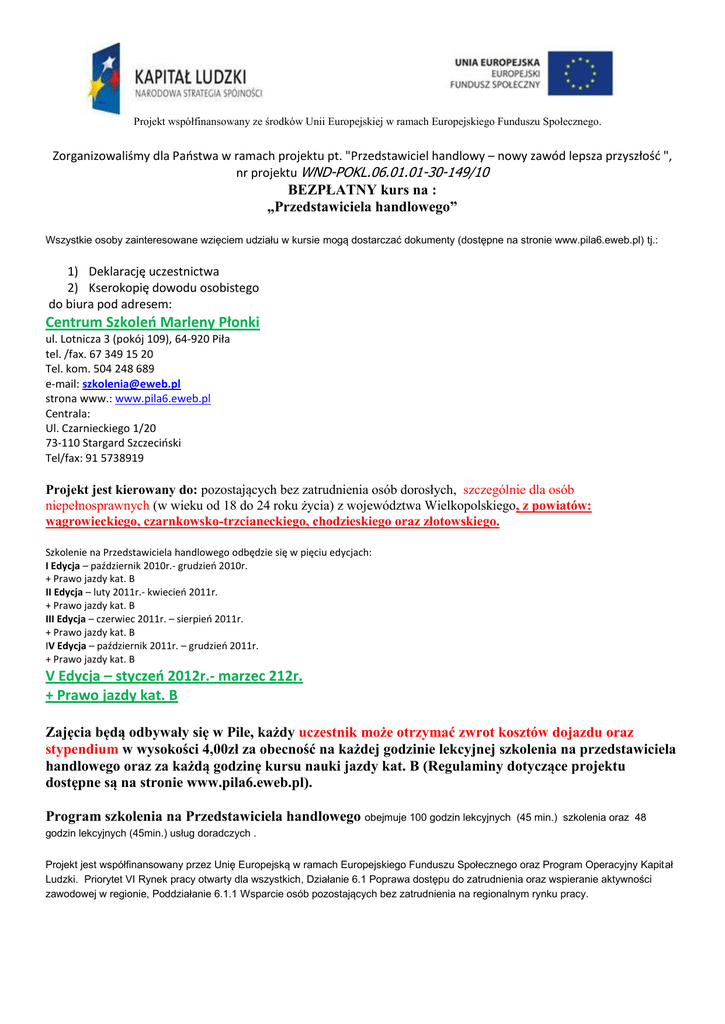 Projekt współfinansowany ze środków Unii Europejskiej w ramach Europejskiego Funduszu Społecznego. Zorganizowaliśmy dla Paostwa w ramach projektu pt. "Przedstawiciel handlowy – nowy zawód lepsza przyszłośd ", nr projektu WND-POKL.06.01.01-30-149/10 BEZPŁATNY kurs na : „Przedstawiciela handlowego” Wszystkie osoby zainteresowane wzięciem udziału w kursie mogą dostarczać dokumenty (dostępne na stronie www.pila6.eweb.pl) tj.: 1) Deklarację uczestnictwa 2) Kserokopię dowodu osobistego do biura pod adresem: Centrum Szkoleo Marleny Płonki ul. Lotnicza 3 (pokój 109), 64-920 Piła tel. /fax. 67 349 15 20 Tel. kom. 504 248 689 e-mail: [email protected] strona www.: www.pila6.eweb.pl Centrala: Ul. Czarnieckiego 1/20 73-110 Stargard Szczecioski Tel/fax: 91 5738919 Projekt jest kierowany do: pozostających bez zatrudnienia osób dorosłych, szczególnie dla osób niepełnosprawnych (w wieku od 18 do 24 roku życia) z województwa Wielkopolskiego, z powiatów: wągrowieckiego, czarnkowsko-trzcianeckiego, chodzieskiego oraz złotowskiego. Szkolenie na Przedstawiciela handlowego odbędzie się w pięciu edycjach: I Edycja – październik 2010r.- grudzieo 2010r. + Prawo jazdy kat. B II Edycja – luty 2011r.- kwiecieo 2011r. + Prawo jazdy kat. B III Edycja – czerwiec 2011r. – sierpieo 2011r. + Prawo jazdy kat. B IV Edycja – październik 2011r. – grudzieo 2011r. + Prawo jazdy kat. B V Edycja – styczeo 2012r.- marzec 212r. + Prawo jazdy kat. B Zajęcia będą odbywały się w Pile, każdy uczestnik może otrzymać zwrot kosztów dojazdu oraz stypendium w wysokości 4,00zł za obecność na każdej godzinie lekcyjnej szkolenia na przedstawiciela handlowego oraz za każdą godzinę kursu nauki jazdy kat. B (Regulaminy dotyczące projektu dostępne są na stronie www.pila6.eweb.pl). Program szkolenia na Przedstawiciela handlowego obejmuje 100 godzin lekcyjnych (45 min.) szkolenia oraz 48 godzin lekcyjnych (45min.) usług doradczych . Projekt jest współfinansowany przez Unię Europejską w ramach Europejskiego Funduszu Społecznego oraz Program Operacyjny Kapitał Ludzki. Priorytet VI Rynek pracy otwarty dla wszystkich, Działanie 6.1 Poprawa dostępu do zatrudnienia oraz wspieranie aktywności zawodowej w regionie, Poddziałanie 6.1.1 Wsparcie osób pozostających bez zatrudnienia na regionalnym rynku pracy.