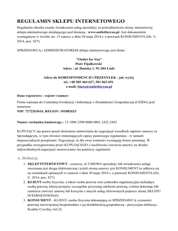 REGULAMIN SKLEPU INTERNETOWEGO Regulamin określa zasady świadczenia usług sprzedaży za pośrednictwem strony internetowej sklepu internetowego działającego pod domeną : www.outletforyou.pl. Jest dokumentem wymaganym w świetle art. 13 ustawy z dnia 30 maja 2014 r. o prawach KONSUMENTA (Dz. U. 2014, poz. 827). SPRZEDAWCĄ i ADMINISTRATOREM sklepu internetowego jest firma : "Outlet for You" Piotr Fijałkowski Adres : ul. Duńska 1, 91-204 Łódź Adres do KORESPONDENCJI i PRZESYŁEK : jak wyżej tel. +48 505 464 627, 501 063 691 e-mail: [email protected] Dane rejestrowe - rejestr i numer: Firma wpisana do Centralnej Ewidencji i Informacji o Działalności Gospodarczej (CEIDG) pod numerem NIP: 7272263616, REGON: 101082623 Numer rachunku bankowego : 12 1090 2590 0000 0001 2422 2443 KUPUJĄCY ma prawo przed złożeniem zamówienia do negocjacji wszelkich zapisów umowy ze Sprzedającym, w tym również zmieniających zapisy poniższego regulaminu - w ramach dopuszczalnych przepisami. Negocjacje, te dla swej ważności wymagają formy pisemnej. W przypadku zrezygnowania przez KUPUJĄCEGO z możliwości zawarcia umowy na drodze indywidualnych negocjacji zastosowanie ma poniższy regulamin. A. Definicje 1. SKLEP INTERNETOWY - oznacza, że UMOWA sprzedaży lub świadczenia usługi zawierana jest drogą elektroniczną i jeżeli stroną umowy jest KONSUMENT to odbywa się na warunkach opisanych w ustawie z dnia 30 maja 2014 r. o prawach KONSUMENTA (Dz. U. 2014, poz. 827). 2. KLIENT osoba fizyczna, a także osoba prawna oraz jednostka organizacyjna niebędąca osobą prawną, której przepisy szczególne przyznają zdolność prawną, a która dokonuje lub zamierza zawrzeć umowę lub korzysta z innych usług oferowanych poprzez stronę SKLEPU INTERNETOWEGO. 3. KONSUMENT - KLIENT, osoba fizyczna dokonującą ze SPRZEDAWCĄ czynności prawnej niezwiązanej bezpośrednio z jej działalnością gospodarczą - precyzyjna definicja Kodeks Cywilny Art.22. 4. PRODUKT - rzecz oferowana do sprzedaży lub usługa oferowana w SKLEPIE INTERNETOWYM. 5. REGULAMIN - niniejszy Regulamin SKLEPU INTERNETOWEGO. 6. UMOWA SPRZEDAŻY - umowa sprzedaży PRODUKTU zawierana na odległość za pośrednictwem SKLEPU INTERNETOWEGO. 7. ZAMÓWIENIE - oświadczenie złożone elektronicznie lub telefonicznie o chęci zawarcia umowy (zamówienia produktu lub usługi). 8. NEWSLETTER - usługa świadczona drogą elektroniczną przez SPRZEDAWCĘ, polegająca na rozsyłaniu zainteresowanym informacji handlowych i reklamowych na podany przez zainteresowanego adres e-mail. B. Postanowienia ogólne. 1. Zakres działalności - sprzedaż wysyłkowa z wykorzystaniem strony internetowej artykułów różnych. 2. SPRZEDAWCA stosuje się do Kodeksu Dobrych Praktyk w rozumieniu ustawy z dnia 23.08.2007 o przeciwdziałaniu nieuczciwym praktykom rynkowym (treść dostępna pod adresem www.uokik.gov.pl/download.php?id=546) 3. KLIENT - zobowiązany jest do wprowadzania danych do systemu zgodnych ze stanem faktycznym, zgodnych z prawem i dobrymi obyczajami. Udostępniane dane nie mogą naruszać dóbr osobistych ani praw własności osób trzecich. 4. SPRZEDAWCA jest płatnikiem VAT i do każdej transakcji sprzedaży produktu wystawia dokument sprzedaży - paragon lub fakturę. 5. Informacje handlowe - cenniki, opisy, reklamy i inne informacje o Produktach znajdujące się na stronie WWW SPRZEDAWCY, stanowią zaproszenie do zawarcia umowy w rozumieniu art. 71 Kodeksu Cywilnego. C. Zamówienie. 1. SKLEP INTERNETOWY realizuje zamówienia z wysyłką do Polski i innych krajów UE. Przy zamówieniach z zagranicy - warunki wysyłki - w szczególności koszty i czas dostawy uzgadniane są indywidualnie . 2. Przed złożeniem zamówienia KLIENT musi się zapoznać z niniejszym REGULAMINEM. Fakt zapoznania się i akceptacji wszystkich postanowień niniejszego regulaminu potwierdza jawnie przy rejestracji w systemie oraz przed ostatecznym potwierdzeniem zamówienia. Formularz zamówienia nie zostanie zaakceptowany bez takiego potwierdzenia. 3. Zamówienie drogą elektroniczną można składać 24 godz. na dobę 7 dni w tygodniu. 4. Zamówienie telefoniczne można składać na numer telefonu podany w zakładce KONTAKT. W przypadku umowy zawartej na odległość poprzez telefon SPRZEDAWCA potwierdza treść proponowanej umowy wysyłając ją do KLIENTA utrwaloną na papierze lub innym trwałym nośniku. KONSUMENT dla ważności umowy składa oświadczenie o przyjęciu warunków i zawarciu umowy - jest ono skuteczne jeżeli zostało utrwalone na papierze lub innym trwałym nośniku po otrzymaniu potwierdzenia od SPRZEDAWCY. 5. Realizacja zamówienia (przygotowanie i wysyłka PRODUKTÓW) przez SPRZEDAWCĘ następuje : • a) po potwierdzeniu zamówienia - jeżeli wybrano płatność przy odbiorze; • b) po otrzymaniu wpłaty na konto – jeżeli wybrano przedpłatę. 6. Termin realizacji zamówienia w przypadku produktów znajdujących się w magazynie - nie dłużej niż 3 dni robocze, licząc od daty ustalonej jak w punkcie poprzednim. W większości przypadków zamówienia realizujemy w ciągu 24 godzin. W przypadku produktów oferowanych na zamówienie termin zostanie określony przy składaniu zamówienia. 7. Jeżeli KLIENTEM jest KONSUMENT, SPRZEDAWCA obowiązany jest niezwłocznie wydać rzecz KLIENTOWI, nie później niż trzydzieści dni od dnia zawarcia umowy, chyba że umowa stanowi inaczej. W razie opóźnienia SPRZEDAWCY KONSUMENT może wyznaczyć dodatkowy termin do wydania rzeczy, a po jego bezskutecznym upływie może od umowy odstąpić 8. Jeżeli SPRZEDAWCA oświadczy, że świadczenia tego nie spełni, druga strona może odstąpić od umowy bez wyznaczenia terminu dodatkowego. D. Ceny. 1. Podane w ofercie sklepu ceny produktów są cenami w walucie polskiej i są cenami brutto (zawierają wymagane prawem podatki w tym podatek VAT). 2. Podane ceny są cenami detalicznymi i nie uwzględniają rabatów i bonifikat. Rabaty i bonifikaty mog