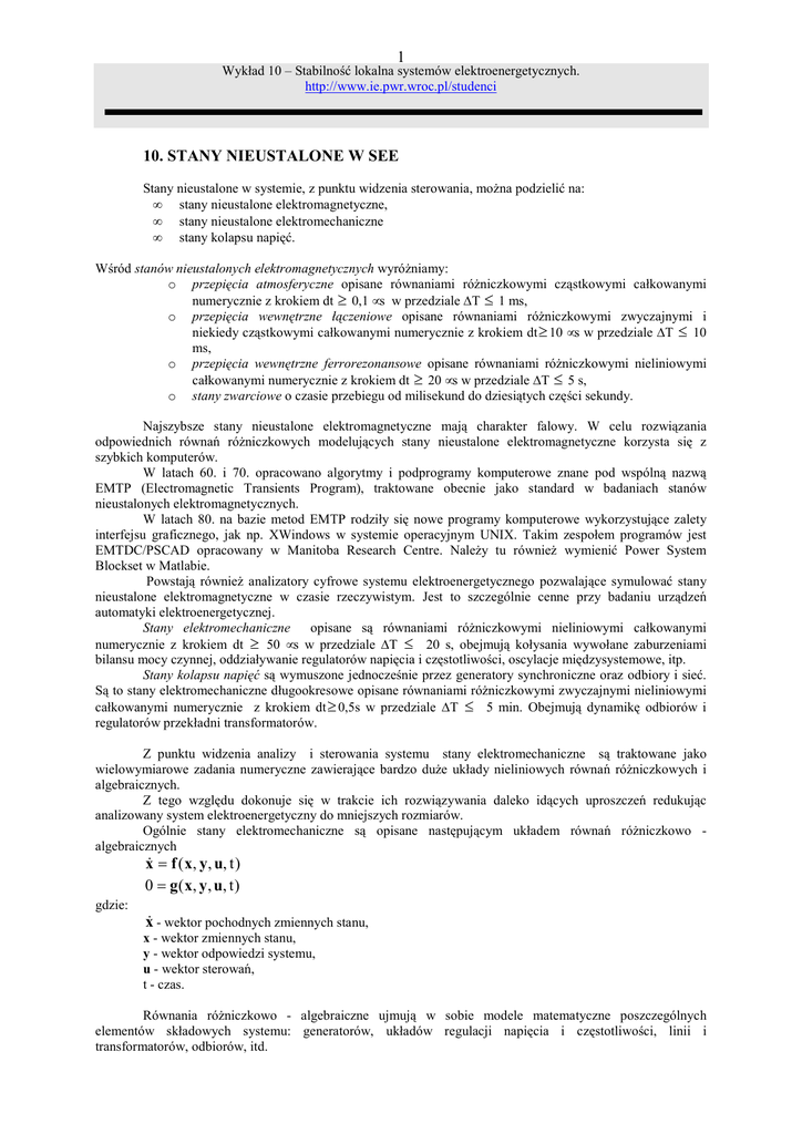 1 Wyk ad 10 – Stabilno lokalna systemów elektroenergetycznych. http://www.ie.pwr.wroc.pl/studenci 10. STANY NIEUSTALONE W SEE Stany nieustalone w systemie, z punktu widzenia sterowania, mo$na podzieli na: • stany nieustalone elektromagnetyczne, • stany nieustalone elektromechaniczne • stany kolapsu napi% . W ród stanów nieustalonych elektromagnetycznych wyró$niamy: o przepi cia atmosferyczne opisane równaniami ró$niczkowymi cz&stkowymi ca kowanymi numerycznie z krokiem dt 0,1 µs w przedziale T 1 ms, o przepi cia wewn trzne czeniowe opisane równaniami ró$niczkowymi zwyczajnymi i niekiedy cz&stkowymi ca kowanymi numerycznie z krokiem dt 10 µs w przedziale T 10 ms, o przepi cia wewn trzne ferrorezonansowe opisane równaniami ró$niczkowymi nieliniowymi ca kowanymi numerycznie z krokiem dt 20 µs w przedziale T 5 s, o stany zwarciowe o czasie przebiegu od milisekund do dziesi&tych cz% ci sekundy. Najszybsze stany nieustalone elektromagnetyczne maj& charakter falowy. W celu rozwi&zania odpowiednich równa- ró$niczkowych modeluj&cych stany nieustalone elektromagnetyczne korzysta si% z szybkich komputerów. W latach 60. i 70. opracowano algorytmy i podprogramy komputerowe znane pod wspóln& nazw& EMTP (Electromagnetic Transients Program), traktowane obecnie jako standard w badaniach stanów nieustalonych elektromagnetycznych. W latach 80. na bazie metod EMTP rodzi y si% nowe programy komputerowe wykorzystuj&ce zalety interfejsu graficznego, jak np. XWindows w systemie operacyjnym UNIX. Takim zespo em programów jest EMTDC/PSCAD opracowany w Manitoba Research Centre. Nale$y tu równie$ wymieni Power System Blockset w Matlabie. Powstaj& równie$ analizatory cyfrowe systemu elektroenergetycznego pozwalaj&ce symulowa stany nieustalone elektromagnetyczne w czasie rzeczywistym. Jest to szczególnie cenne przy badaniu urz&dzeautomatyki elektroenergetycznej. Stany elektromechaniczne opisane s& równaniami ró$niczkowymi nieliniowymi ca kowanymi 50 µs w przedziale T 20 s, obejmuj& ko ysania wywo ane zaburzeniami numerycznie z krokiem dt bilansu mocy czynnej, oddzia ywanie regulatorów napi%cia i cz%stotliwo ci, oscylacje mi%dzysystemowe, itp. Stany kolapsu napi s& wymuszone jednocze nie przez generatory synchroniczne oraz odbiory i sie . S& to stany elektromechaniczne d ugookresowe opisane równaniami ró$niczkowymi zwyczajnymi nieliniowymi 5 min. Obejmuj& dynamik% odbiorów i ca kowanymi numerycznie z krokiem dt 0,5s w przedziale T regulatorów przek adni transformatorów. Z punktu widzenia analizy i sterowania systemu stany elektromechaniczne s& traktowane jako wielowymiarowe zadania numeryczne zawieraj&ce bardzo du$e uk ady nieliniowych równa- ró$niczkowych i algebraicznych. Z tego wzgl%du dokonuje si% w trakcie ich rozwi&zywania daleko id&cych uproszcze- redukuj&c analizowany system elektroenergetyczny do mniejszych rozmiarów. Ogólnie stany elektromechaniczne s& opisane nast%puj&cym uk adem równa- ró$niczkowo algebraicznych x& = f ( x, y , u, t ) 0 = g ( x , y , u, t ) gdzie: x& - wektor pochodnych zmiennych stanu, x - wektor zmiennych stanu, y - wektor odpowiedzi systemu, u - wektor sterowa-, t - czas. Równania ró$niczkowo - algebraiczne ujmuj& w sobie modele matematyczne poszczególnych elementów sk adowych systemu: generatorów, uk adów regulacji napi%cia i cz%stotliwo ci, linii i transformatorów, odbiorów, itd. 2 Wyk ad 10 – Stabilno lokalna systemów elektroenergetycznych. http://www.ie.pwr.wroc.pl/studenci Analizuj&c stany nieustalone elektromechaniczne systemu przyjmuje si% najcz% ciej, $e analizowany uk ad jest swobodny, tzn. dzia a bez sterowa- u = 0. Sterowanie uwzgl%dnia si% natomiast na etapie optymalizacji uk adów regulacji. Stany nieustalone s& poprzedzone stanami ustalonymi. Stan ustalony systemu jest w tym przypadku to$samy z rozwi&zaniem uk adu równa- dla warunku, kiedy zmienne stanu nie ulegaj& zmianie w czasie, tzn. x& =0. 10.1. Równania ruchu wirnika generatora synchronicznego K&t obrotu w ruchu obrotowym jest odpowiednikiem drogi w ruchu prostoliniowym. Jednemu pe nemu obrotowi odpowiada droga 2 radianów geometrycznych lub 360o geometrycznych. Na obwodzie wirnika, odpowiadaj&cym 2 radianów geometrycznych, mo$e by rozmieszczone p - par biegunów, zatem mi%dzy k tem geometrycznym i k tem elektrycznym zachodzi zwi&zek [radianów elektrycznych] = [radianów geometrycznych] p K&t wirnika zmienia si% ci&gle z czasem, dlatego wygodnie jest go mierzy w odniesieniu do osi wiruj&cej z pr%dko ci& znamionow& = N Pr dko znamionowa zwana jest równie$ pr dko ci synchroniczn s = N K&t wirnika mo$na w ka$dej chwili wyznaczy z zale$no ci = gdzie: s t - k&t wirnika, odpowiadaj&cy pr%dko ci wirowania danego wirnika, - k&t wirnika odniesiony do osi synchronicznej, k&towa synchroniczna odpowiadaj&ca znamionowej cz%stotliwo ci pr&du w s = 2 fN - pr%dko systemie f = fN. B d f = t Q A D q C Rys. 10.1. Schemat ideowy generatora synchronicznego Przy wirowaniu wirnika k&t jest funkcj& czasu i pr%dko ci k&towej wirnika . Przy sta ej pr%dko ci katowej wirniki wykonuje jeden obrót w czasie jednego okresu T. Poniewa$ jeden obrót przy jednej parze biegunów jest równowa$ny w mierz ukowej katowi 2 , otrzymuje si% nast%puj&ca zale$no pT = 2 albo f = p pn = 2 60 gdzie p oznacza liczb% par biegunów, a n - liczb% obrotów na minut%. 3 Wyk ad 10 – Stabilno lokalna systemów elektroenergetycznych. http://www.ie.pwr.wroc.pl/studenci Miedzy pr%dko ci& k&tow& i obrotami maszyny synchronicznej istnieje zale$no pn 60 =2 W wi%kszo ci systemów elektroenergetycznych cz%stotliwo pr&du wnosi - podobnie jak w Polsce - 50 Hz. W niektórych jednak systemach cz%stotliwo jest wi%ksza lub mniejsza, np. w USA fN=60 Hz. Obliczaj&c pochodn& k&ta wirnika wzgl%dem czasu otrzymuje si% wzór na przyrost pr dko ci k towej wirnika &=d =d dt dt s = s = A zatem pr%dko k&towa danego generatora jest sum& pr%dko ci k&towej osi synchronicznej i odpowiedniego przyrostu pr%dko ci k&towej wirnika tego gen