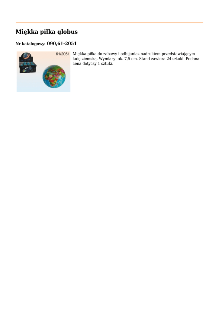 Miękka piłka globus Nr katalogowy: 090,61-2051 Miękka piłka do zabawy i odbijaniaz nadrukiem przedstawiającym kulę ziemską. Wymiary: ok. 7,5 cm. Stand zawiera 24 sztuki. Podana cena dotyczy 1 sztuki.
