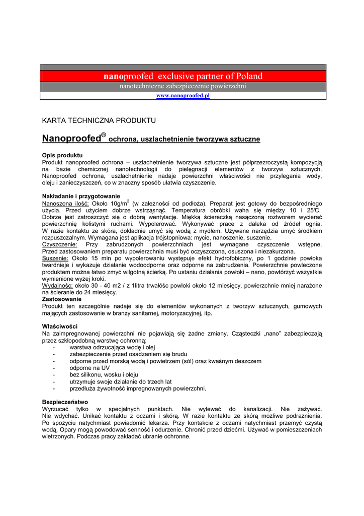 nanoproofed exclusive partner of Poland nanotechniczne zabezpieczenie powierzchni www.nanoproofed.pl KARTA TECHNICZNA PRODUKTU Nanoproofed® ochrona, uszlachetnienie tworzywa sztuczne Opis produktu Produkt nanoproofed ochrona – uszlachetnienie tworzywa sztuczne jest półprzezroczystą kompozycją na bazie chemicznej nanotechnologii do pielęgnacji elementów z tworzyw sztucznych. Nanoproofed ochrona, uszlachetnienie nadaje powierzchni właściwości nie przylegania wody, oleju i zanieczyszczeń, co w znaczny sposób ułatwia czyszczenie. Nakładanie i przygotowanie 2 Nanoszona ilość: Około 10g/m (w zależności od podłoża). Preparat jest gotowy do bezpośredniego użycia. Przed użyciem dobrze wstrząsnąć. Temperatura obróbki waha się między 10 i 25°C. Dobrze jest zatroszczyć się o dobrą wentylację. Miękką ściereczką nasączoną roztworem wycierać powierzchnię kolistymi ruchami. Wypolerować. Wykonywać prace z daleka od źródeł ognia. W razie kontaktu ze skóra, dokładnie umyć się wodą z mydłem. Używane narzędzia umyć środkiem rozpuszczalnym. Wymagana jest aplikacja trójstopniowa: mycie, nanoszenie, suszenie. Czyszczenie: Przy zabrudzonych powierzchniach jest wymagane czyszczenie wstępne. Przed zastosowaniem preparatu powierzchnia musi być oczyszczona, osuszona i niezakurzona. Suszenie: Około 15 min po wypolerowaniu występuje efekt hydrofobiczny, po 1 godzinie powłoka twardnieje i wykazuje działanie wodoodporne oraz odporne na zabrudzenia. Powierzchnie powleczone produktem można łatwo zmyć wilgotną ścierką. Po ustaniu działania powłoki – nano, powtórzyć wszystkie wymienione wyżej kroki. Wydajnośc: około 30 - 40 m2 / z 1litra trwałóśc powłoki około 12 miesięcy, powierzchnie mniej narażone na ścieranie do 24 miesięcy. Zastosowanie Produkt ten szczególnie nadaje się do elementów wykonanych z tworzyw sztucznych, gumowych mających zastosowanie w branży sanitarnej, motoryzacyjnej, itp. Właściwości Na zaimpregnowanej powierzchni nie pojawiają się żadne zmiany. Cząsteczki „nano” zabezpieczają przez szkłopodobną warstwę ochronną: warstwa odrzucająca wodę i olej zabezpieczenie przed osadzaniem się brudu odporne przed morską wodą i powietrzem (sól) oraz kwaśnym deszczem odporne na UV bez silikonu, wosku i oleju utrzymuje swoje działanie do trzech lat przedłuża żywotność impregnowanych powierzchni. Bezpieczeństwo Wyrzucać tylko w specjalnych punktach. Nie wylewać do kanalizacji. Nie zażywać. Nie wdychać. Unikać kontaktu z oczami i skórą. W razie kontaktu ze skórą możliwe podrażnienia. Po spożyciu natychmiast powiadomić lekarza. Przy kontakcie z oczami natychmiast przemyć czystą wodą. Opary mogą powodować senność i odurzenie. Chronić przed dziećmi. Używać w pomieszczeniach wietrzonych. Podczas pracy zakładać ubranie ochronne. Przechowywanie Przechowywać w suchych i chłodnych miejscach. Chronić przed mrozem. Przechowywać z dala od źródeł ognia. Przechowywać szczelnie zamknięte. Nanoproofed exclusive partner of Poland 26-130 Suchedniów – Mostki 109D Tel. kontakt. 0 517 779 738