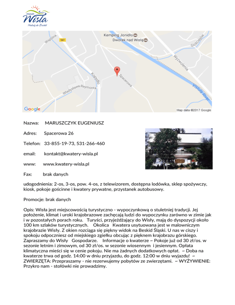 Nazwa: MARUSZCZYK EUGENIUSZ Adres: Spacerowa 26 Telefon: 33-855-19-73, 531-266-460 email: [email protected] www: www.kwatery-wisla.pl Fax: brak danych udogodnienia: 2-os, 3-os, pow. 4-os, z telewizorem, dostępna lodówka, sklep spożywczy, kiosk, pokoje gościnne i kwatery prywatne, przystanek autobusowy. Promocje: brak danych Opis: Wisła jest miejscowością turystyczno - wypoczynkową o stuletniej tradycji. Jej położenie, klimat i uroki krajobrazowe zachęcają ludzi do wypoczynku zarówno w zimie jak i w pozostałych porach roku. Turyści, przyjeżdżający do Wisły, mają do dyspozycji około 100 km szlaków turystycznych. Okolica Kwatera usytuowana jest w malowniczym krajobrazie Wisły. Z okien rozciąga się piękny widok na Beskid Śląski. U nas w ciszy i spokoju odpoczniesz od miejskiego zgiełku obcując z pięknem krajobrazu górskiego. Zapraszamy do Wisły Gospodarze. Informacje o kwaterze ~ Pokoje już od 30 zł/os. w sezonie letnim i zimowym, od 30 zł/os. w sezonie wiosennym i jesiennym. Opłata klimatyczna mieści się w cenie pokoju. Nie ma żadnych dodatkowych opłat. ~ Doba na kwaterze trwa od godz. 14:00 w dniu przyjazdu, do godz. 12:00 w dniu wyjazdu! ~ ZWIERZĘTA: Przepraszamy - nie rezerwujemy pobytów ze zwierzętami. ~ WYŻYWIENIE: Przykro nam - stołówki nie prowadzimy.