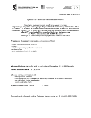 WOJEWÓDZTWO PODKARPACKIE Unia Europejska Europejski Fundusz Rozwoju Regionalnego Rzeszów, dnia 10.08.2011 r. Ogłoszenie o zamiarze udzielenia zamówienia W związku z ubieganiem się o dofinansowanie w ramach Regionalnego Programu Operacyjnego Województwa Podkarpackiego na lata 2007-2013 z Działania 1.1. Schemat B Bezpośrednie dotacje inwestycyjne, projektu pn.„Rozszerzenie działalności „DentAR” s .c. o nowe usługi stomatologiczne oraz integracja cyfrowa placówek” „DentAR” s. c. Agata Maksymowicz, Radosław Maksymowicz ul. Adama Mickiewicza 21, 35-064 Rzeszów informuje, że uruchamia procedurę wyłonienia dostawcy na zakup: Urządzenia do sedacji wziewnej o poniższej specyfikacji: -posiada automatyczną kontrolę przepływu. -reduktory -butlę tlenową oraz butlę z podtlenkiem w obudowie -zestaw maseczek -termin realizacji zamówienia do 30.08.2011 Miejsce składania ofert: „DentAR” s. c. ul. Adama Mickiewicza 21, 35-064 Rzeszów Termin składania ofert – 27.08.2011r. Złożona oferta powinna zawierać: • nazwę i adres oferenta, • opis nawiązujący do parametrów wyszczególnionych w zapytaniu ofertowym, • wartość oferty (netto oraz brutto), • termin ważności oferty, Kryterium wyboru ofert: - cena - 100 % Szczegółowych informacji udziela: Radosław Maksymowicz tel. 17 8534033, 606 570384