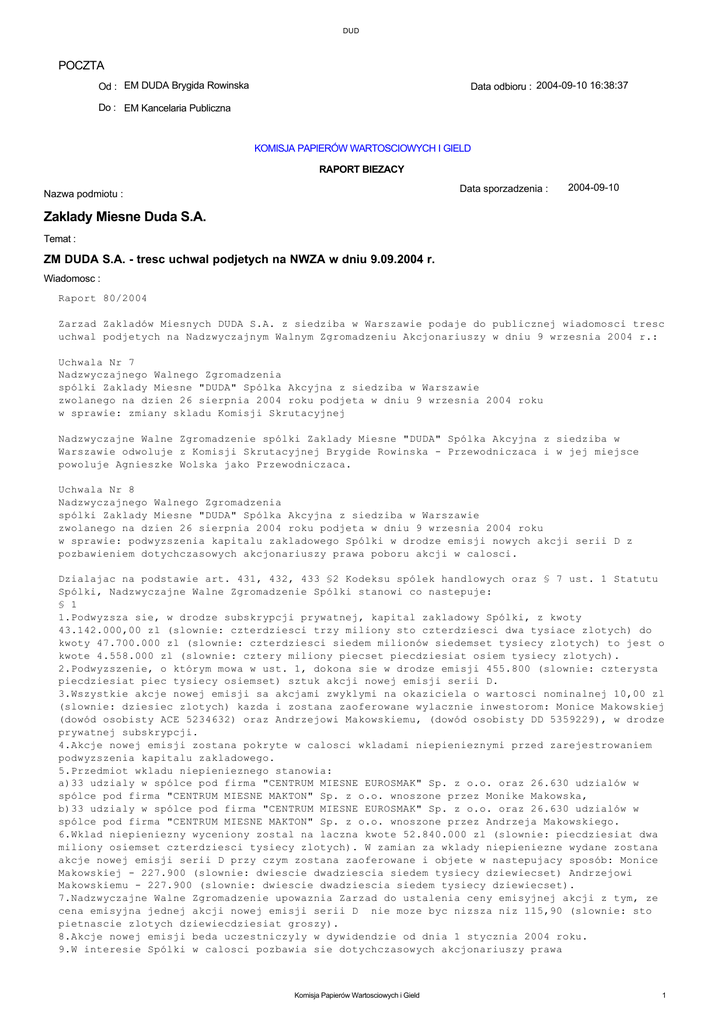 DUD POCZTA Od : EM DUDA Brygida Rowinska Data odbioru : 2004-09-10 16:38:37 Do : EM Kancelaria Publiczna KOMISJA PAPIERÓW WARTOSCIOWYCH I GIELD RAPORT BIEZACY Data sporzadzenia : Nazwa podmiotu : 2004-09-10 Zaklady Miesne Duda S.A. Temat : ZM DUDA S.A. - tresc uchwal podjetych na NWZA w dniu 9.09.2004 r. Wiadomosc : Raport 80/2004 Zarzad Zakladów Miesnych DUDA S.A. z siedziba w Warszawie podaje do publicznej wiadomosci tresc uchwal podjetych na Nadzwyczajnym Walnym Zgromadzeniu Akcjonariuszy w dniu 9 wrzesnia 2004 r.: Uchwala Nr 7 Nadzwyczajnego Walnego Zgromadzenia spólki Zaklady Miesne "DUDA" Spólka Akcyjna z siedziba w Warszawie zwolanego na dzien 26 sierpnia 2004 roku podjeta w dniu 9 wrzesnia 2004 roku w sprawie: zmiany skladu Komisji Skrutacyjnej Nadzwyczajne Walne Zgromadzenie spólki Zaklady Miesne "DUDA" Spólka Akcyjna z siedziba w Warszawie odwoluje z Komisji Skrutacyjnej Brygide Rowinska - Przewodniczaca i w jej miejsce powoluje Agnieszke Wolska jako Przewodniczaca. Uchwala Nr 8 Nadzwyczajnego Walnego Zgromadzenia spólki Zaklady Miesne "DUDA" Spólka Akcyjna z siedziba w Warszawie zwolanego na dzien 26 sierpnia 2004 roku podjeta w dniu 9 wrzesnia 2004 roku w sprawie: podwyzszenia kapitalu zakladowego Spólki w drodze emisji nowych akcji serii D z pozbawieniem dotychczasowych akcjonariuszy prawa poboru akcji w calosci. Dzialajac na podstawie art. 431, 432, 433 §2 Kodeksu spólek handlowych oraz § 7 ust. 1 Statutu Spólki, Nadzwyczajne Walne Zgromadzenie Spólki stanowi co nastepuje: § 1 1.Podwyzsza sie, w drodze subskrypcji prywatnej, kapital zakladowy Spólki, z kwoty 43.142.000,00 zl (slownie: czterdziesci trzy miliony sto czterdziesci dwa tysiace zlotych) do kwoty 47.700.000 zl (slownie: czterdziesci siedem milionów siedemset tysiecy zlotych) to jest o kwote 4.558.000 zl (slownie: cztery miliony piecset piecdziesiat osiem tysiecy zlotych). 2.Podwyzszenie, o którym mowa w ust. 1, dokona sie w drodze emisji 455.800 (slownie: czterysta piecdziesiat piec tysiecy osiemset) sztuk akcji nowej emisji serii D. 3.Wszystkie akcje nowej emisji sa akcjami zwyklymi na okaziciela o wartosci nominalnej 10,00 zl (slownie: dziesiec zlotych) kazda i zostana zaoferowane wylacznie inwestorom: Monice Makowskiej (dowód osobisty ACE 5234632) oraz Andrzejowi Makowskiemu, (dowód osobisty DD 5359229), w drodze prywatnej subskrypcji. 4.Akcje nowej emisji zostana pokryte w calosci wkladami niepienieznymi przed zarejestrowaniem podwyzszenia kapitalu zakladowego. 5.Przedmiot wkladu niepienieznego stanowia: a)33 udzialy w spólce pod firma "CENTRUM MIESNE EUROSMAK" Sp. z o.o. oraz 26.630 udzialów w spólce pod firma "CENTRUM MIESNE MAKTON" Sp. z o.o. wnoszone przez Monike Makowska, b)33 udzialy w spólce pod firma "CENTRUM MIESNE EUROSMAK" Sp. z o.o. oraz 26.630 udzialów w spólce pod firma "CENTRUM MIESNE MAKTON" Sp. z o.o. wnoszone przez Andrzeja Makowskiego. 6.Wklad niepieniezny wyceniony zostal na laczna kwote 52.840.000 zl (slownie: piecdziesiat dwa miliony osiemset czterdziesci tysiecy zlotych). W zamian za wklady niepieniezne wydane zostana akcje nowej emisji serii D przy czym zostana zaoferowane i objete w nastepujacy sposób: Monice Makowskiej - 227.900 (slownie: dwiescie dwadziescia siedem tysiecy dziewiecset) Andrzejowi Makowskiemu - 227.900 (slownie: dwiescie dwadziescia siedem tysiecy dziewiecset). 7.Nadzwyczajne Walne Zgromadzenie upowaznia Zarzad do ustalenia ceny emisyjnej akcji z tym, ze cena emisyjna jednej akcji nowej emisji serii D nie moze byc nizsza niz 115,90 (slownie: sto pietnascie zlotych dziewiecdziesiat groszy). 8.Akcje nowej emisji beda uczestniczyly w dywidendzie od dnia 1 stycznia 2004 roku. 9.W interesie Spólki w calosci pozbawia sie dotychczasowych akcjonariuszy prawa Komisja Papierów Wartosciowych i Gield 1 DUD pierwszenstwa objecia akcji nowej emisji serii D w stosunku do liczby posiadanych akcji (pozbawienie akcjonariuszy prawa poboru). Opinia Zarzadu Spólki uzasadniajaca pozbawienie dotychczasowych akcjonariuszy prawa poboru, stanowi zalacznik do niniejszej uchwaly. 10.Nadzwyczajne Walne Zgromadzenie upowaznia Zarzad do zawarcia umów o objecie 455.800 sztuk akcji nowej emisji serii D z Inwestorami okreslonymi w ust. 3. 11.Umowy, o których mowa w ust. 10 zawarte zostana w terminie nie pózniej niz do 30 czerwca 2005 r. 12.Nadzwyczajne Walne Zgromadzenie upowaznia Zarzad do okreslenia terminów skierowania oferty i jej przyjecia oraz dookreslenia warunków umów, o których mowa w ust. 10. § 2 W zwiazku z podwyzszeniem kapitalu zakladowego wprowadza sie nastepujace zmiany do Statutu Spólki: § 6. 1 w dotychczasowym brzmieniu: "§ 6.1. Kapital zakladowy wynosi 43.142.000,00 zl (czterdziesci trzy miliony sto czterdziesci dwa tysiace zlotych) i dzieli sie na 4.314.200 (cztery miliony trzysta czternascie tysiecy dwiescie) akcji zwyklych na okaziciela o wartosci nominalnej 10,- zl (dziesiec zlotych) kazda." otrzymuje brzmienie: "§ 6.1. Kapital zakladowy wynosi 47.700.000,00 zl (czterdziesci siedem milionów siedemset tysiecy zlotych) i dzieli sie na 4.770.000 (cztery miliony siedemset siedemdziesiat tysiecy) akcji zwyklych na okaziciela o wartosci nominalnej 10,- zl (dziesiec zlotych) kazda." § 3 Upowaznia sie Zarzad do podjecia wszelkich niezbednych czynnosci celem wprowadzenia akcji nowej emisji serii D do publicznego obrotu papierami wartosciowymi oraz obrotu gieldowego. § 4 Upowaznia sie Rade Nadzorcza do ustalenia tekstu jednolitego Statutu, uwzgledniajacego zmiany przyjete niniejsza uchwala. § 5 Uchwala wchodzi w zycie z dniem podjecia. Opinia Zarzadu Spólki uzasadniajaca pozbawienie dotychczasowych Akcjonariuszy prawa poboru akcji nowej emisji serii D. Podwyzszenie kapitalu zakladowego Spólki w drodze emisji nowych akcji serii D w oparciu o subskrypcje prywatna pozwoli na wniesienie do spólki Zaklady Miesne "DUDA" S.A. aportu w postaci udzialów spólki "Centrum Miesne MAKTON" Sp. z o.o. i "Centrum Miesne EUROSMAK" Sp. z o.o. Umozliwi to Sp