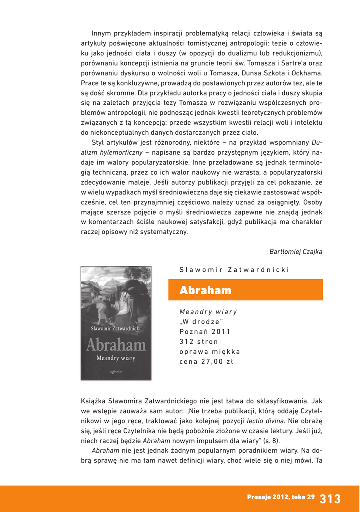 Innym przykładem inspiracji problematyką relacji człowieka i świata są artykuły poświęcone aktualności tomistycznej antropologii: tezie o człowieku jako jedności ciała i duszy (w opozycji do dualizmu lub redukcjonizmu), porównaniu koncepcji istnienia na gruncie teorii św. Tomasza i Sartre’a oraz porównaniu dyskursu o wolności woli u Tomasza, Dunsa Szkota i Ockhama. Prace te są konkluzywne, prowadzą do postawionych przez autorów tez, ale te są dość skromne. Dla przykładu autorka pracy o jedności ciała i duszy skupia się na zaletach przyjęcia tezy Tomasza w rozwiązaniu współczesnych problemów antropologii, nie podnosząc jednak kwestii teoretycznych problemów związanych z tą koncepcją: przede wszystkim kwestii relacji woli i intelektu do niekonceptualnych danych dostarczanych przez ciało. Styl artykułów jest różnorodny, niektóre − na przykład wspomniany Dualizm hylemorficzny − napisane są bardzo przystępnym językiem, który nadaje im walory popularyzatorskie. Inne przeładowane są jednak terminologią techniczną, przez co ich walor naukowy nie wzrasta, a popularyzatorski zdecydowanie maleje. Jeśli autorzy publikacji przyjęli za cel pokazanie, że w wielu wypadkach myśl średniowieczna daje się ciekawie zastosować współcześnie, cel ten przynajmniej częściowo należy uznać za osiągnięty. Osoby mające szersze pojęcie o myśli średniowiecza zapewne nie znajdą jednak w komentarzach ściśle naukowej satysfakcji, gdyż publikacja ma charakter raczej opisowy niż systematyczny. Bartłomiej Czajka Sławomir Zatwardnicki Abraham Meandry wiary „W d r o d z e ” Poznań 2011 312 stron oprawa miękka cena 27,00 zł Książka Sławomira Zatwardnickiego nie jest łatwa do sklasyfikowania. Jak we wstępie zauważa sam autor: „Nie trzeba publikacji, którą oddaję Czytelnikowi w jego ręce, traktować jako kolejnej pozycji lectio divina. Nie obrażę się, jeśli ręce Czytelnika nie będą pobożnie złożone w czasie lektury. Jeśli już, niech raczej będzie Abraham nowym impulsem dla wiary” (s. 8). Abraham nie jest jednak żadnym popularnym poradnikiem wiary. Na dobrą sprawę nie ma tam nawet definicji wiary, choć wiele się o niej mówi. Ta Pressje 2012, teka 29 313 książka jest przede wszystkim zaproszeniem do przemyślenia historii „ojca wszystkich wierzących”, jak pisał o Abrahamie św. Paweł. Nie rozwiewa wątpliwości, raczej je wzbudza poprzez stawianie niewygodnych pytań. Zatwardnicki swoje medytacje nad patriarchą oparł na kilku filarach. Pierwszym i najważniejszym są kolejne fragmenty Księgi Rodzaju odnoszące się do Abrahama oraz związane z nimi teksty z Nowego Testamentu, następnym − komentarze patrystyczne i żydowskie, kolejnym − fragmenty Tryptyku Rzymskiego Jana Pawła II, ostatnim − refleksje samego autora. Pomysł jest tu dość prosty i klarowny: przyglądając się kolejnym etapom rozwoju wiary Abrahama, który trwał przez całe jego życie, mamy spróbować uświadomić sobie, jakie konsekwencje może mieć decyzja o uwierzeniu w Boga i Bogu. Życie Abrahama od chwili spotkania z Bogiem totalnie się zmieniło. Wbrew pozorom wcale nie stało się prostsze i przyjemniejsze. Abraham niejednokrotnie popełniał błędy, a Bóg ze swej strony nie wahał się wystawiać go na próby. Pierwszą z nich było wezwanie do opuszczenia Charanu, do którego to W kontekście tej skandalicznej opowieści Zatwardnicki stawia przenikliwe i trudne pytania Abraham dotarł wraz z ojcem. W tym czasie był on już dobrze sytuowanym człowiekiem, o określonej pozycji i statusie materialnym. Jednakże, zgodnie z etymologią nazwy „Charan”, tkwił na „rozdrożu”, skąd „głos Boży wzywa go do pójścia dalej” (s. 28). Abraham dowiedział się, że aby wielkie obietnice Boga względem niego mogły się spełnić, musi porzucić dotychczasowe życie, stabilizację i udać się gdzieś w nieznane. Ciekawe, że większość Bożych obietnic dotyczyło szczęśliwości nie samego Abrahama, ale jego potomstwa. Jak trafnie zauważa Zatwardnicki: „Dla ludzi tamtej kultury zapowiedź licznego potomstwa stanowiła obietnicę najlepszą z możliwych; […] potrafili czerpać niekłamaną radość z faktu, że nie oni sami, ale ich potomkowie odziedziczą błogosławieństwo” (s. 30). Już tu, na samym początku historii rozwoju swojej wiary, Abraham wykazał się niebywałą odwagą i radykalizmem. Parafrazując słowa pewnego filozofa, nie ma płytkiego wejścia do basenu wiary. Dalej towarzyszymy Abrahamowi w kolejnych próbach wiary, których w sumie przeżył dziesięć. Kulminacyjnym punktem jego historii, a tym samym książki, jest oczywiście 22 rozdział Księgi Rodzaju, w którym opisana jest wyprawa Abrahama do góry Moria, gdzie miał złożyć w ofierze swego syna Izaaka. W kontekście tej skandalicznej opowieści starotestamentowej Zatwardnicki stawia przenikliwe i trudne pytania. Zazwyczaj oskarża się tu Boga o okrucieństwo. Ale z uwagi na to zdarzenie i decyzje, które wtedy podjął, Abraham jest nazywany ojcem wierzących. W końcu „pytanie o to, czy Bóg mógłby żądać takiej ofiary, można by odwrócić: czy jest coś, czego Bóg miałby od nas (ode mnie, od ciebie) nie otrzymać, gdyby tego zażądał? Ograniczamy żądania Boga do tych, które wydają się nam uzasadnione. Wiemy, że to właśnie Abraham podobał się Bogu, wiemy, że jego wiarę powinniśmy naślado- 314 Kompressje wać, a jednak nie potrafimy (nie chcemy?) utożsamiać się z wiarą Abrahama” (s. 245). Jak widać, Abraham nie należy do najłagodniejszych nauczycieli. Zatwardnicki konsekwentnie trzyma się obranej na wstępie metody dokładnego opisywania kolejnych fragmentów z Genesis, sprawnie operuje komentarzami Ojców Kościoła, co więcej, udaje mu się uniknąć kaznodziejskiego tonu. Choć trzeba przyznać, że stylistyka momentami razi (jak na przykład w nieuzasadnionym stosowaniu c