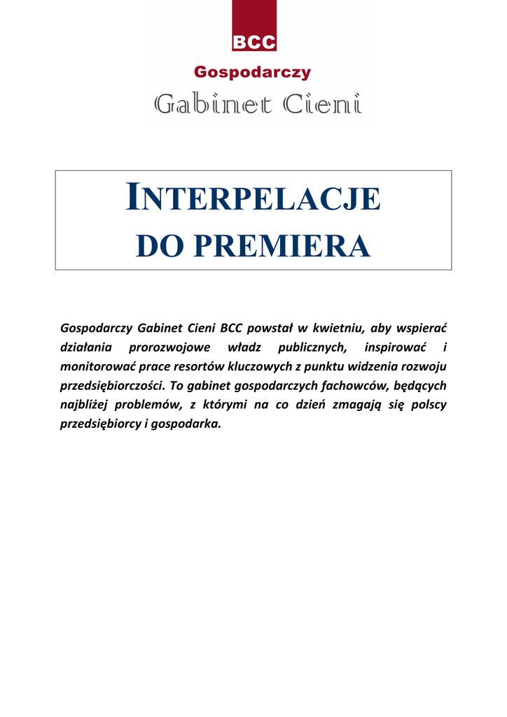 INTERPELACJE DO PREMIERA Gospodarczy Gabinet Cieni BCC powstał w kwietniu, aby wspierać działania prorozwojowe władz publicznych, inspirować i monitorować prace resortów kluczowych z punktu widzenia rozwoju przedsiębiorczości. To gabinet gospodarczych fachowców, będących najbliżej problemów, z którymi na co dzień zmagają się polscy przedsiębiorcy i gospodarka. Warszawa, 12 września 2012 r. Szanowny Pan Prezes Rady Ministrów Donald Tusk Szanowny Panie Premierze, MAREK GOLISZEWSKI przewodniczący Gospodarczego Gabinetu Cieni BCC W związku z zapowiedzią Pana kolejnego expose i przedstawienia propozycji działań, które mają uchronić kraj przed coraz bardziej wyraźnym spowolnieniem gospodarczym oraz naprawić te obszary Państwa, które nie funkcjonują w należyty sposób, spodziewalibyśmy się usłyszeć: 1. Czy planowana jest kampania edukacyjna rządu skierowana do obywateli w kwestii niezbędnych i radykalnych reform w takich obszarach jak finanse publiczne, ochrona zdrowia i szkolnictwo? 2. Czy i kiedy rząd zamierza rozpocząć debatę publiczną o przyszłości UE i miejscu Polski w jej strukturach? Oczekiwalibyśmy także odpowiedzi w expose na następujące pytania: 2 PROF. STANISŁAW GOMUŁKA minister finansów Gospodarczego Gabinetu Cieni BCC ℡ 609 556 506 [email protected] Kluczowe pytania na teraz, szczególnie w kontekście budżetu państwa na 2013 r. i oczekiwanego wystąpienia premiera D. Tuska, są następujące: 3. Czy spowolnienie wzrostu będzie kontynuowane w 2013 r. i jakiego wzrostu (spadku) PKB oczekiwać? 4. Czy zostanie zrealizowana obietnica obniżenia deficytu sektora finansów publicznych do 3% PKB w roku bieżącym i dalszego obniżania tego deficytu, aż do 1% PKB w roku 2015, czy ta obietnica z expose, z listopada ub. r., wymaga korekty? 5. Jeśli nie wymaga korekty ścieżka zmniejszania deficytu, to jak rząd proponuje urealnić sposoby utrzymania finansów publicznych na takiej ścieżce? 6. Czy zgodnie z deklaracjami wyborczymi rynkowy dług publiczny Polski zostanie obniżony do 47% PKB w 2015 r.? 7. Czy zapowiedziane przez rząd rok temu dość drastyczne zmniejszenie inwestycji publicznych w roku przyszłym i w latach 2014 – 2015, to właściwa polityka w sytuacji tak dużego spowolnienia wzrostu, może nawet niewielkiej recesji? 8. Kiedy minister finansów zacznie informować o wielkości nowego, nierynkowego długu publicznego, jaki powstaje w ZUS-ie po przejęciu przez budżet części składki emerytalnej 3 przesyłanej do niedawna do OFE? Jaka jest przewidywana wielkość tego długu na koniec 2015 roku? 9. Czy w 2014 r. nastąpi obniżenie najwyższej stawki VAT-u, zgodnie z obietnicą złożoną w kwietniu br. przez ministra finansów? 10. Czy zostaną zwiększone podatki CIT i PIT w latach 2013-2014? 11. Czy budowany jest terminarz wejścia Polski do strefy euro? 12. Czy i kiedy nastąpi odblokowanie progów podatkowych, które to blokowanie dziś de facto zwiększa podatki PIT? Pytania zmierzają do uzyskania wyraźnej deklaracji ze strony rządu, iż nadal zamierza zmniejszać naszą zależność od rynków finansowych poprzez zmniejszanie deficytu sektora finansów publicznych, ale również, że zamierza ten deklarowany przez rząd i popierany przez BCC cel osiągnąć, metodami innymi niż wzrost obciążeń podatkowych oraz manipulacje statystyczne. 4 DR WOJCIECH NAGEL minister ds. ubezpieczeń społecznych Gospodarczego Gabinetu Cieni BCC ℡ 601 329 181 [email protected] 13. Czy nastąpi zmiana zasad waloryzacji rent i emerytur, poprzez zmianę jej mechanizmu z cenowo-płacowej na cenową w sytuacji, gdy inflacja nie przekroczy 5%? Obecnie waloryzacja świadczeń uwzględnia poziom inflacji oraz udział w realnym przyroście wynagrodzeń na poziomie 20%. Kwota waloryzacji wyniesie w kolejnym roku 7,1 mld zł. W okresie kryzysu oraz trudności w sfinansowaniu FUS należy rozważyć ograniczenie waloryzacji do wysokości inflacji. 14. Pracodawcy opłacają składkę na fundusz rentowy w wysokości 6,5% wynagrodzeń brutto, a pracownicy odpowiednio - 1,5 proc. Czy planowane jest podniesienie składki rentowej dla pracowników? Kiedy rząd dostosuje system rentowy do emerytalnego po reformie, co pozwoli na oszczędności w wypłatach i zmniejszenie deficytu funduszu? Od lutego br. obowiązuje regulacja podwyższająca składkę rentową po stronie pracodawcy o 2% podstawy wymiaru (wynagrodzenia brutto). Osiągnęła ona łącznie 6,5%, co jest maximum ustawowym. Aby uniknąć podniesienia składki po stronie pracownika, należy pilnie dostosować system rentowy do mechanizmu zdefiniowanej składki, który obowiązuje w systemie emerytalnym. Pozwoli to na obniżenie niedoboru w funduszu rentowym, który wynosi blisko 18 mld zł rocznie. 15. Kiedy osoby prowadzące gospodarstwa rolne zostaną objęte powszechnym podatkiem dochodowym, zgodnie z zapowiedziami z expose premiera z 18 listopada 2011 r.? Czy od 2013 r. rolników będą obowiązywały zasady rachunkowości? Bez wprowadzenia zasad rachunkowości do gospodarstw rolnych prowadzących działalność wytwórczą nie jest możliwe wprowadzenie powszechnego systemu podatku 5 dochodowego w rolnictwie. Zgodnie z expose, miało to nastąpić w 2013 r., jednakże termin ten zapewne nie zostanie dotrzymany. Premier powinien wskazać ew. osoby winne tej sytuacji i przedstawić konkretny harmonogram wdrożenia zmian. 16. Kiedy zostaną przedstawione zmiany w zasadach i organizacji ubezpieczeń rolniczych i od kiedy zaczną obowiązywać? Zmiany te są przygotowywane przez zespół działający w Kancelarii Premiera powołany w 2008 roku. Niestety nie są znane efekty ich prac. Powinny one zmierzać w kierunku wydzielenia w systemie części zaopatrzeniowej i ubezpieczeniowej, która będzie powiązana z poziomem dochodu do opodatkowania i wysokością opłacanej składki. 17. Czy i kiedy rząd zamierza wdrożyć zmiany w systemie emerytalnym górników oraz kontyn