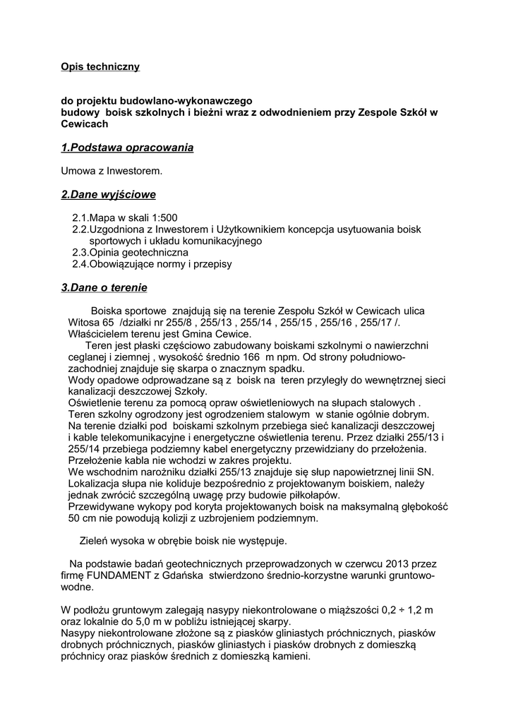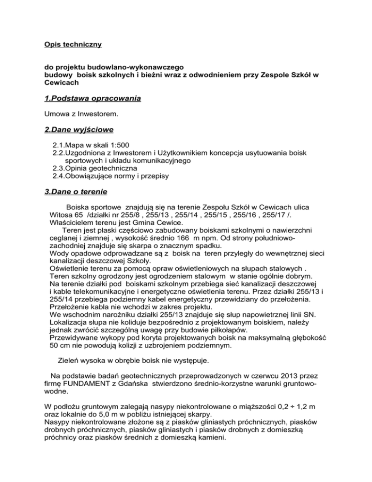 Opis techniczny do projektu budowlano-wykonawczego budowy boisk szkolnych i bieżni wraz z odwodnieniem przy Zespole Szkół w Cewicach 1.Podstawa opracowania Umowa z Inwestorem. 2.Dane wyjściowe 2.1.Mapa w skali 1:500 2.2.Uzgodniona z Inwestorem i Użytkownikiem koncepcja usytuowania boisk sportowych i układu komunikacyjnego 2.3.Opinia geotechniczna 2.4.Obowiązujące normy i przepisy 3.Dane o terenie Boiska sportowe znajdują się na terenie Zespołu Szkół w Cewicach ulica Witosa 65 /działki nr 255/8 , 255/13 , 255/14 , 255/15 , 255/16 , 255/17 /. Właścicielem terenu jest Gmina Cewice. Teren jest płaski częściowo zabudowany boiskami szkolnymi o nawierzchni ceglanej i ziemnej , wysokość średnio 166 m npm. Od strony południowozachodniej znajduje się skarpa o znacznym spadku. Wody opadowe odprowadzane są z boisk na teren przyległy do wewnętrznej sieci kanalizacji deszczowej Szkoły. Oświetlenie terenu za pomocą opraw oświetleniowych na słupach stalowych . Teren szkolny ogrodzony jest ogrodzeniem stalowym w stanie ogólnie dobrym. Na terenie działki pod boiskami szkolnym przebiega sieć kanalizacji deszczowej i kable telekomunikacyjne i energetyczne oświetlenia terenu. Przez działki 255/13 i 255/14 przebiega podziemny kabel energetyczny przewidziany do przełożenia. Przełożenie kabla nie wchodzi w zakres projektu. We wschodnim narożniku działki 255/13 znajduje się słup napowietrznej linii SN. Lokalizacja słupa nie koliduje bezpośrednio z projektowanym boiskiem, należy jednak zwrócić szczególną uwagę przy budowie piłkołapów. Przewidywane wykopy pod koryta projektowanych boisk na maksymalną głębokość 50 cm nie powodują kolizji z uzbrojeniem podziemnym. Zieleń wysoka w obrębie boisk nie występuje. Na podstawie badań geotechnicznych przeprowadzonych w czerwcu 2013 przez firmę FUNDAMENT z Gdańska stwierdzono średnio-korzystne warunki gruntowowodne. W podłożu gruntowym zalegają nasypy niekontrolowane o miąższości 0,2 ÷ 1,2 m oraz lokalnie do 5,0 m w pobliżu istniejącej skarpy. Nasypy niekontrolowane złożone są z piasków gliniastych próchnicznych, piasków drobnych próchnicznych, piasków gliniastych i piasków drobnych z domieszką próchnicy oraz piasków średnich z domieszką kamieni. Poniżej w podłożu gruntowym projektowanych obiektów sportowych zalegają piaski gliniaste, piaski drobne i piaski średnie. Wody gruntowej do głębokości 5,0 m p.p.t., tj. do rzędnej 160 m n.p.m. nie stwierdzono Obiekt zaliczono do I kategorii geotechnicznej. 4.Rozwiązania techniczne. 4.1.Założenia ogólne Projektuje się budowę boiska do piłki nożnej o nawierzchni typu „sztuczna trawa”, boiska uniwersalnego o nawierzchni poliuretanowej, skoczni w dal i bieżni do biegu na 100 m oraz boisko do piłki siatkowej plażowej i rzutnię kulą. Dojścia do boisk zapewnią odpowiednio zaprojektowane chodniki. Boiska będą odwodnione i zostaną wyposażone w odpowiednie urządzenia sportowe. Brak barier architektonicznych umożliwia korzystania z boisk przez osoby niepełnosprawne. 4.2.Makroniwelacja, rozbiórki Prace budowlane należy rozpocząć od rozebrania starej nawierzchni z płyt betonowych, nawierzchni ceglastej. Zlikwidować istniejące 2 wpusty deszczowe żeliwne, 2 szt studzienek rewizyjnych kanalizacji deszczowej oraz 2 słupy oświetleniowe. Materiały z rozbiórki nadające się do ponownego wykorzystania złożyć w miejscu wskazanym przez Inwestora, pozostały gruz wywieźć i utylizować na koncesjonowanym wysypisku lub przekazać wyspecjalizowanym firmom do recyklingu. Rozebrać należy istniejące ogrodzenie z siatki stalowej wewnątrz obiektu oraz rzutnię kulą. Kable energetyczne rozebranego oświetlenia zabezpieczyć i pozostawić w ziemi. Prace ziemne rozpocząć od zdjęcia z istniejącego boiska piłkarskiego warstwy ziemi urodzajnej gr 10 cm i złożenie jej poza terenem budowy do wykorzystania przy budowie docelowych trawników. Następnie wykonać wykopy mechanicznie na średnią głębokość 40 cm. Urobek z wykopów wywieźć w miejsce wskazane przez Inwestora. Koryto boisk zagęścić do Is=1,0. 4.3. Rozwiązania techniczne boisk 4.3.1.Boisko uniwersalne do gry w koszykówkę , siatkówkę , tenisa ziemnego i piłkę ręczną. Wymiary boiska 42x22 m PODBUDOWA. Koryto zagęścić do wartości Is=1,0. Na tak przygotowanym podłożu wykonać warstwę odsączającą z piasku grubości 30 cm i podbudowę z kruszywa łamanego frakcji 0-31,5mm grubości 15 cm. Podbudowę zagęścić do uzyskania wartości wtórnego modułu odkształcenia minimum 140 Mpa. Projektowane kruszywa pełnić będą funkcję warstwy odsączającej przejmującej przez przepuszczalne nawierzchnie boisk nadmiar wód opadowych i umożliwiający dalszą infiltrację wody do gruntu. Piasek na warstwę odsączającą musi spełniać następujące wymagania: 1/wskaźnik współczynnika wodoprzepuszczalności K10>8m/dobę 2)wskaźnik szczelności, określony zależnością: D 15 d 85 ≤ 5 gdzie: D15 - wymiar sita, przez które przechodzi 15% ziarn warstwy odcinającej lub odsączającej d85 - wymiar sita, przez które przechodzi 85% ziarn gruntu podłoża. b) wskaźnik zagęszczalności, określony zależnością: U = d 60 d 10 ≥ 5 gdzie: U - wskaźnik różnoziarnistości, d60 - wymiar sita, przez które przechodzi 60% kruszywa tworzącego warstwę odcinającą, d10 - wymiar sita, przez które przechodzi 10% kruszywa tworzącego warstwę odcinającą. Podbudowę należy oddzielić od pozostałych elementów terenu za pomocą obrzeży betonowych 100x30x8cm ustawianych na ławie betonowej z betonu B15 . Na powierzchni boiska należy wyprofilować spadek o wartości 0,5%. NAWIERZCHNIA Zaprojektowano nawierzchnię sportową, dwuwarstwową poliuretanowo-gumową o grubości warstwy min.16 mm typu EPDM Nawierzchnia składa się z warstwy górnej (gr. min.8mm) wykonanej z kolorowego granulatu EPDM o granulacji 1-4 mm oraz warstwy dolnej (gr. min