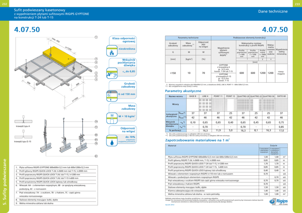 232 233 Sufit podwieszany kasetonowy Dane techniczne z wypełnieniem płytami sufitowymi RIGIPS GYPTONE na konstrukcji T-24 lub T-15 4.07.50 4.07.50 ma x. 5 40 0 x= 12 Parametry techniczne Klasa odporności ogniowej Masa **) zabudowy Grubość zabudowy nieokreślona 00 9 Wskaźnik pochłaniania dźwięku 8 1 Odporność płyt na wilgoć G M W [mm] [kg/m2] [%] 10 ł150 70 3 4 60 0 Grubość zabudowy 0 60 Maksymalny rozstaw konstrukcji z profili RIGIPS Wypełnienie płytami sufitowymi *) RIGIPS Maksymalny rozstaw Wypełnienie Profile Profile Profile wełną wiepoprzeczne poprzeczne nośne l = 600 l = 1200 l = 3600 szaków mineralną mm mm mm l y x [mm] a w do 0,85 2 Podstawowe elementy konstrukcji GYPTONE z krawędzią A gr. 12,5 mm konstr. T-24 lub T-15 600 GYPTONE z krawędzią E-15 gr. 12,5 mm konstr. T-15 600 niewymagane 1200 1200 *) Wymiary wszystkich rodzajów płyt 600x600x12,5 mm, a dodatkowo BASE, LINE 4, POINT 11 - 600x1200x12,5 mm. **) Bez uwzględnienia masy izolacji z wełny. Parametry akustyczne G od 150 mm G 0 12 y= Nazwa wzoru 0 D M~ ~ 10 kg/m2 7A krawędź typu A 7C Odporność na wilgoć 6B do 70% 6A krawędź typu E-15 wilgotności względnej powietrza LINE 4 POINT 11 POINT 12 37 37 37 25 37 25 25 37 42 46 46 42 46 42 42 46 0,10 0,65 0,65 0,40 0,65 0,45 0,65 0,75 - 0,70 16,3 11,9 5,0 0,70 16,3 8,1 16,3 0,85 17,0 SIXTO 60 QUATTRO 20 QUATTRO 22 QUATTRO 50 Wzory Masa zabudowy M BASE 8 *) NCW Izolacyjność akustyczna D NCW**) Wskaźnik a w*) pochłaniania dźwięku a w**) % perforacji *) **) Dla sufitu podwieszanego w odległości 200 mm od stropu. Dla sufitu podwieszanego z 100 mm wełną mineralną w odległości 200 mm od stropu. Zapotrzebowanie materiałowe na 1 m 2 7B Zużycie Materiał Z wieszakiem Z wieszakiem z elementem z podwójnym rozprężnym elementem rozprężnym 5. Sufity podwieszane 6C Płyta sufitowa RIGIPS GYPTONE 600x600x12,5 mm lub 600x1200x12,5 mm 1,00 1,00 m2 Profil główny RIGIPS T-24; l=3600 mm, T-15; l=3000 mm 0,85 0,85 m Profil poprzeczny RIGIPS QUICK-LOCK T-24 lub T-15, l=1200 mm 1,70 1,70 m Profil poprzeczny RIGIPS QUICK-LOCK T-24 lub T-15, l=600 mm 0,85 0,85 m 2. Profil główny RIGIPS QUICK-LOCK T-24; l=3600 mm lub T-15, l=3000 mm Profil przyścienny RIGIPS QUICK-LOCK kątowy lub schodkowy 0,40 0,40 m 3. Profil poprzeczny RIGIPS QUICK-LOCK T-24; lub T-15, l=1200 mm Wieszak z elementem rozprężnym RIGIPS l=110 mm lub z noniuszem 0,70 - szt. 4. Profil poprzeczny RIGIPS QUICK-LOCK T-24; lub T-15 l=600 mm Wieszak z podwójnym elementem rozprężnym RIGIPS - 0,70 szt. 5. Profil przyścienny RIGIPS QUICK-LOCK kątowy lub schodkowy Pręt wieszakowy z oczkiem RIGIPS lub część górna wieszaka noniuszowego 0,70 0,70 szt. Pręt wieszakowy z hakiem RIGIPS 0,70 - szt. Stalowe elementy mocujące: kołki, dyble 1,50 1,50 szt. Klamra zabezpieczająca do wieszaków 1,40 1,40 szt. Wełna mineralna szklana lub skalna - w razie potrzeby 1,00 1,00 m2 1. Płyta sufitowa RIGIPS GYPTONE 600x600x12,5 mm lub 600x1200x12,5 mm 6. Wieszak: 6A - z elementem rozprężnym, 6B - ze sprężyną wieszakową podwójną, 6C - z noniuszem 7. Pręt wieszakowy: 7A - z oczkiem, 7B - z hakiem, 7C - część górna wieszaka noniuszowego 8. Stalowe elementy mocujące: kołki, dyble 9. Wełna mineralna szklana lub skalna Nakłady materiałowe mają charakter przybliżony i nie zawierają odpadów. Uwaga: Do mocowania do konstrukcji budynku wieszaków i uchwytów oraz profili przyściennych powinny być stosowane stalowe łączniki mechaniczne określone w dokumentacji technicznej opracowanej dla danego obiektu. styczeń 2012
