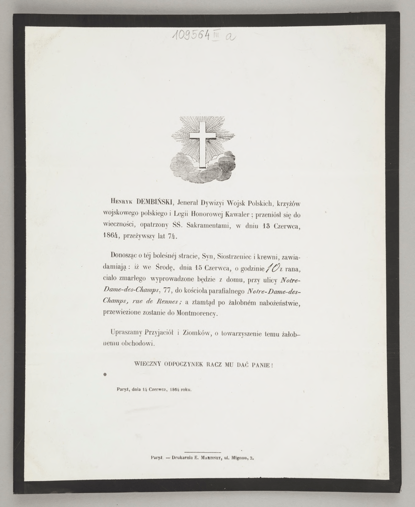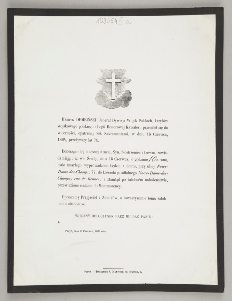 . H en ryk )' 4; ' DEMBIŃSKI, Jenerał Dywizyi Wojsk Polskich, krzyżów wojskowego polskiego i Legii Honorowej Kawaler ; przeniósł się do wieczności, opatrzony ŚŚ. Sakramentami, w dniu 13 Czerwca, 1864, przeżywszy lat 7/i. Donosząc o tej bolesnej stracie, Syn, Siostrzeniec i krewni, zawia damiają : iż we Środę, dnia 15 Czerwca, o g o d z i n i e r a n a , ciało zmarłego wyprowadzone będzie z domu, przy ulicy Notre- Dame-des-Champs, 77, do kościoła parafialnego Nofre-Dame-desChampsj rue de Rennes; a ztamtąd po żałobnym nabożeństwie, przewiezione zostanie do Montmorency. Upraszamy Przyjaciół i Ziomków, o towarzyszenie temu żałob nemu obchodowi. W IECZNY ODPOCZYNEK RACZ MU DAĆ P A N IE ! Paryż, dnia 14 Czerwca, 1864 roku P a ry ż . — D r u k a r n ia E» M a h tin et * u l, M ig n o n , 2.