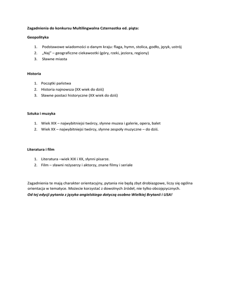 Zagadnienia do konkursu Multilingwalna Czternastka ed. piąta: Geopolityka 1. Podstawowe wiadomości o danym kraju: flaga, hymn, stolica, godło, język, ustrój 2. „Naj” – geograficzne ciekawostki (góry, rzeki, jeziora, regiony) 3. Sławne miasta Historia 1. Początki państwa 2. Historia najnowsza (XX wiek do dziś) 3. Sławne postaci historyczne (XX wiek do dziś) Sztuka i muzyka 1. Wiek XIX – najwybitniejsi twórcy, słynne muzea i galerie, opera, balet 2. Wiek XX – najwybitniejsi twórcy, słynne zespoły muzyczne – do dziś. Literatura i film 1. Literatura –wiek XIX i XX, słynni pisarze. 2. Film – sławni reżyserzy i aktorzy, znane filmy i seriale Zagadnienia te mają charakter orientacyjny, pytania nie będą zbyt drobiazgowe, liczy się ogólna orientacja w tematyce. Możecie korzystać z dowolnych źródeł, nie tylko obcojęzycznych. Od tej edycji pytania z języka angielskiego dotyczą osobno Wielkiej Brytanii i USA!
